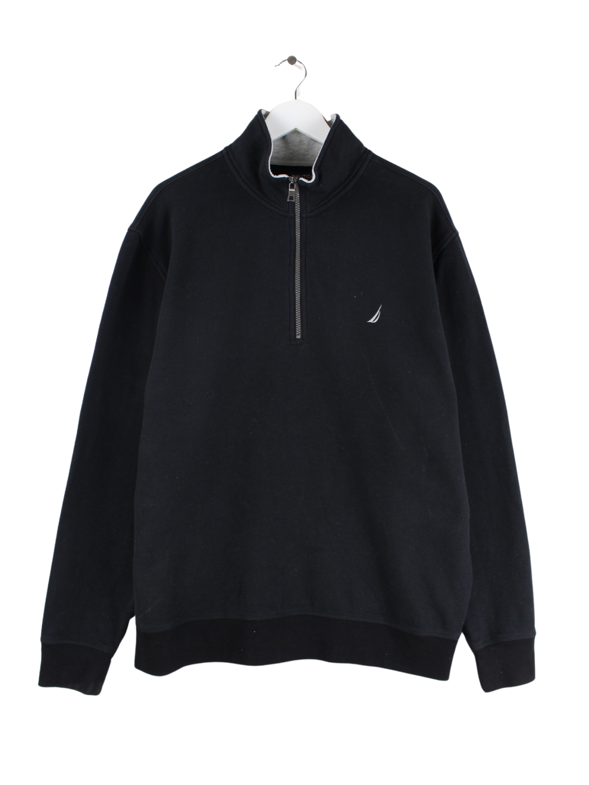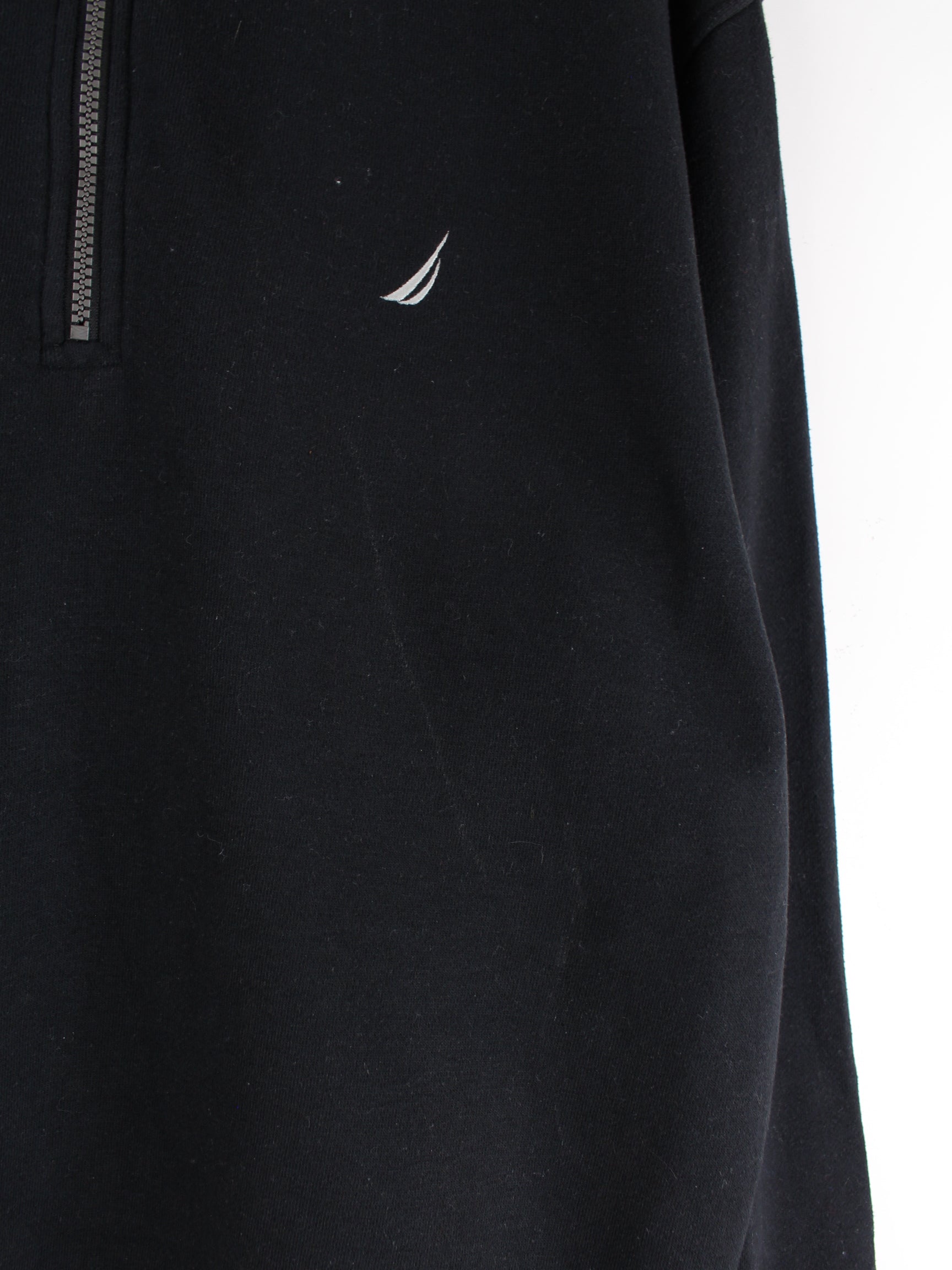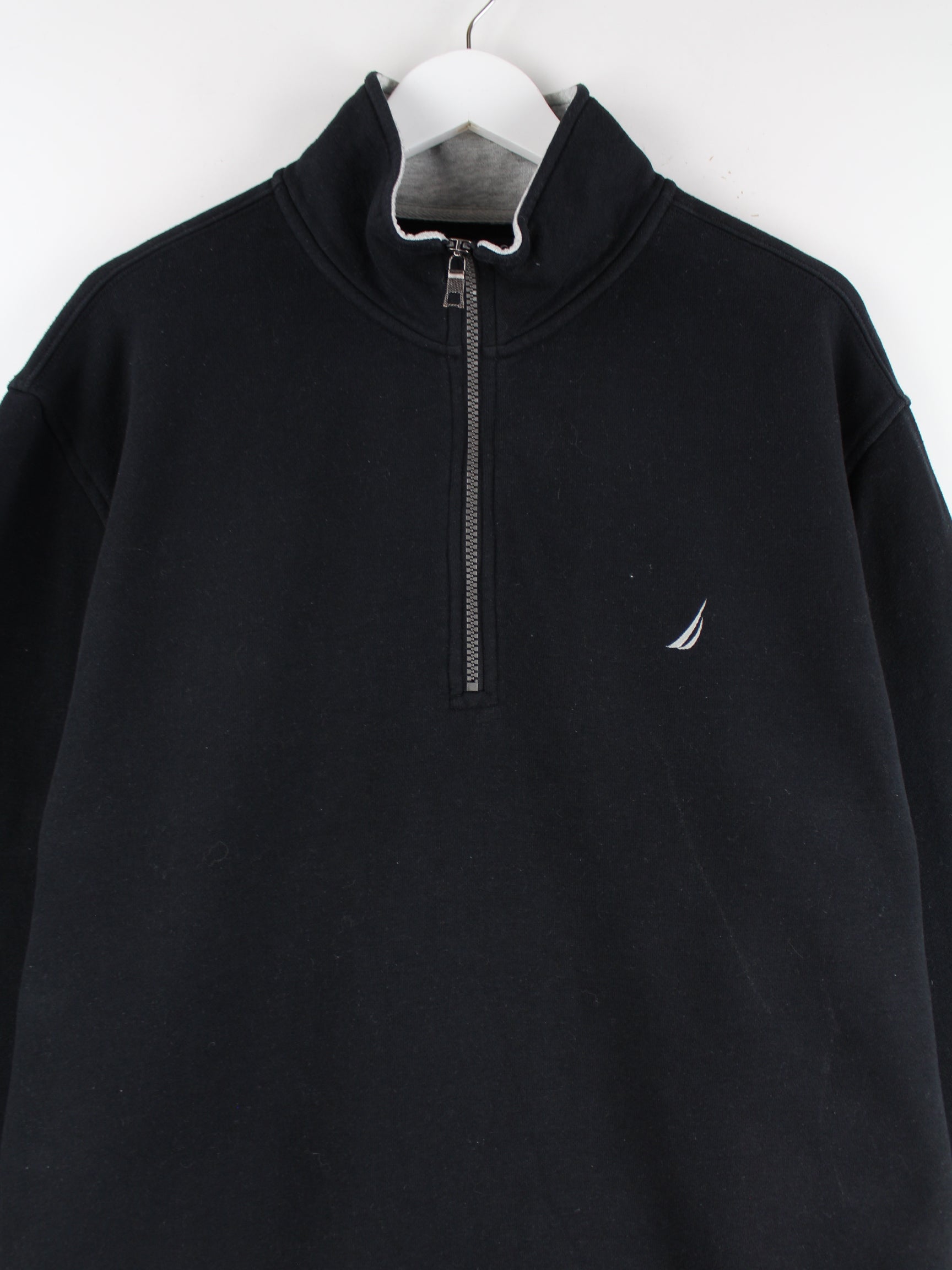 Sweater vom Label Nautica mit kurzem Reißverschluß in Größe XL. Sie ist aus einer Baumwollmischung gefertigt und in Schwarz in Stock.