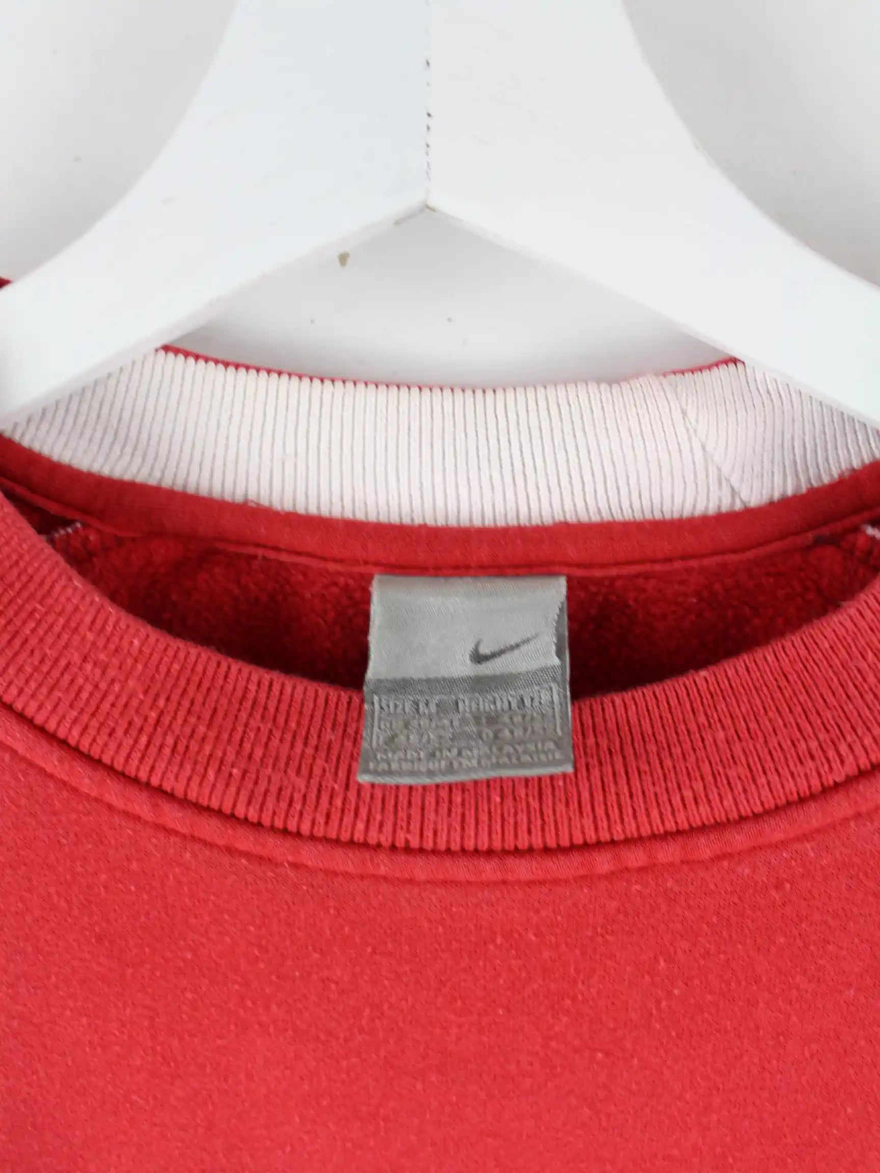 Roter Sweater mit gestickten Motiven der Brand Nike in Größe M. Er ist aus einer Baumwollmischung angefertigt und in sehr gutem Zustand bei uns vorrätig.