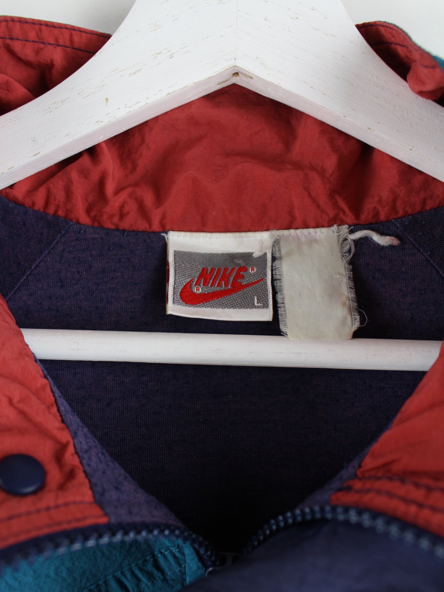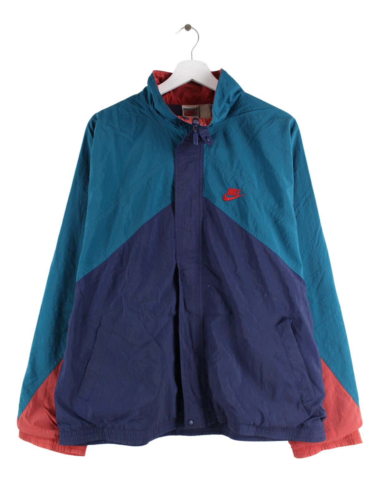 Blaue Trainingsjacke der Marke Nike aus den 80'ern in Größe L. Sie ist aus Synthetik angefertigt. Den Zustand würden wir als 'In Ordnung' bezeichnen (vergl. Bilder).