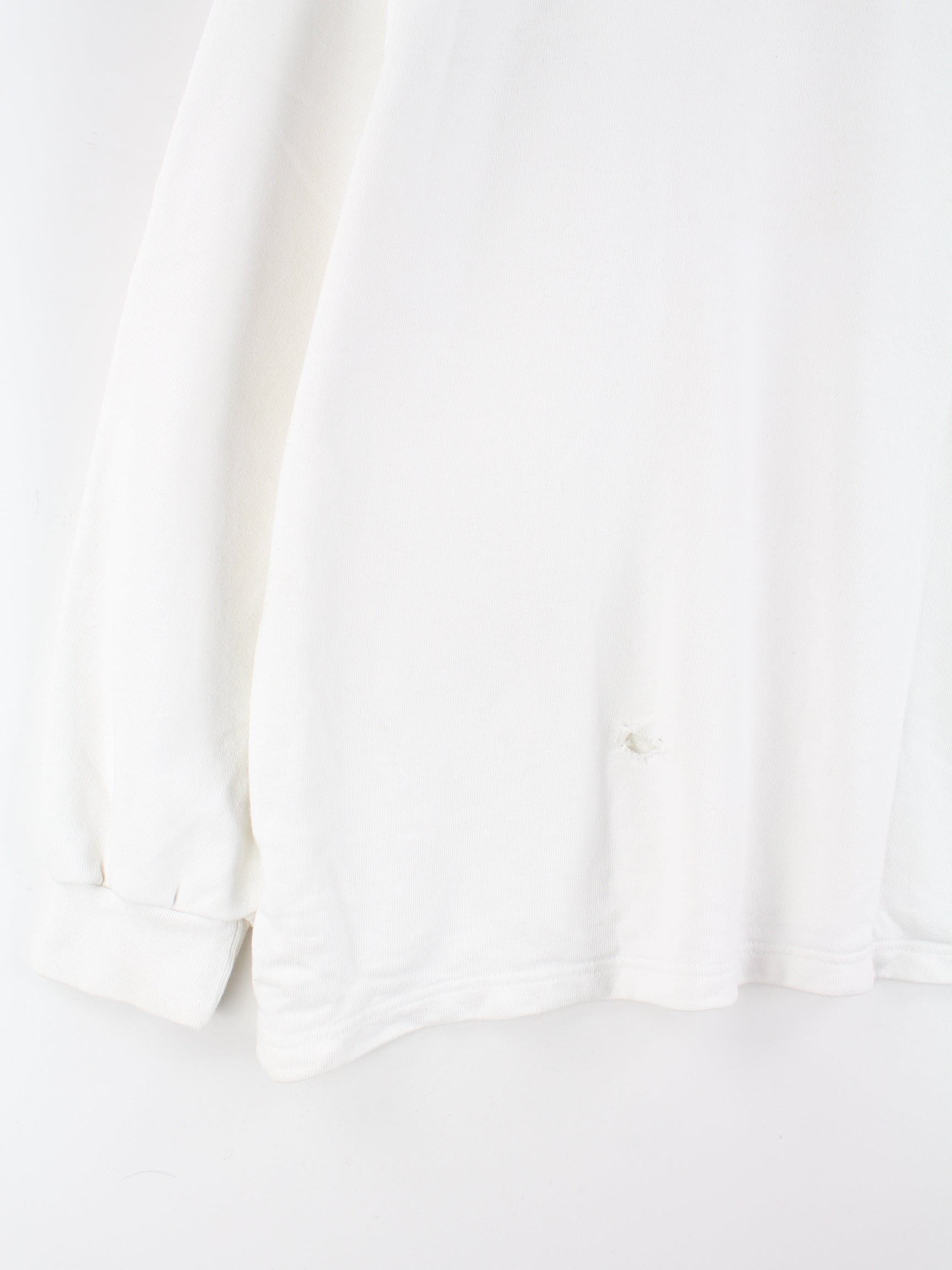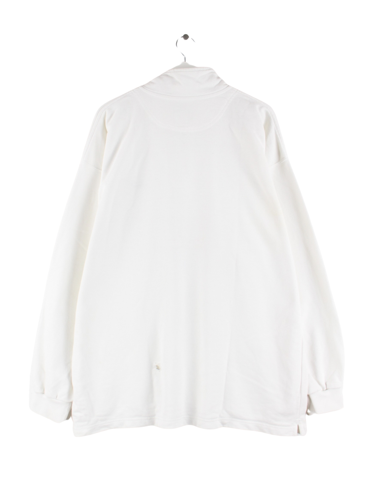 Weißer Sweater mit kurzem Reißverschluß der Marke Nike aus den 90'ern in Größe XL. Er ist aus einer Baumwollmischung produziert. Den Zustand würden wir als 'In Ordnung' bezeichnen (vergl. Bilder).