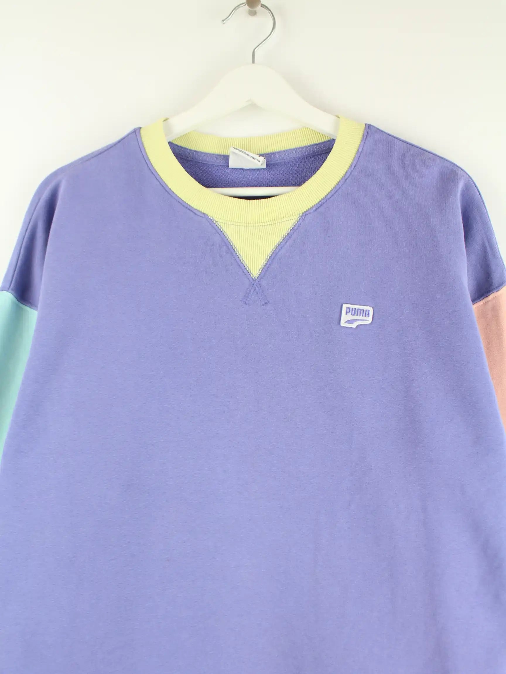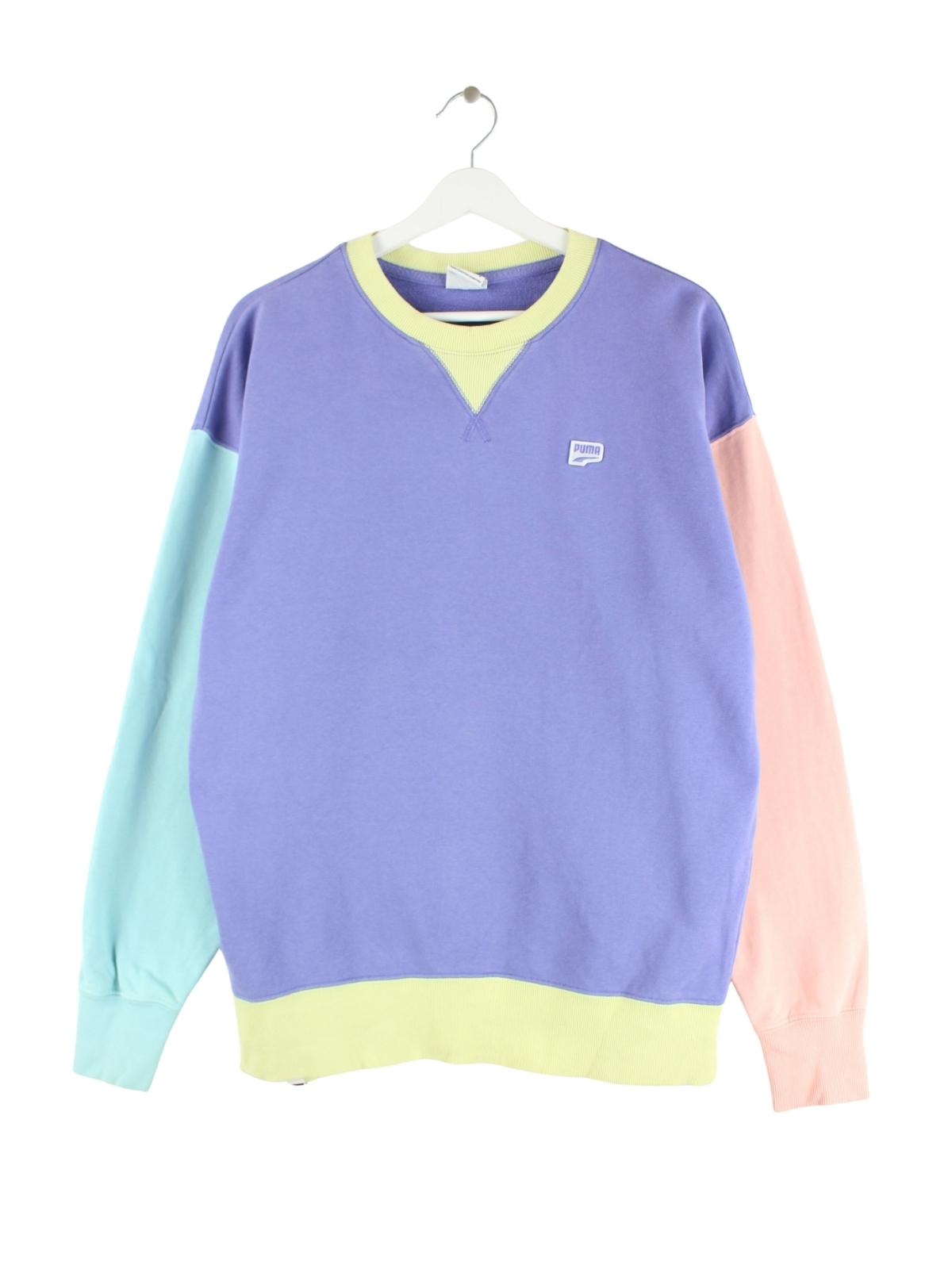 Lilafarbener Sweater der Brand Puma in Größe M. Er ist aus einer Baumwollmischung angefertigt. Den Zustand würden wir als 'In Ordnung' bezeichnen (vergl. Bilder).