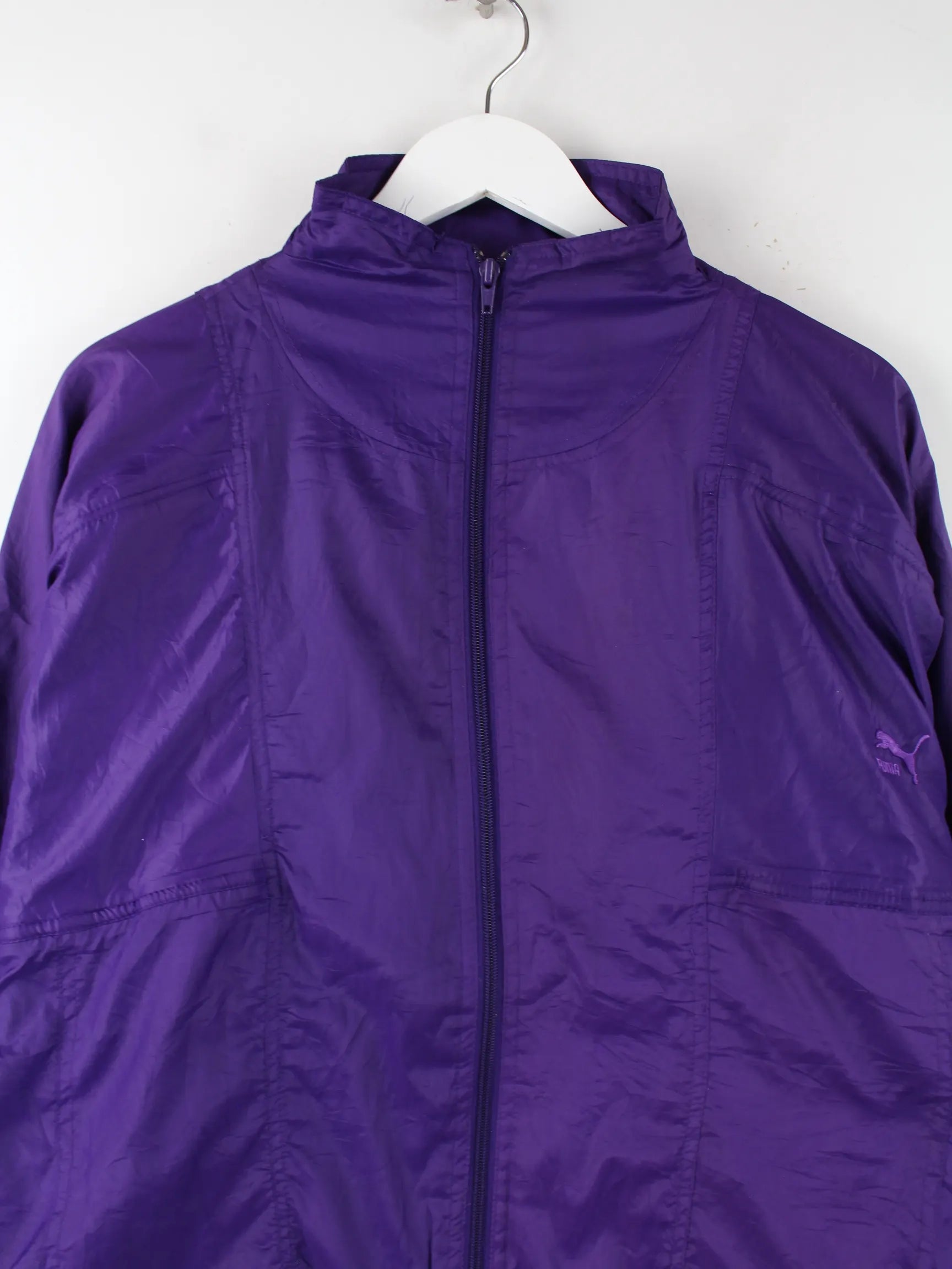 Lilafarbene Trainingsjacke vom Brand Puma aus den 90'ern in Größe L. Sie ist aus Synthetik produziert und in sehr gutem Zustand in Stock.