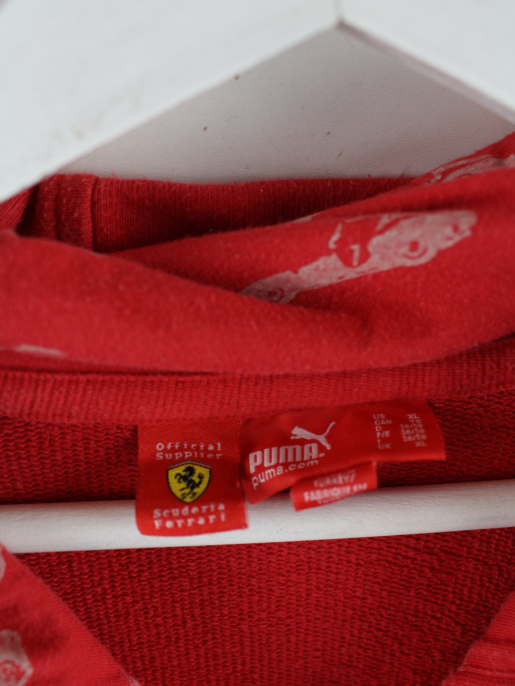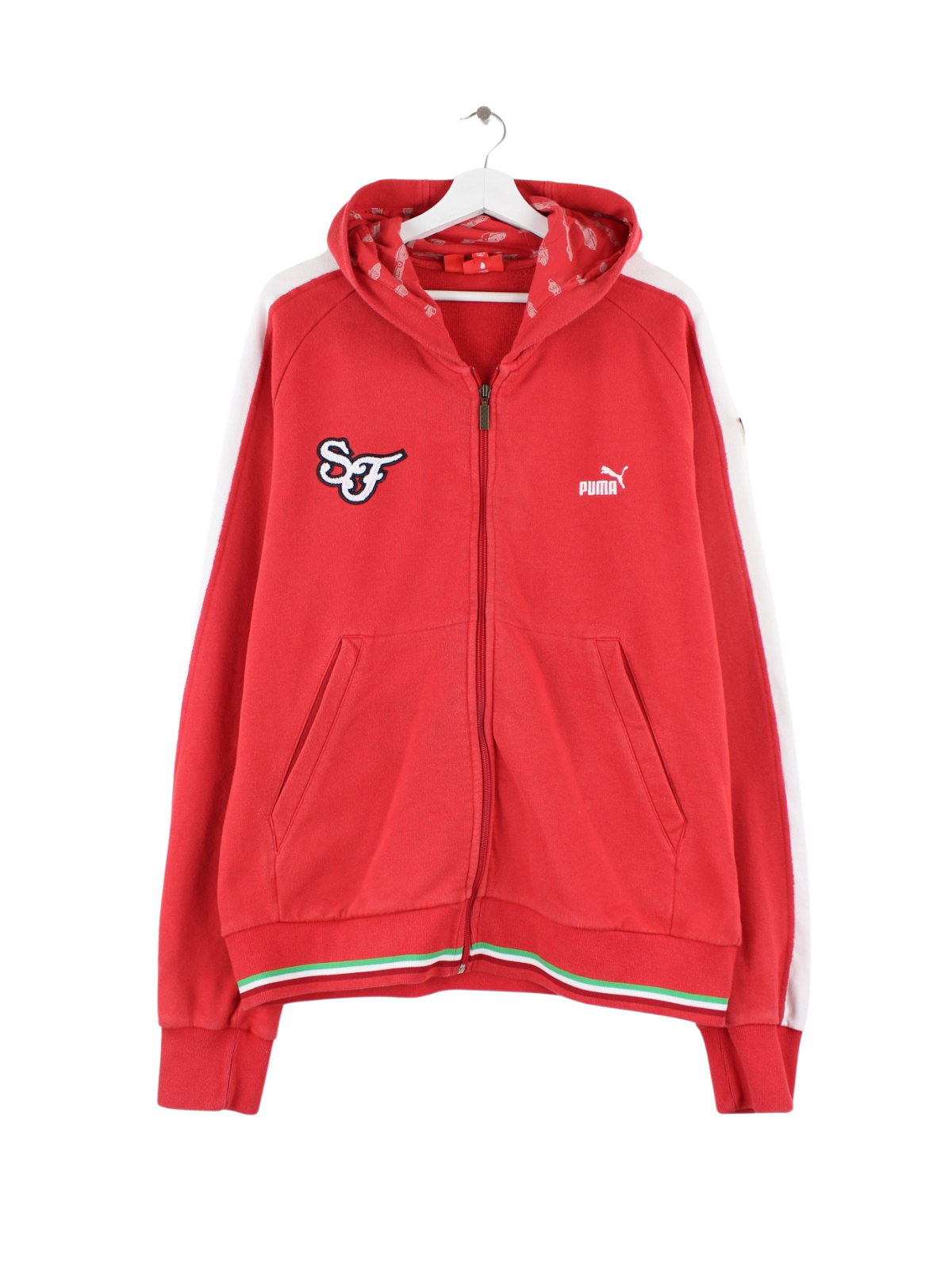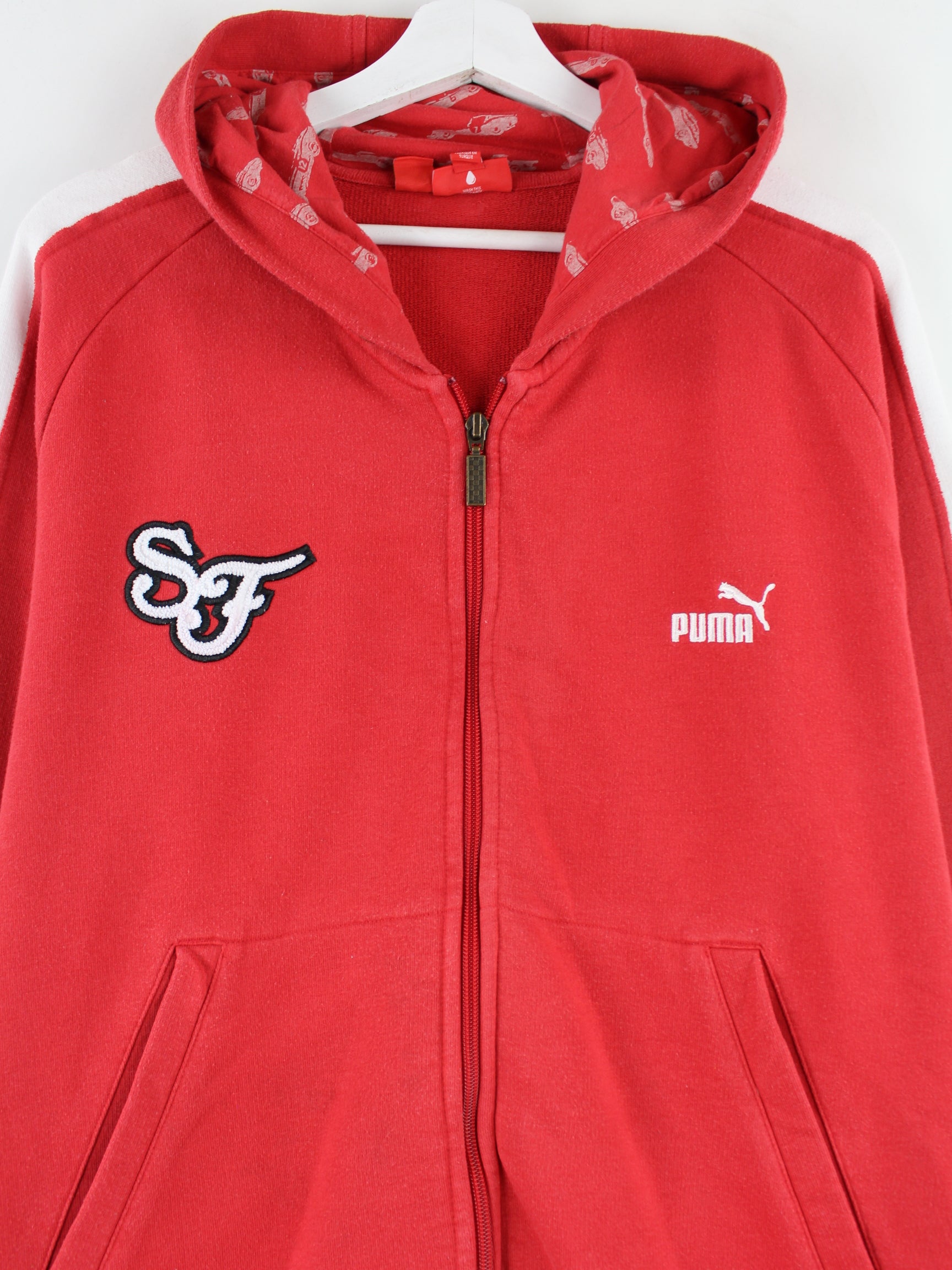 Red hoodie with embroidered motifs and zipper from the brand Puma in size XL. It is made from a cotton blend and is in good condition.