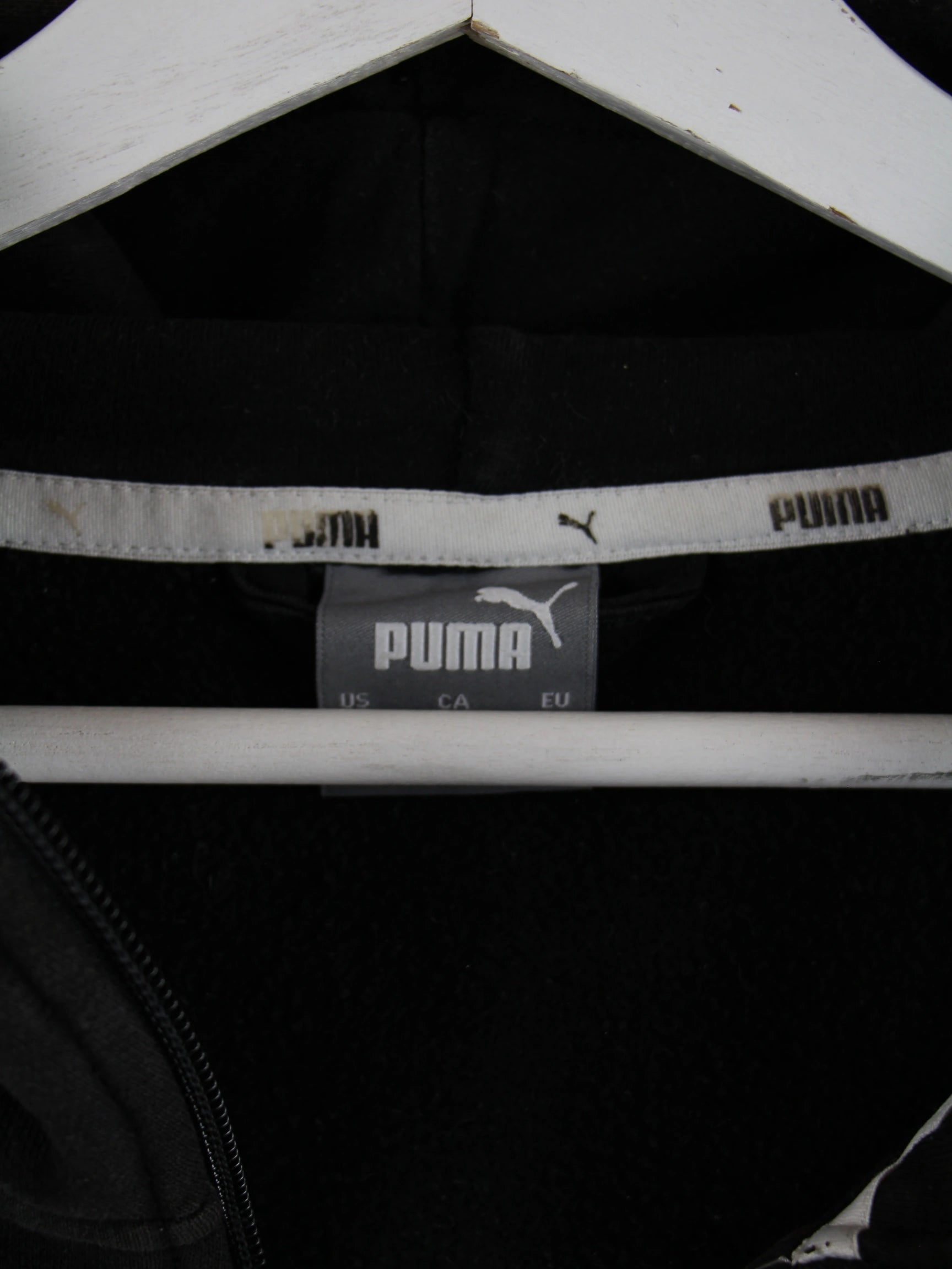 Schwarzer Hoodie mit Reißverschluß aus dem Hause Puma in Größe XL. Er ist aus einer Baumwollmischung angefertigt. Den Zustand würden wir als 'In Ordnung' bezeichnen (vergl. Bilder).Mit schickem undefined Print.