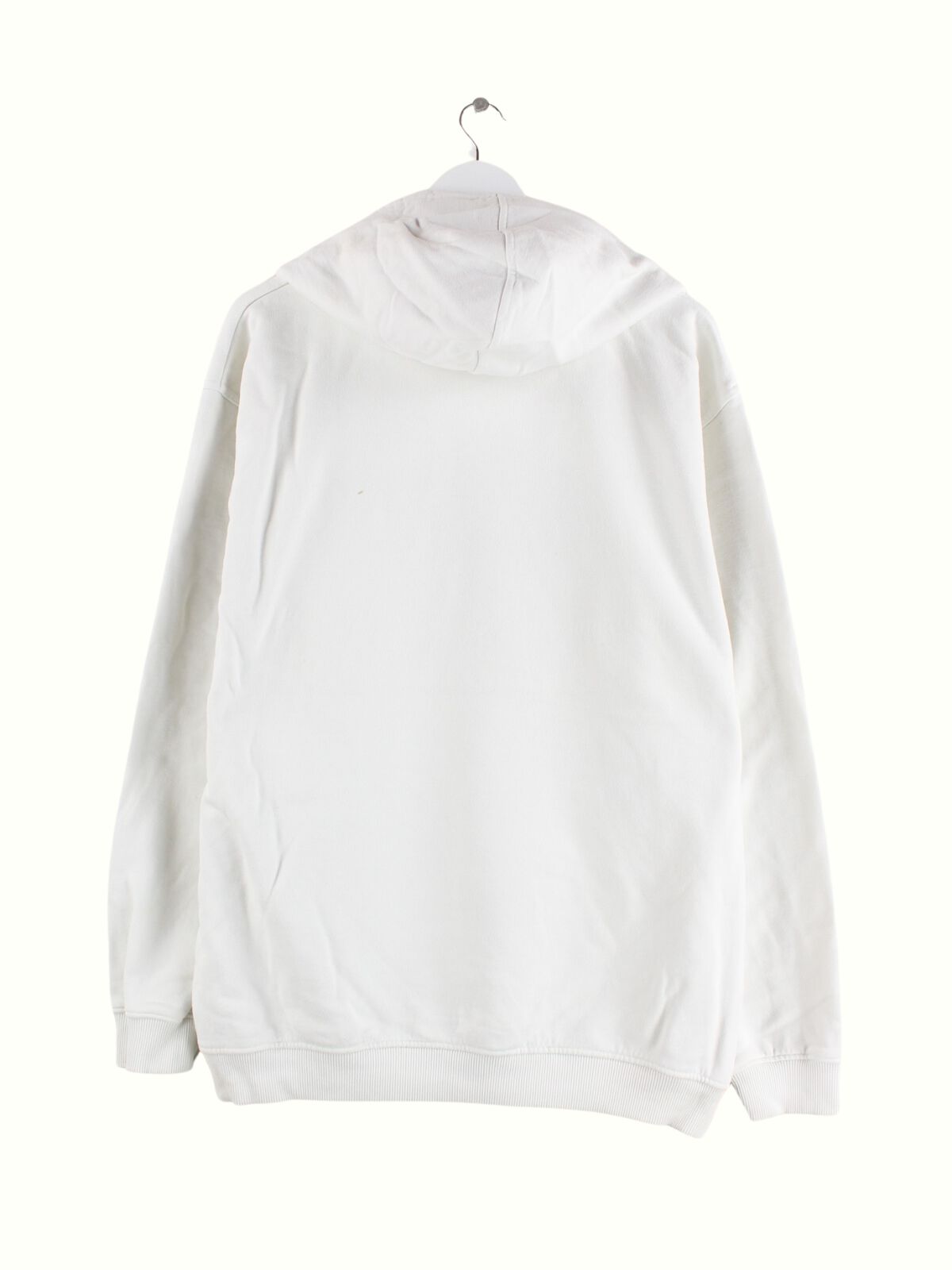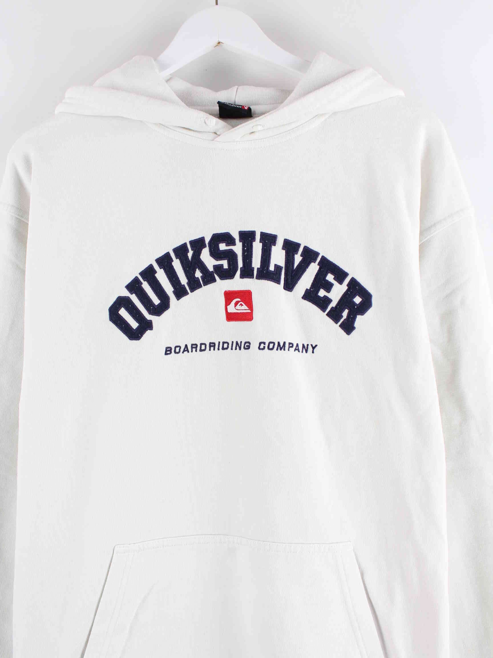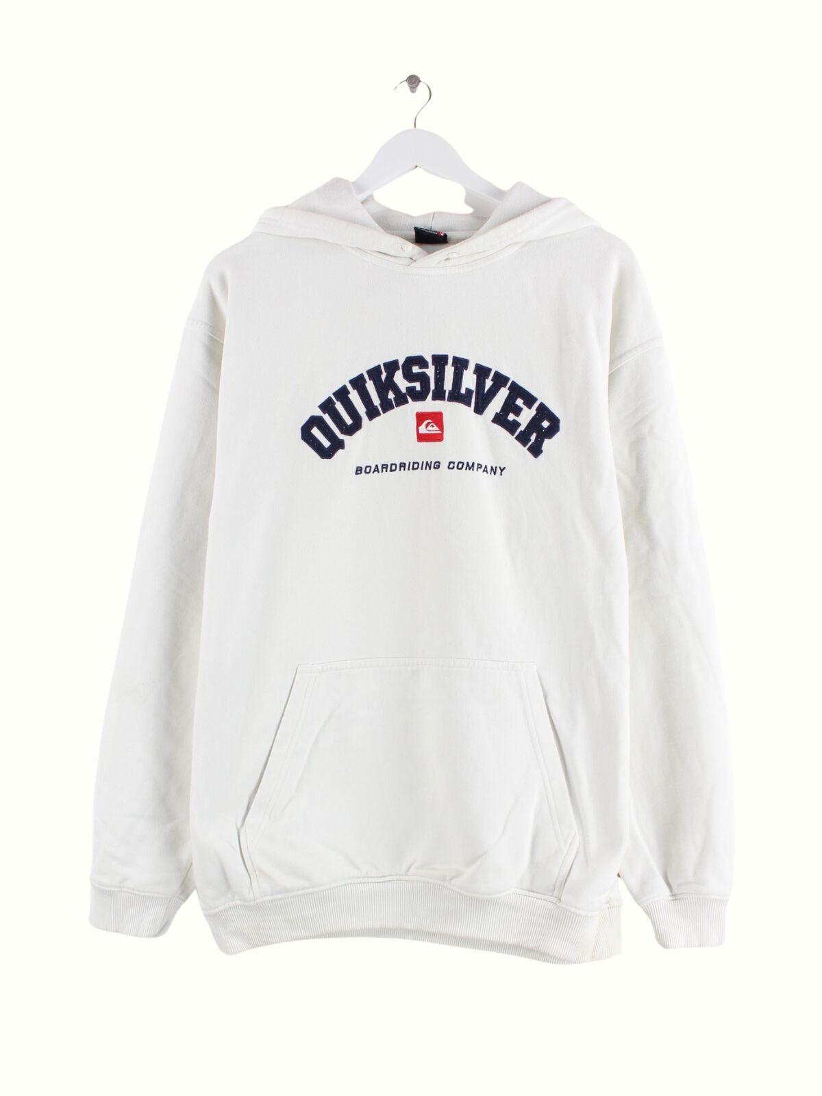 White hoodie with embroidery from the Quiksilver brand from the 90's in size L. It is made from a cotton blend and is in good condition in stock.