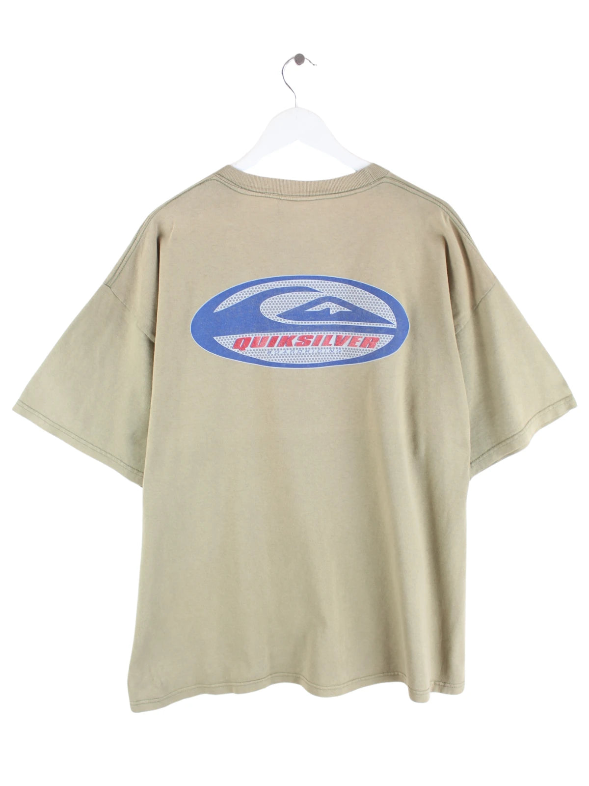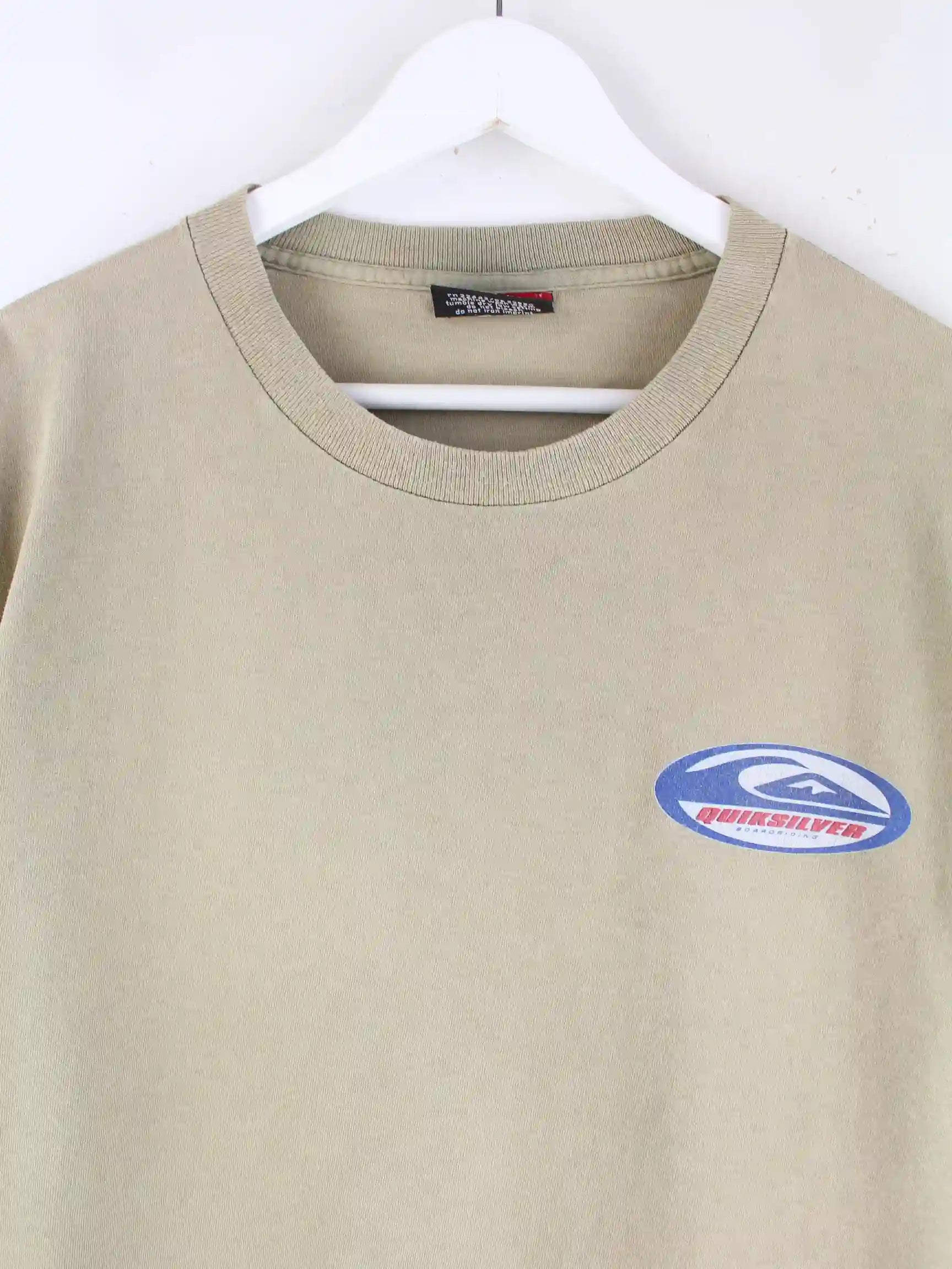 Beigefarbenes T-Shirt von Quiksilver aus den 90'ern in Größe XL. Es ist aus Baumwolle angefertigt und in gutem Zustand bei uns vorrätig. Mit seltenem Vintage Print.