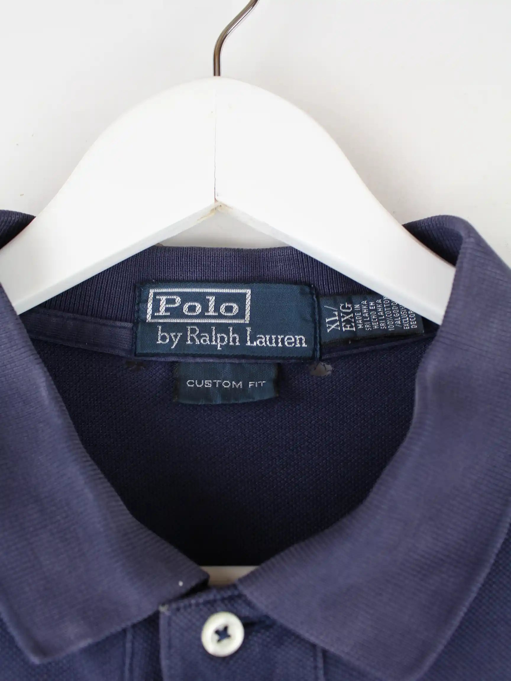 Poloshirt aus dem Hause Ralph Lauren in Größe XL aus den 90'ern. Es ist aus Baumwolle angefertigt und in Blau bei uns zu bekommen.