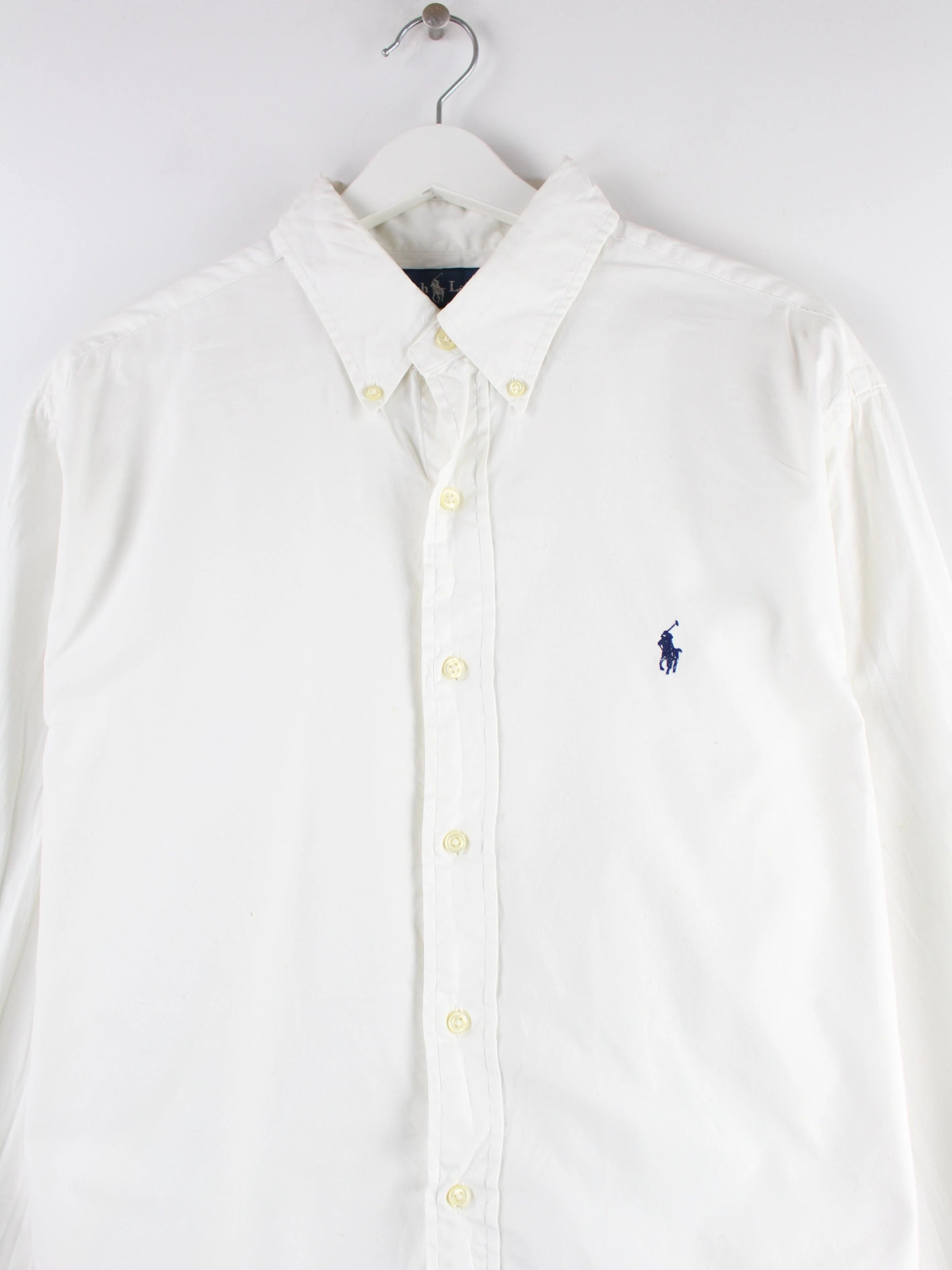 Weißes Hemd aus dem Hause Ralph Lauren aus den 90'ern in Größe XL. Es ist aus Baumwolle gemacht und in sehr gutem Zustand bei uns zu bekommen.