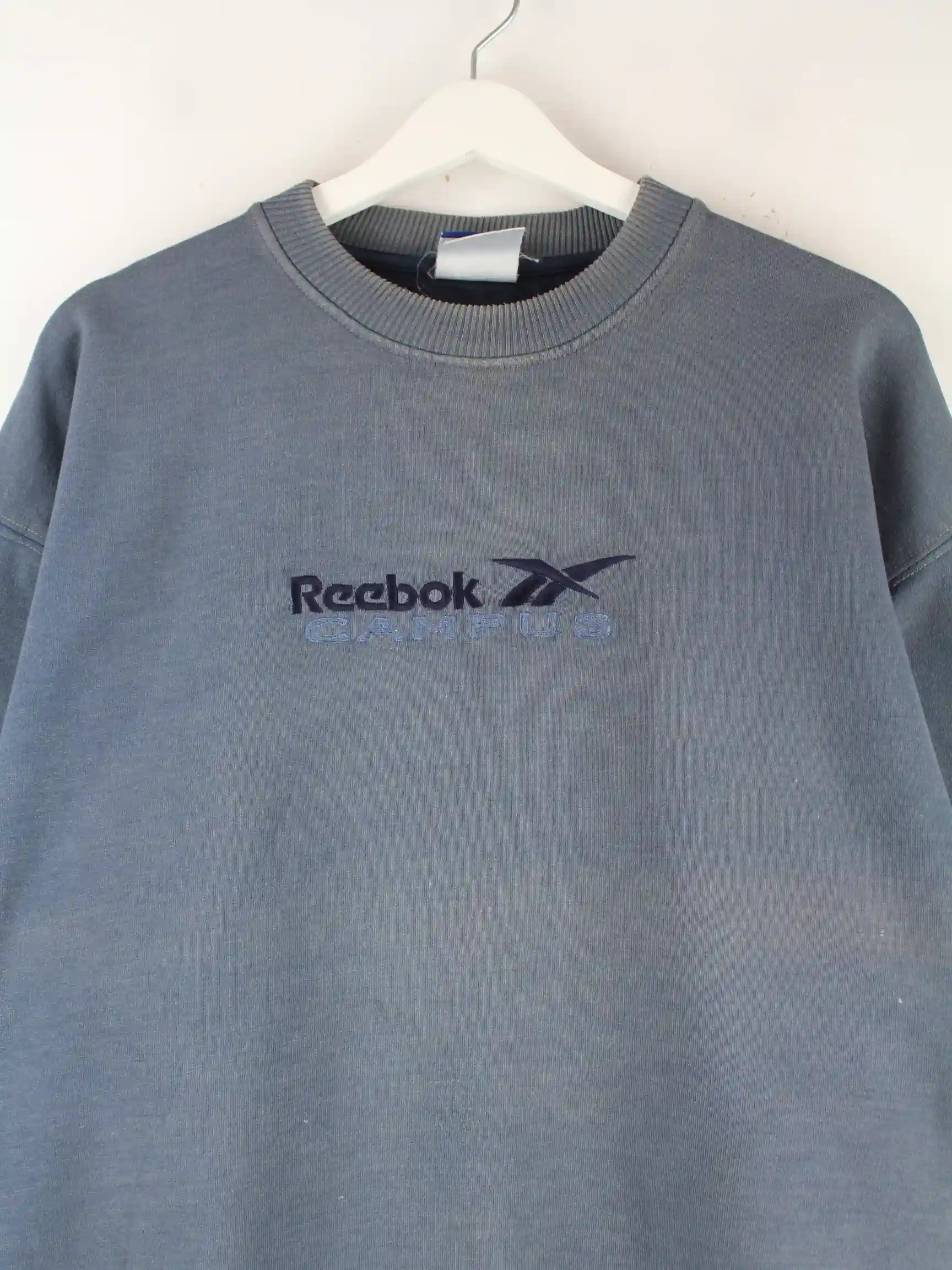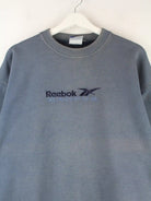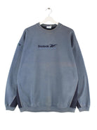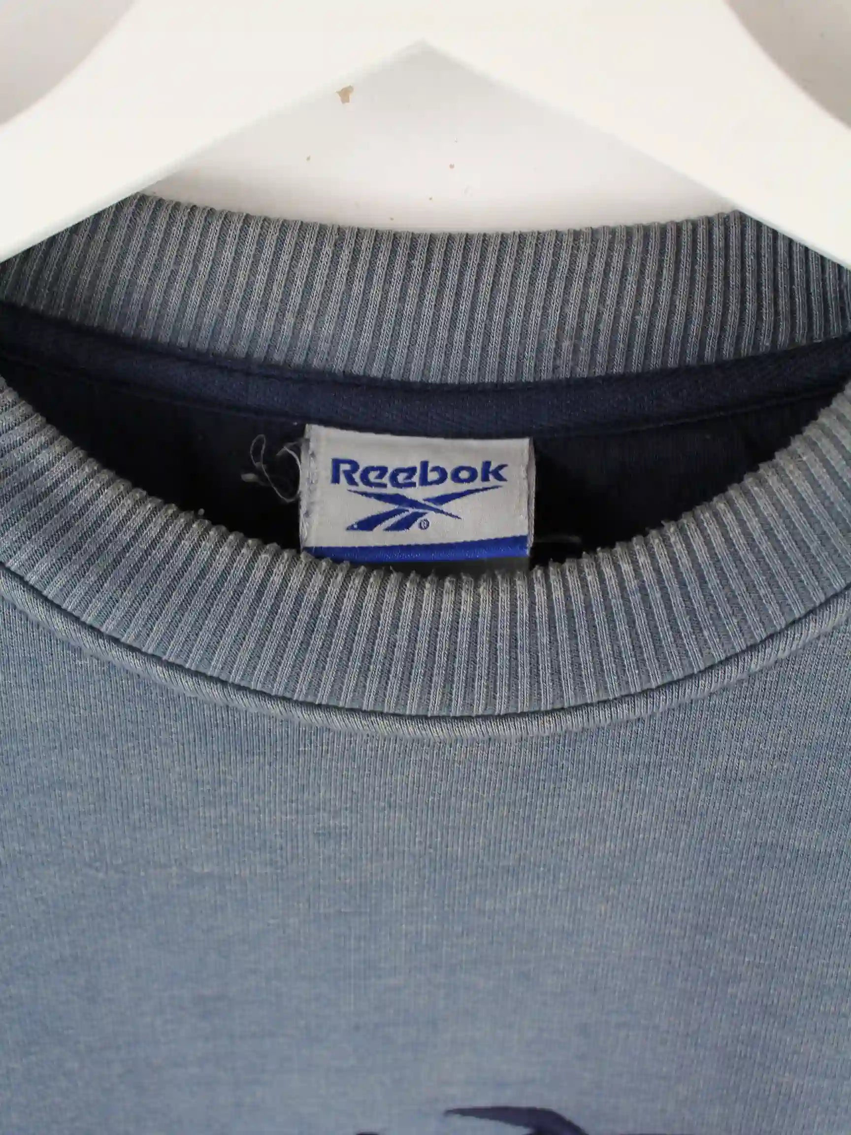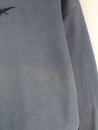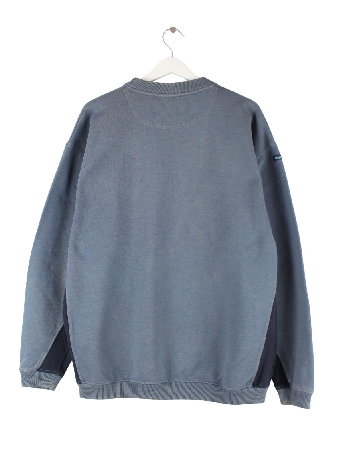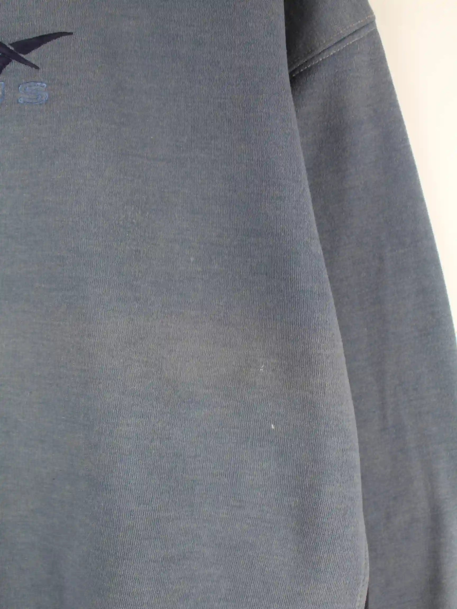 Blauer Sweater mit gestickten Motiven aus dem Hause Reebok in Größe L. Er ist aus einer Baumwollmischung produziert. Den Zustand würden wir als 'In Ordnung' bezeichnen (vergl. Bilder).