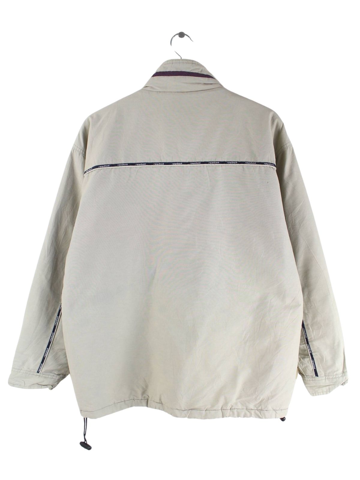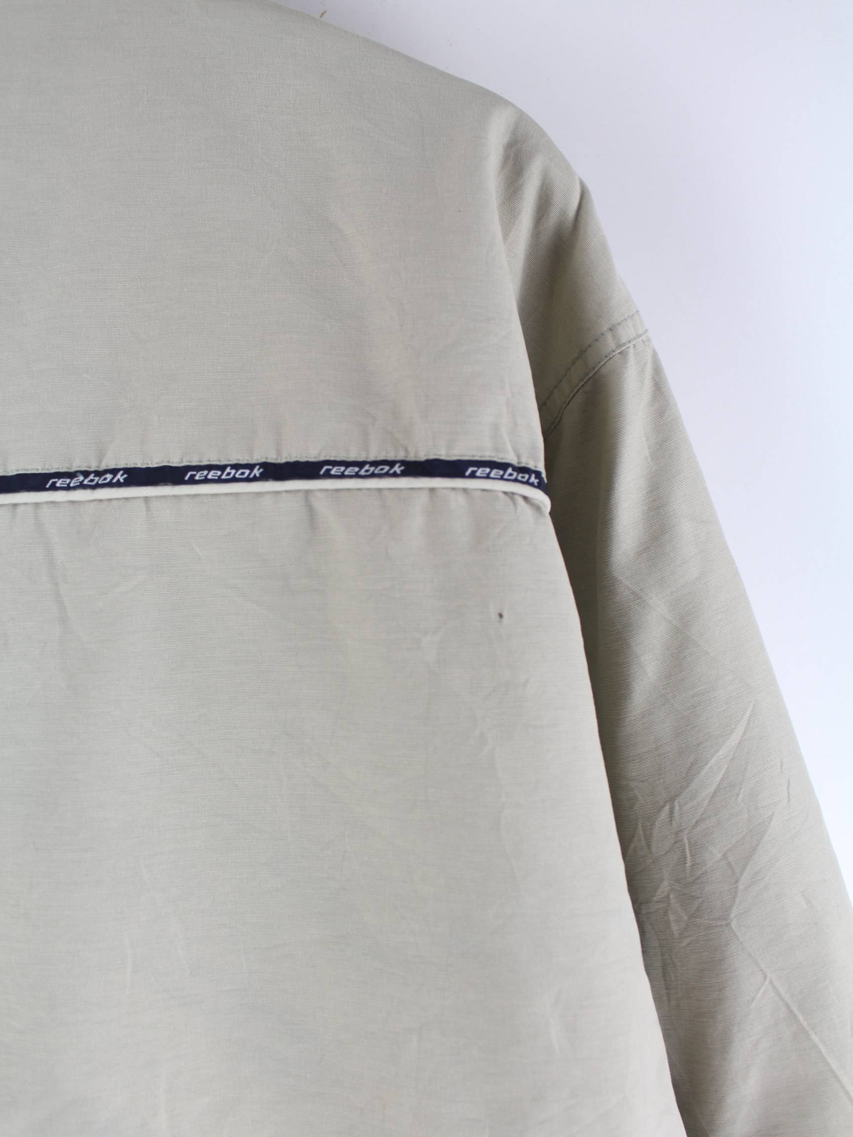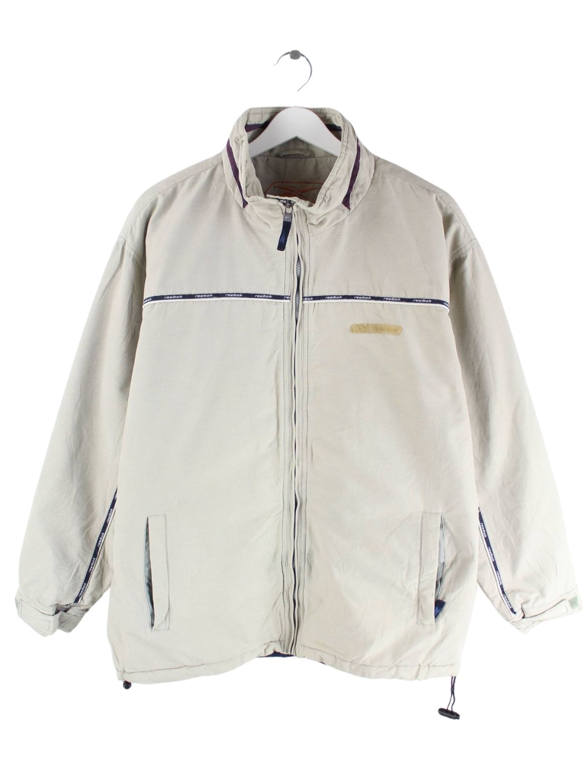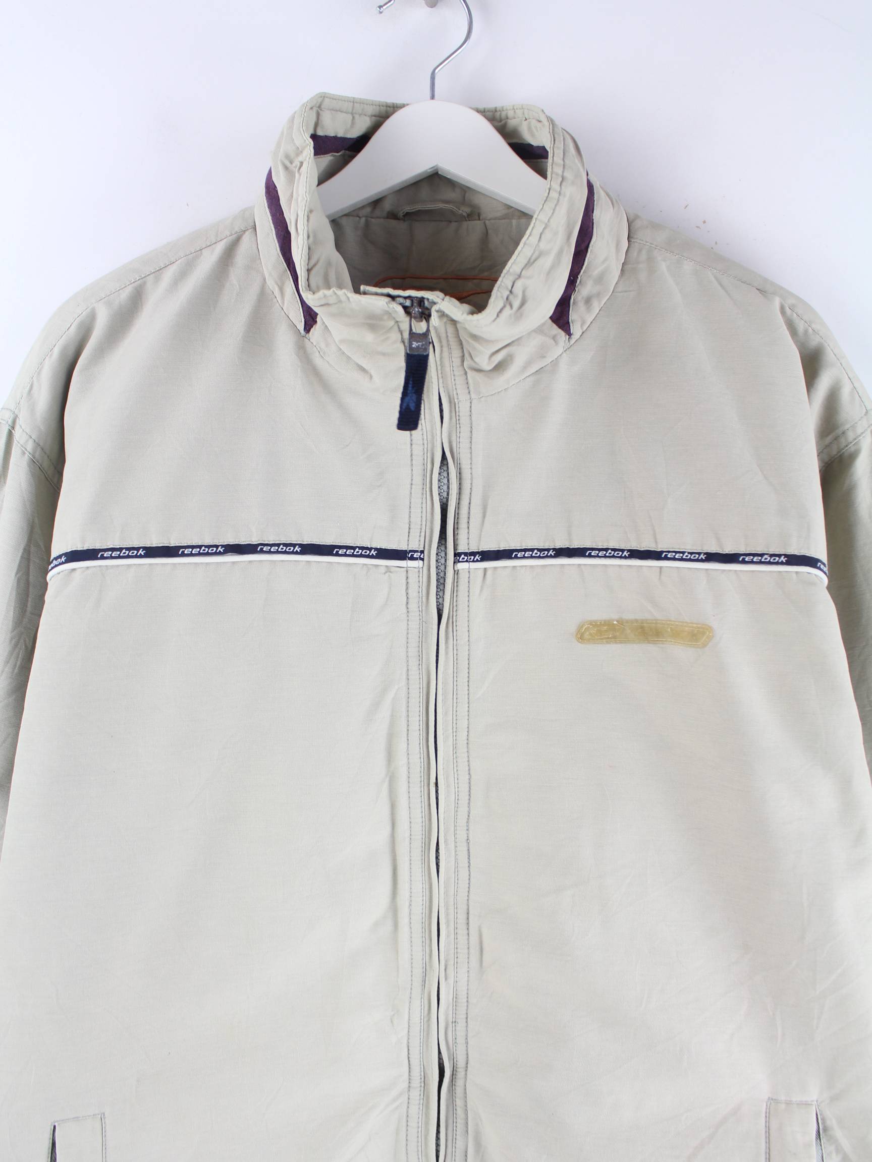 Beigefarbene Jacke der Brand Reebok in Größe M. Sie ist aus Synthetik hergestellt und in gutem Zustand bei uns vorrätig.