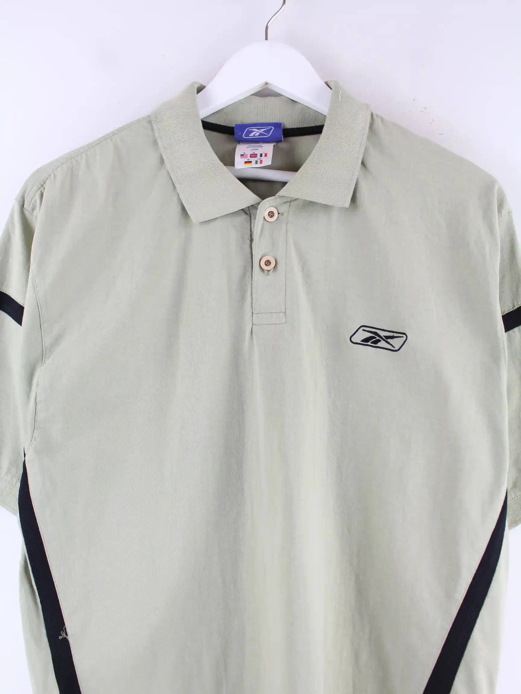 Poloshirt des Labels Reebok in Größe L. Es ist aus Baumwolle und in Grau lieferbar.