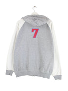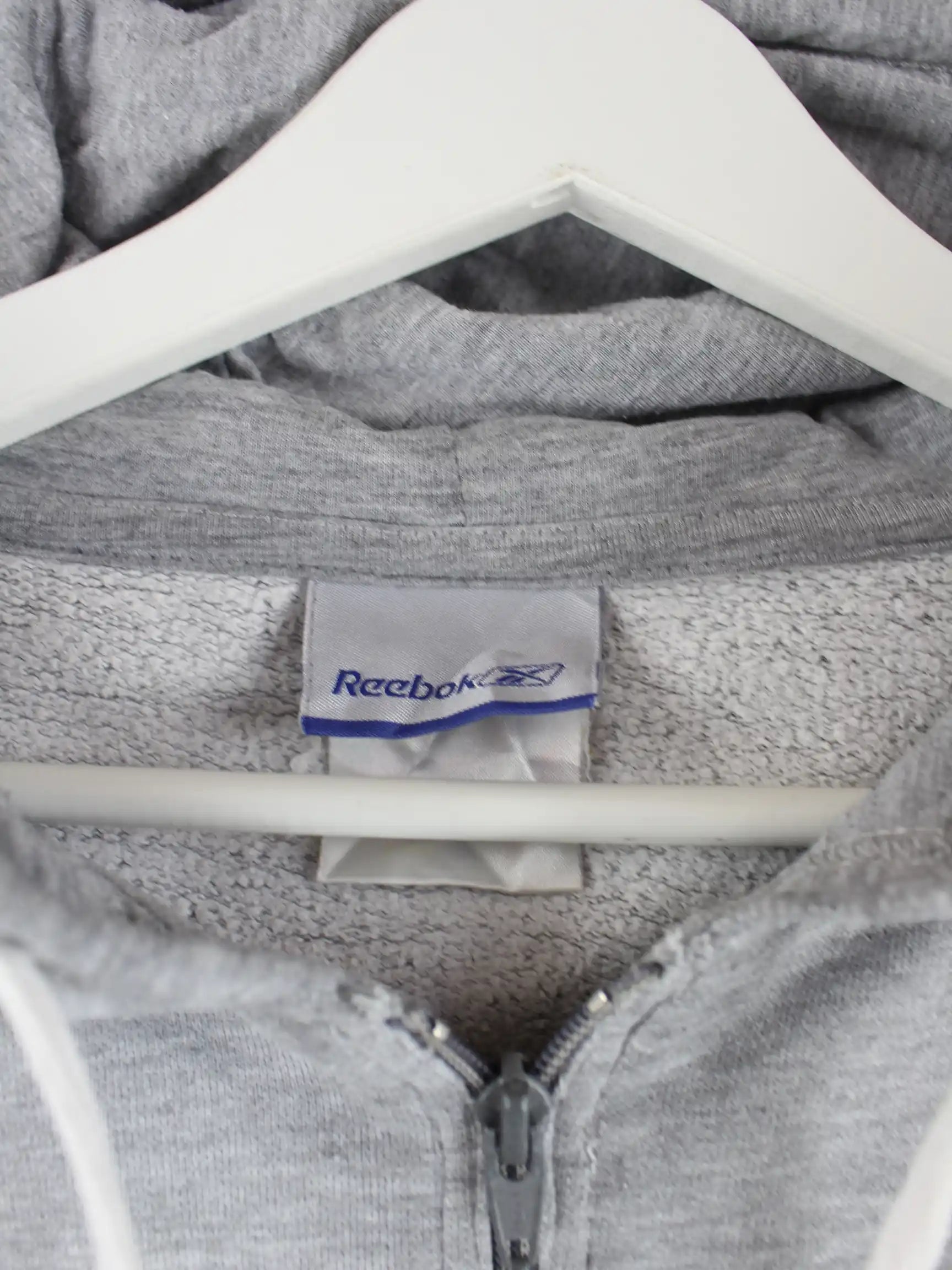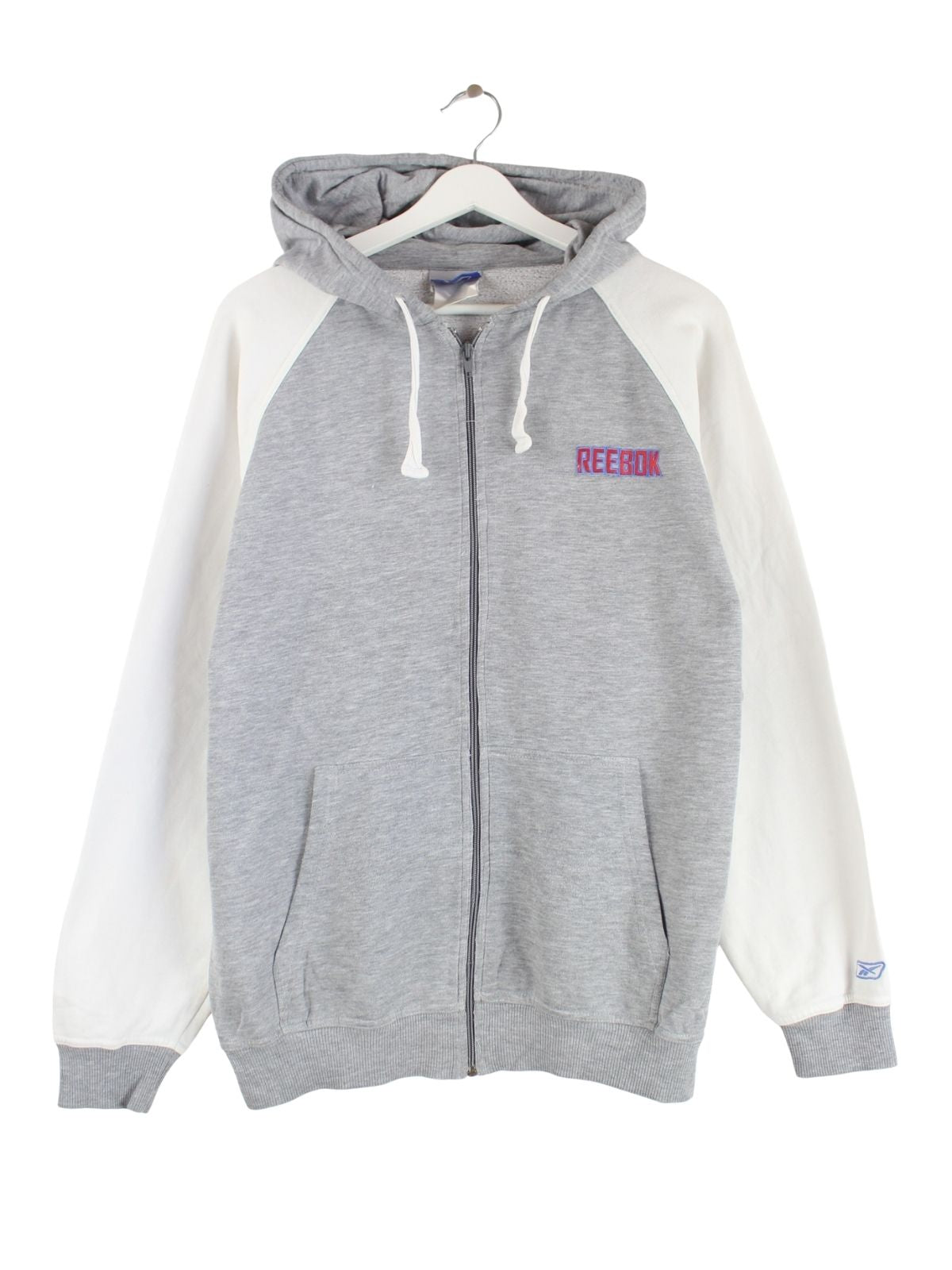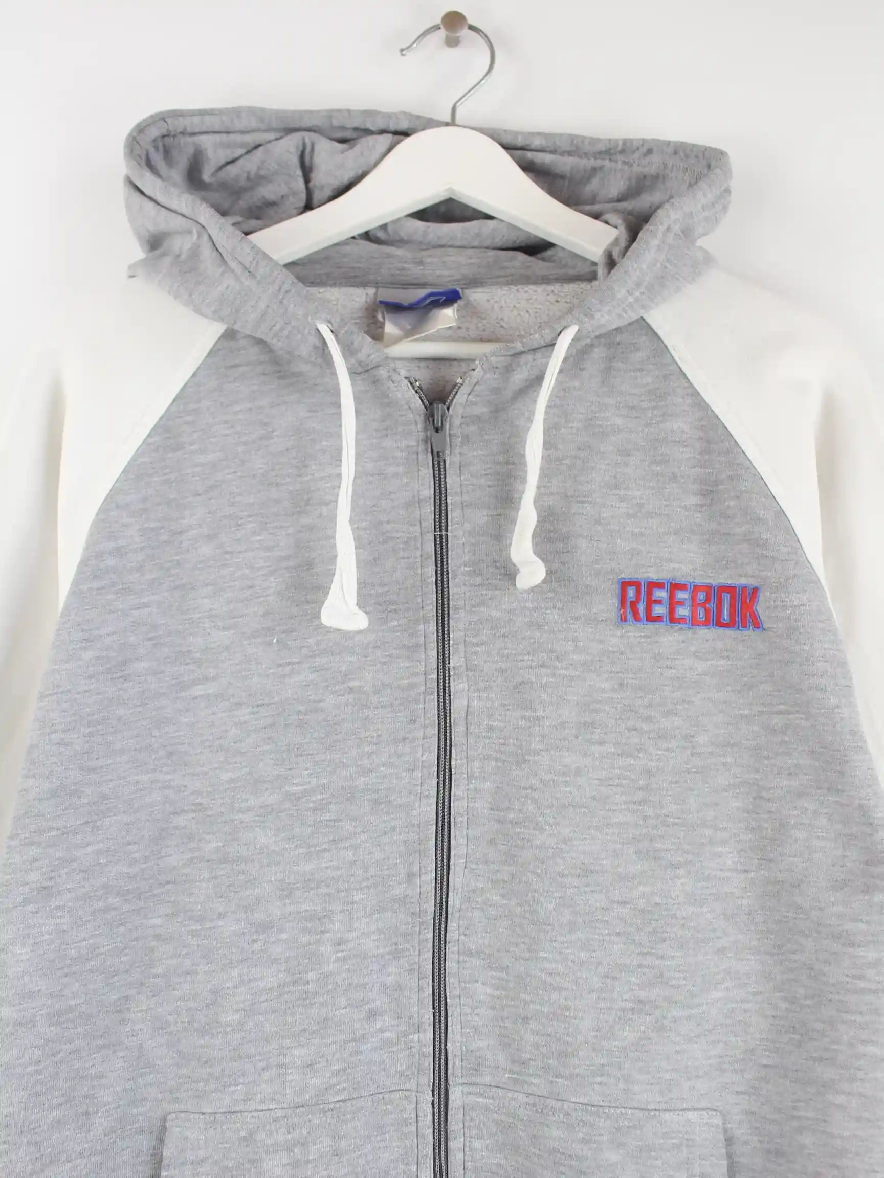 Grauer Hoodie mit durchgehendem Reißverschluß vom Label Reebok in Größe M. Er ist aus einer Baumwollmischung gemacht. Den Zustand würden wir als 'In Ordnung' bezeichnen (vergl. Bilder).