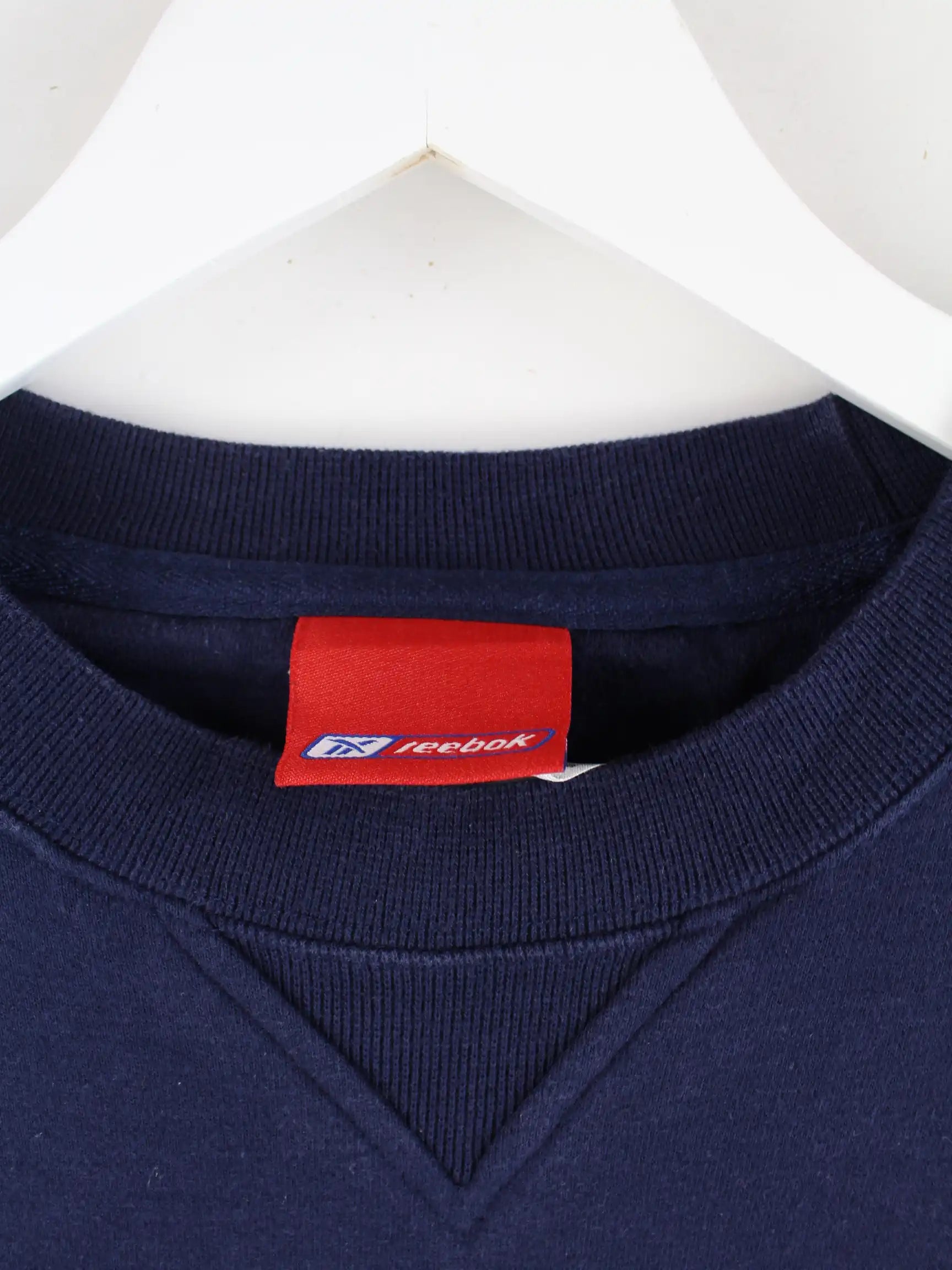 Sweater vom Label Reebok mit gestickten Motiven in Größe L. Er ist aus einer Baumwollmischung gefertigt und in Blau auf Lager.