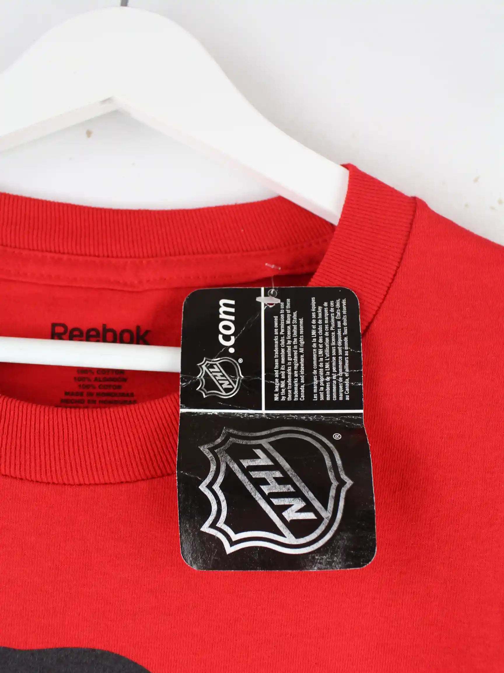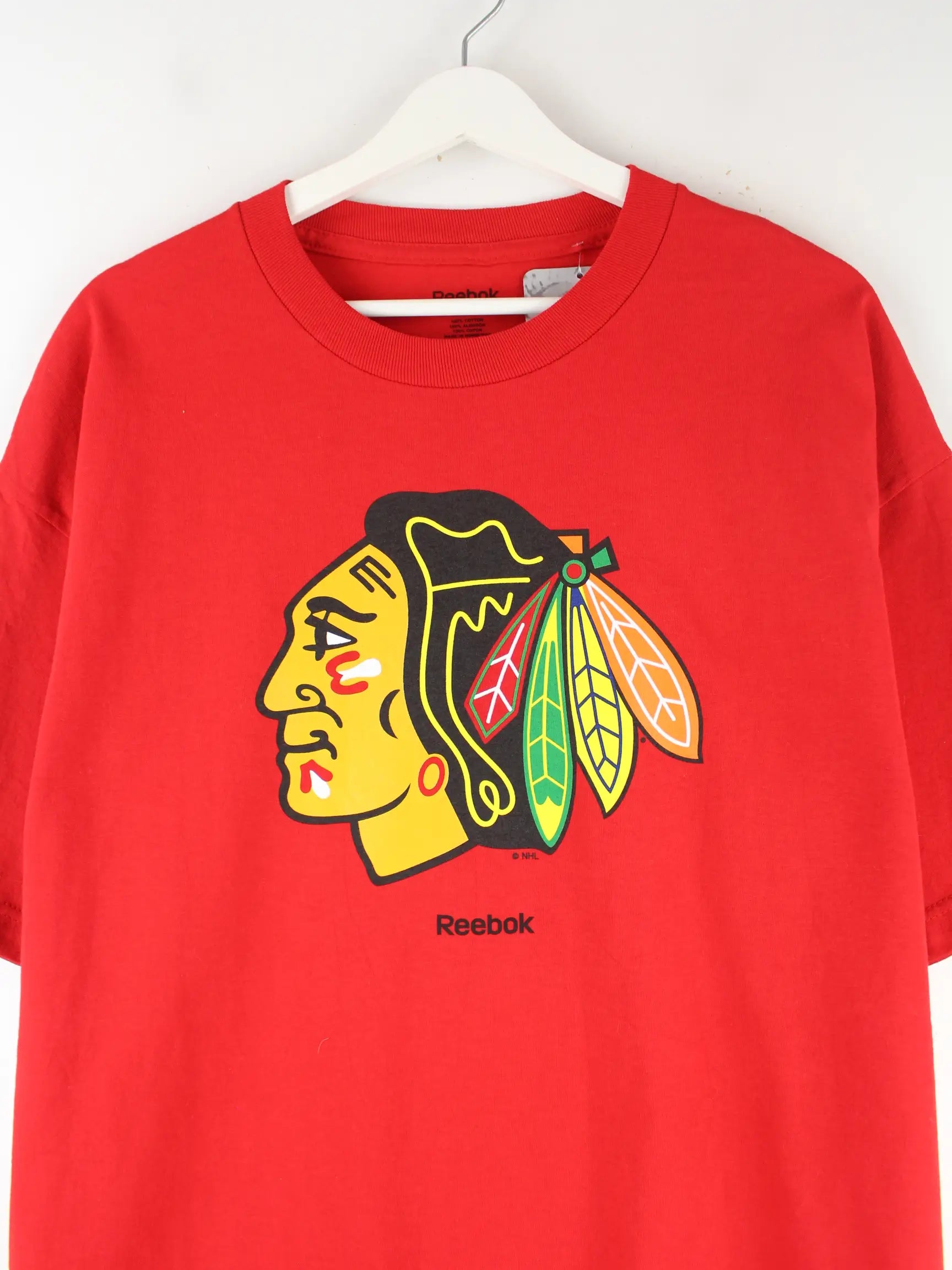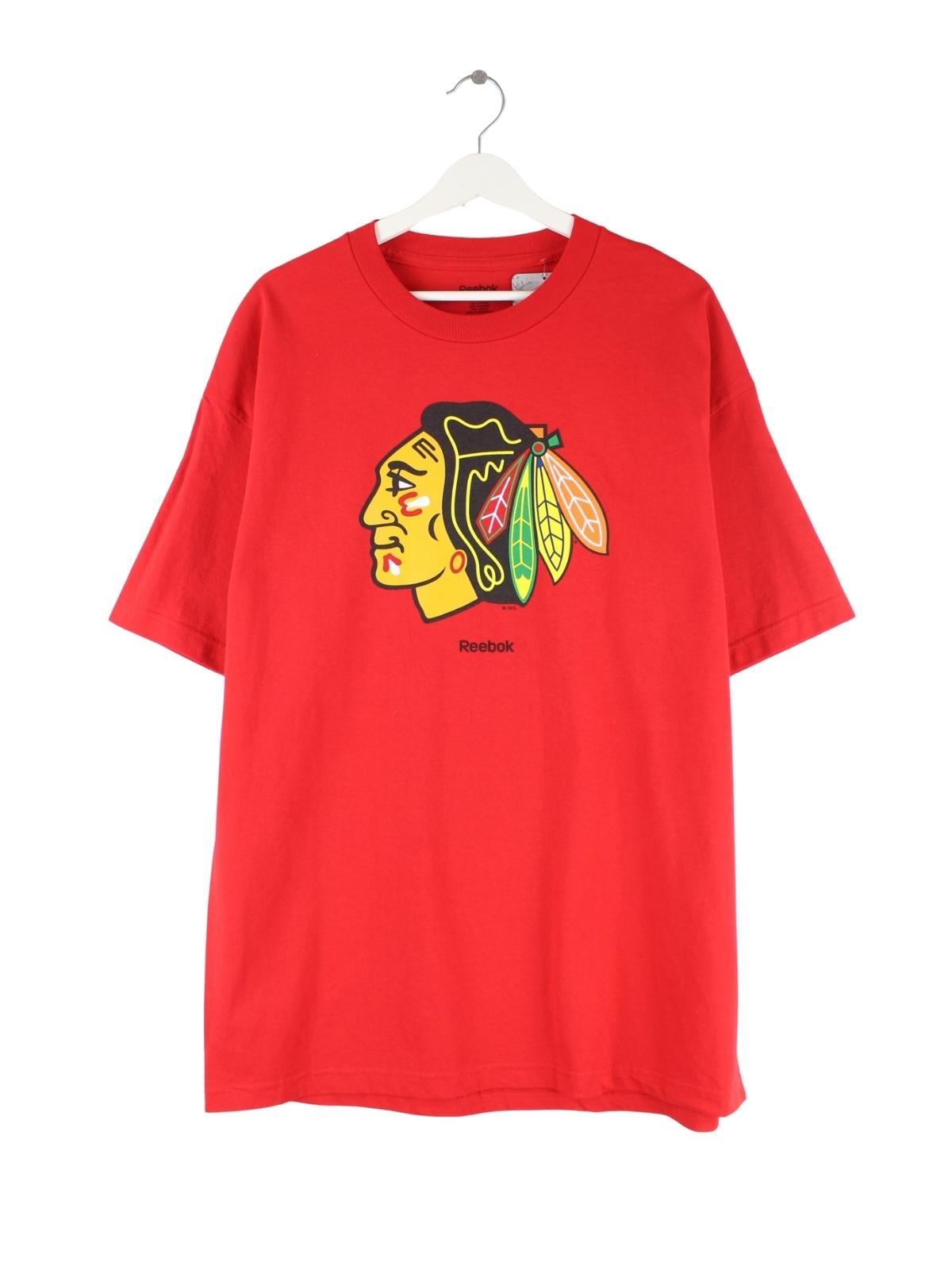 T-Shirt von Reebok in Größe XL. Es ist aus Baumwolle gemacht und in Rot auf Lager. Mit seltenem Blackhawks Print.