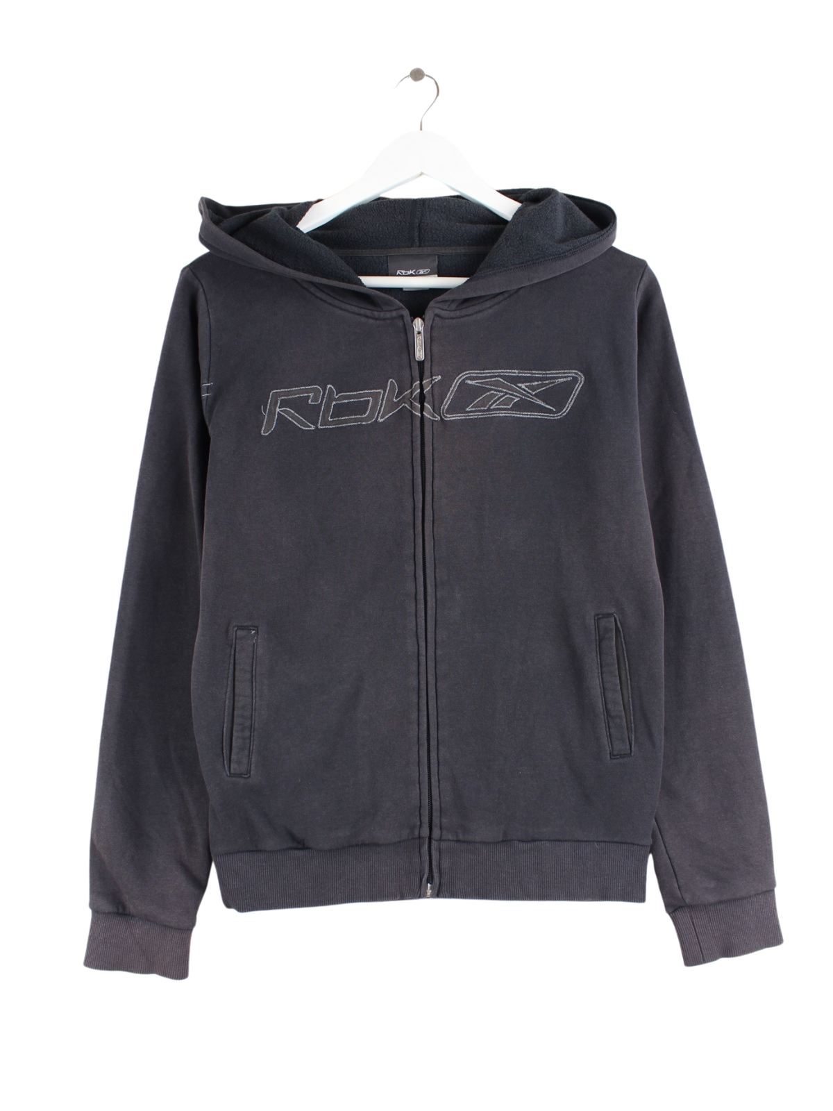 Black hoodie with embroidered logo and zipper from the label Reebok in size M. It is made of a cotton blend and is in good condition.