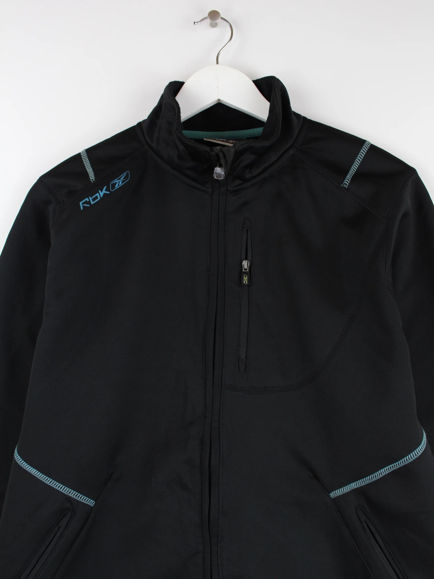 Schwarze Trainingsjacke der Brand Reebok in Größe M. Sie ist aus Synthetik und in gutem Zustand vorrätig.