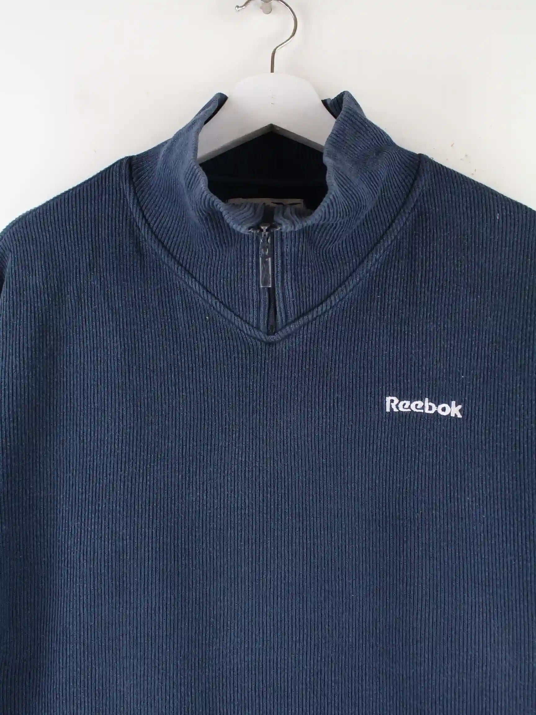 Blauer Sweater mit kurzem Reißverschluß vom Brand Reebok aus den 90'ern in Größe M. Er ist aus einer Baumwollmischung produziert und in gutem Zustand im Angebot.