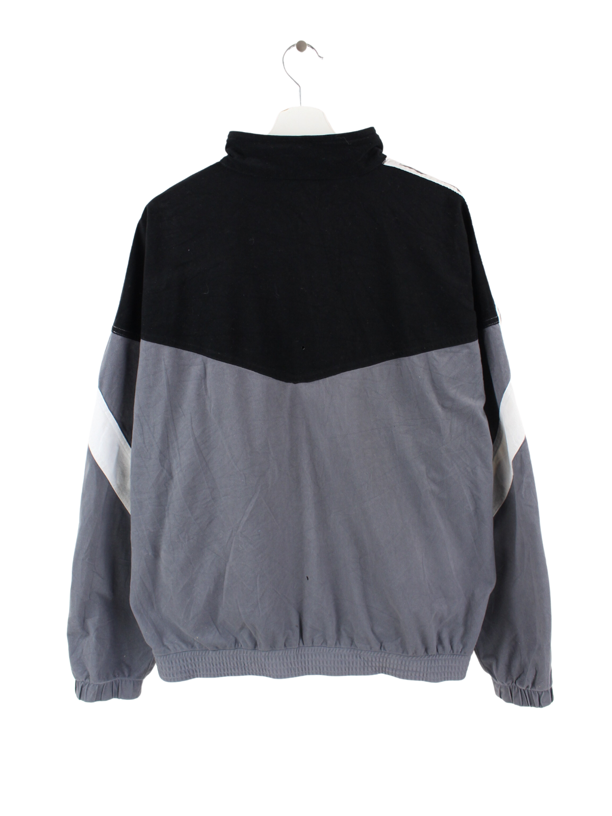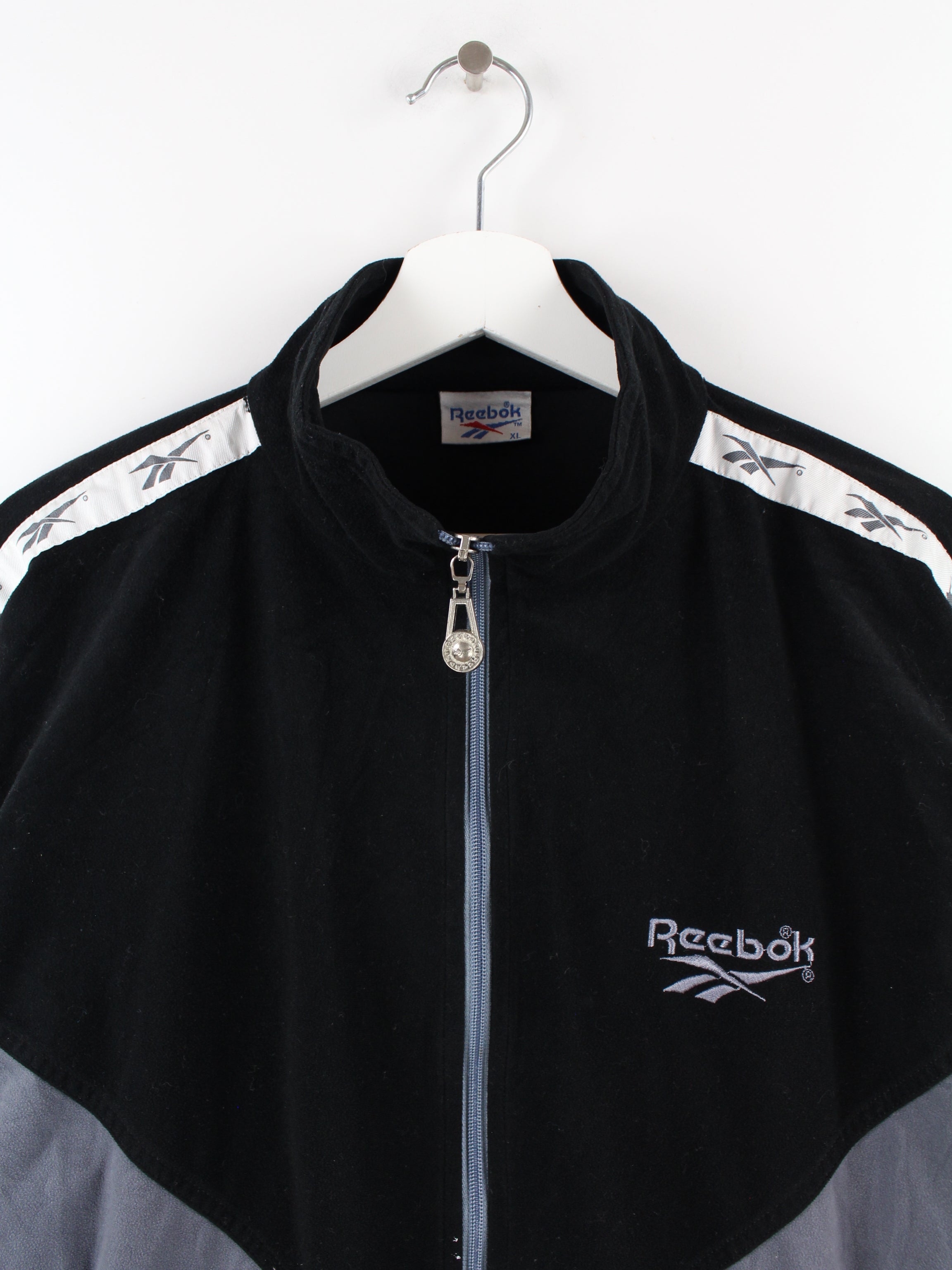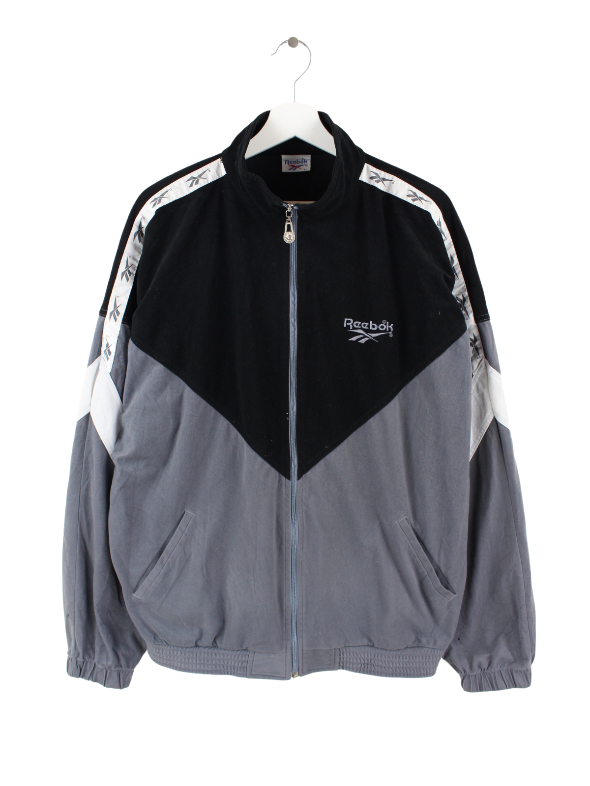 Gray training jacket from the brand Reebok, with tape stripes on the sleeves.
