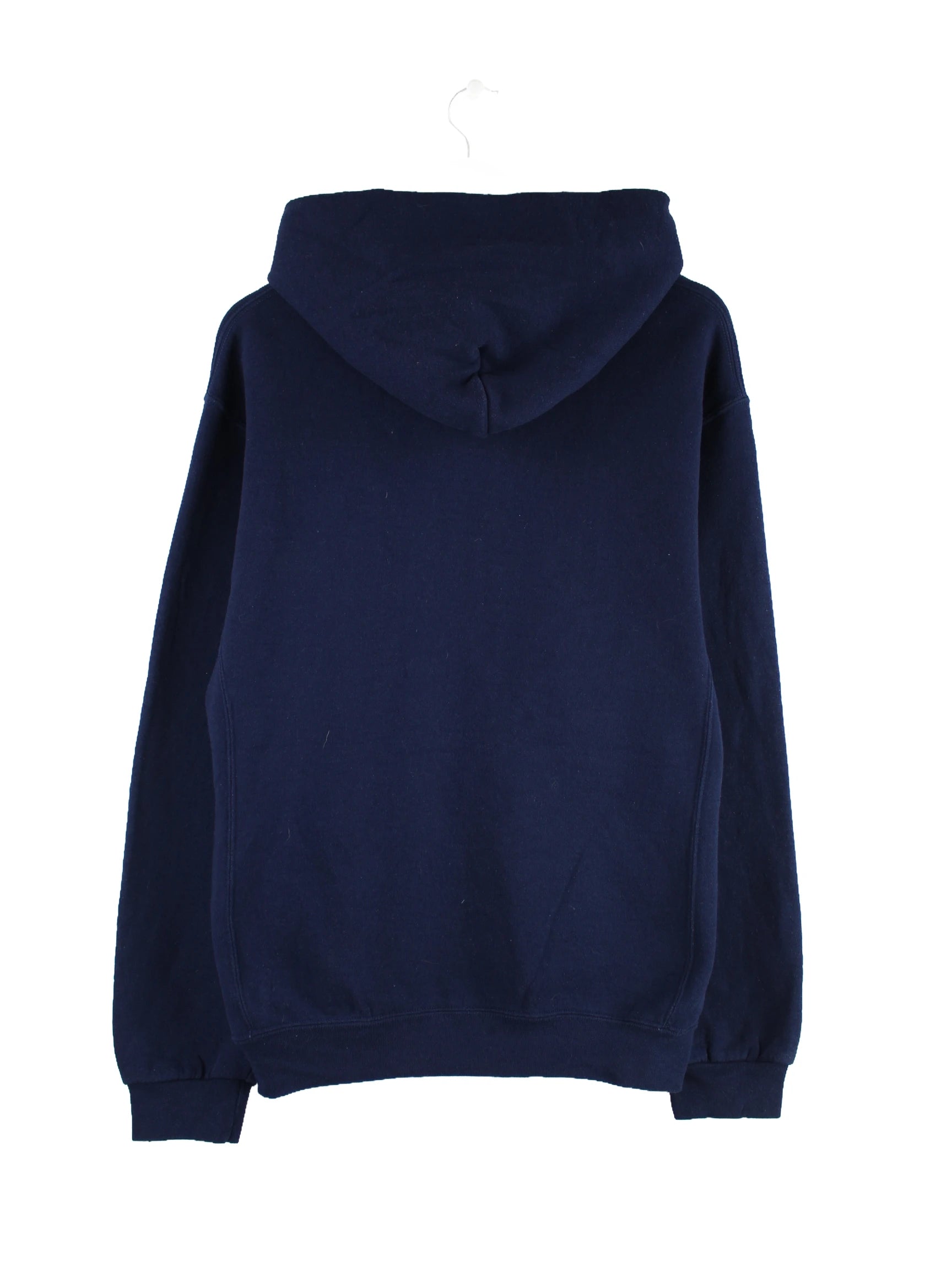 Blauer Hoodie aus dem Hause Russell Athletic in Größe M. Er ist aus einer Baumwollmischung gemacht und in gutem Zustand lieferbar. Mit chiquem Service Print.