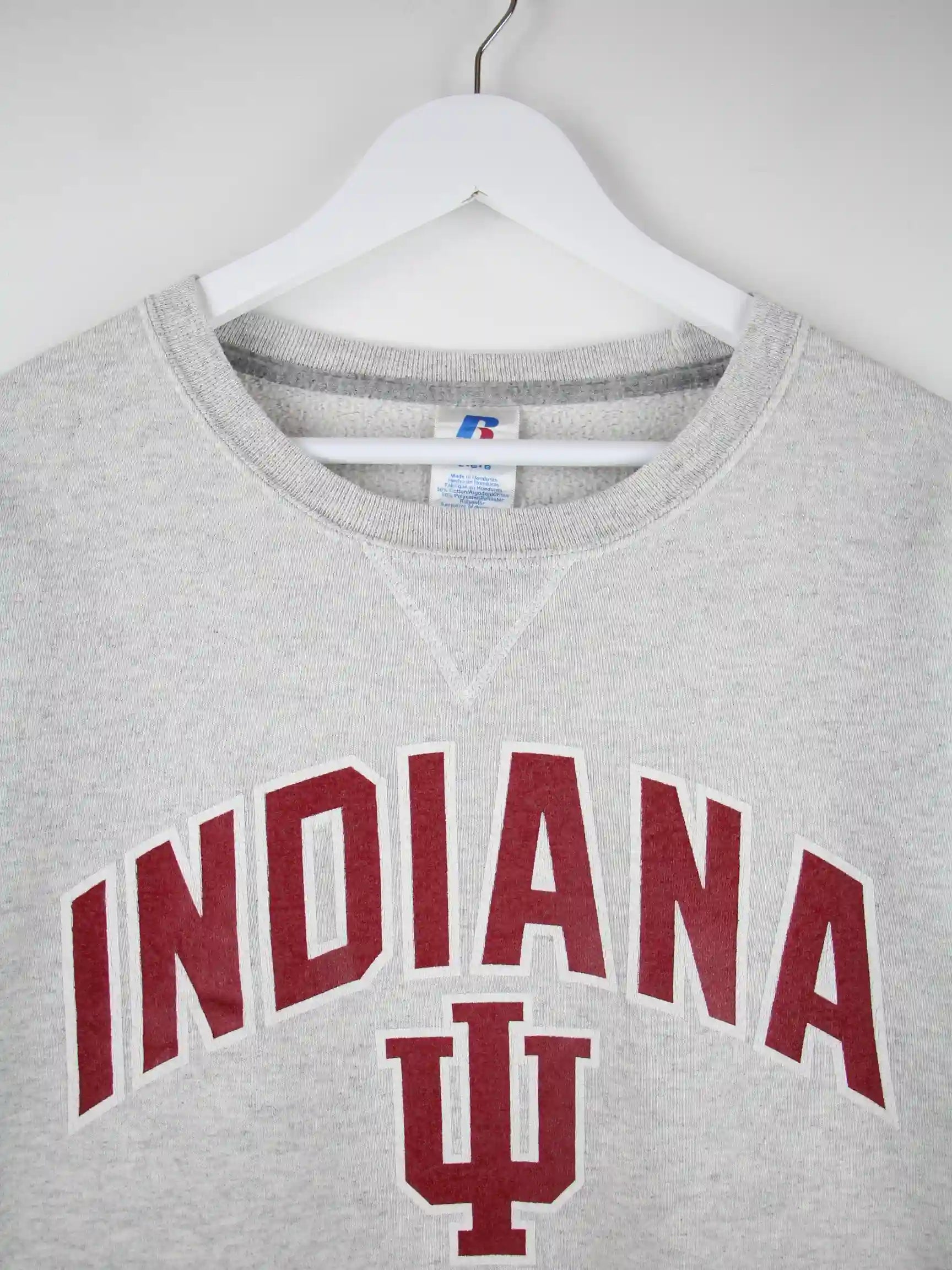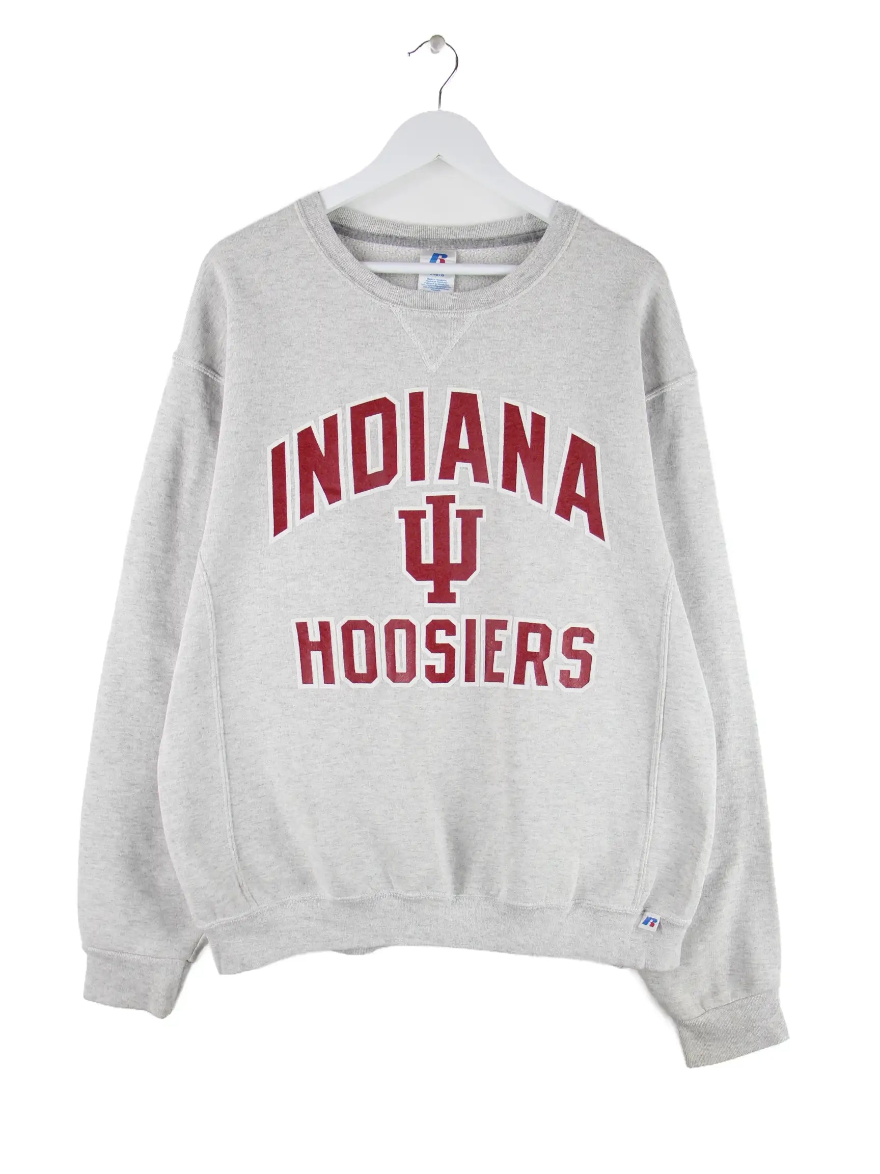 Sweater vom Brand Russell Athletic in Größe L. Er ist aus einer Baumwollmischung und in Grau im Bestand. Mit seltenem Hoosiers Print.