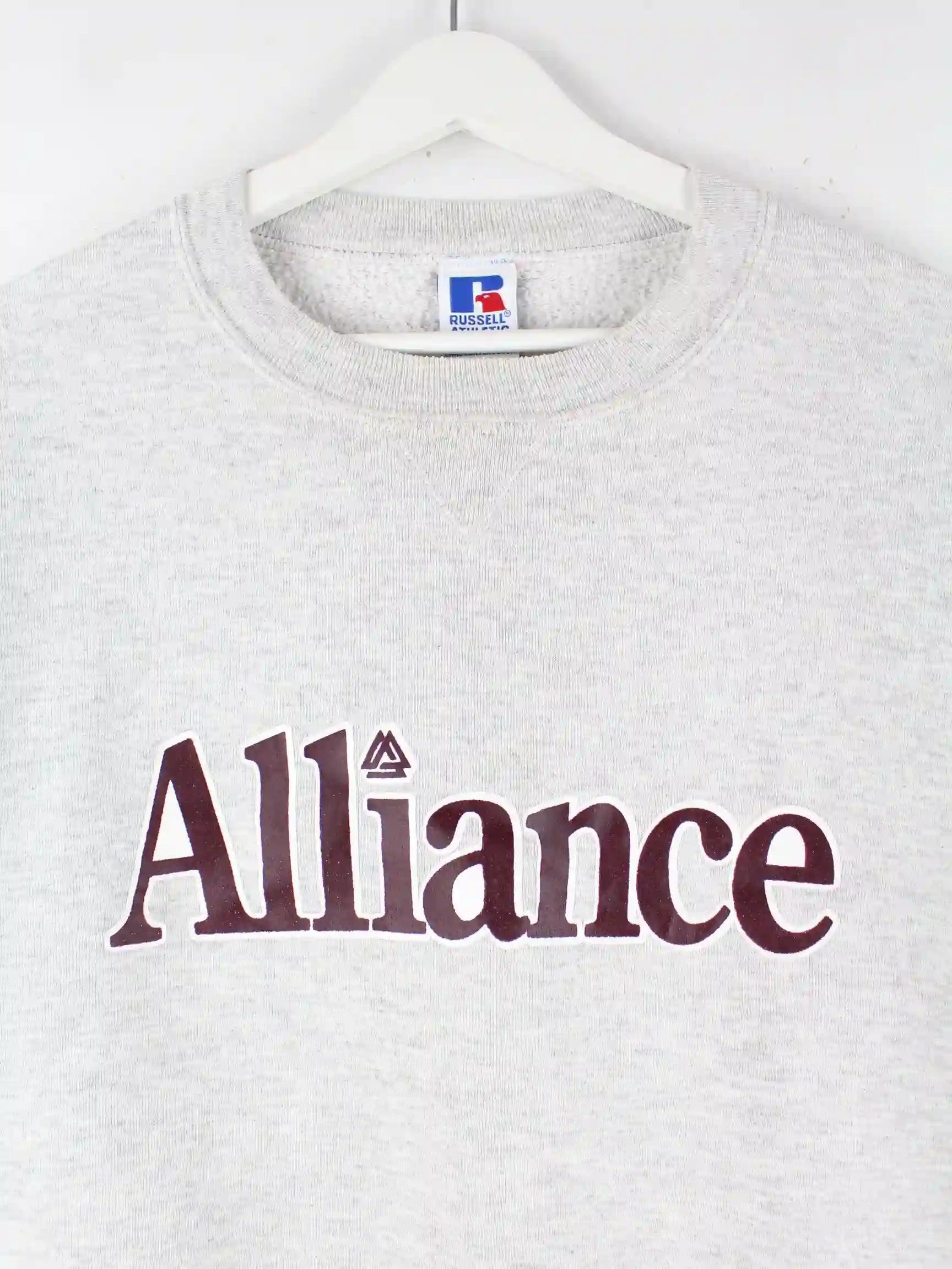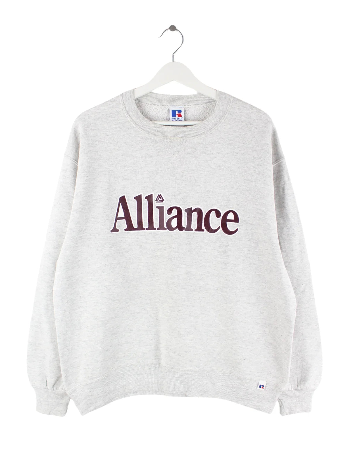 Grauer Sweater vom Label Russell Athletic aus den 90'ern in Größe L. Er ist aus einer Baumwollmischung angefertigt und in sehr gutem Zustand vorrätig. Mit tollem Alliance Print.