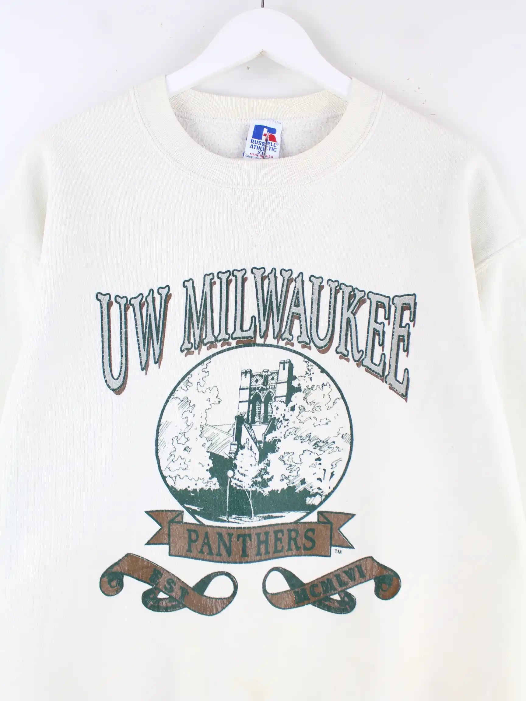 Sweater vom Label Russell Athletic in Größe XL aus den 90'ern. Er ist aus einer Baumwollmischung und in Weiß vorrätig. Mit schönem Milwaukee Print.