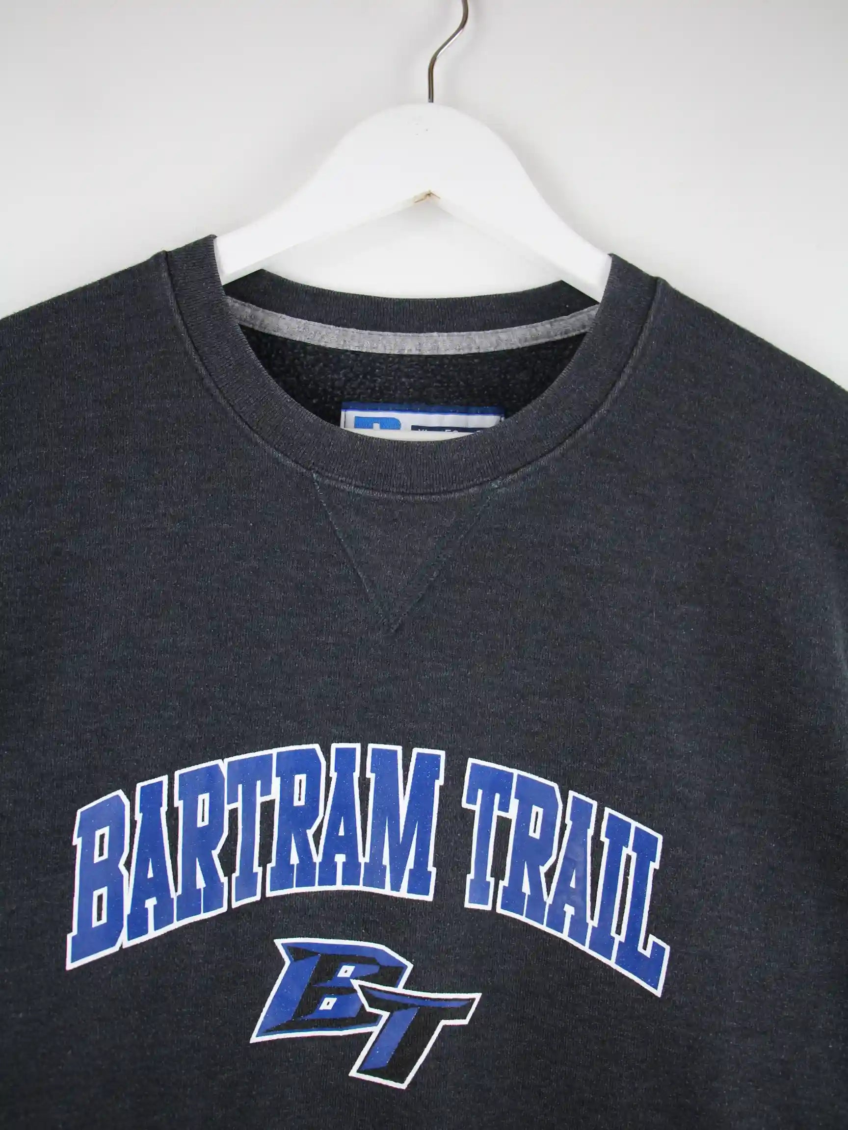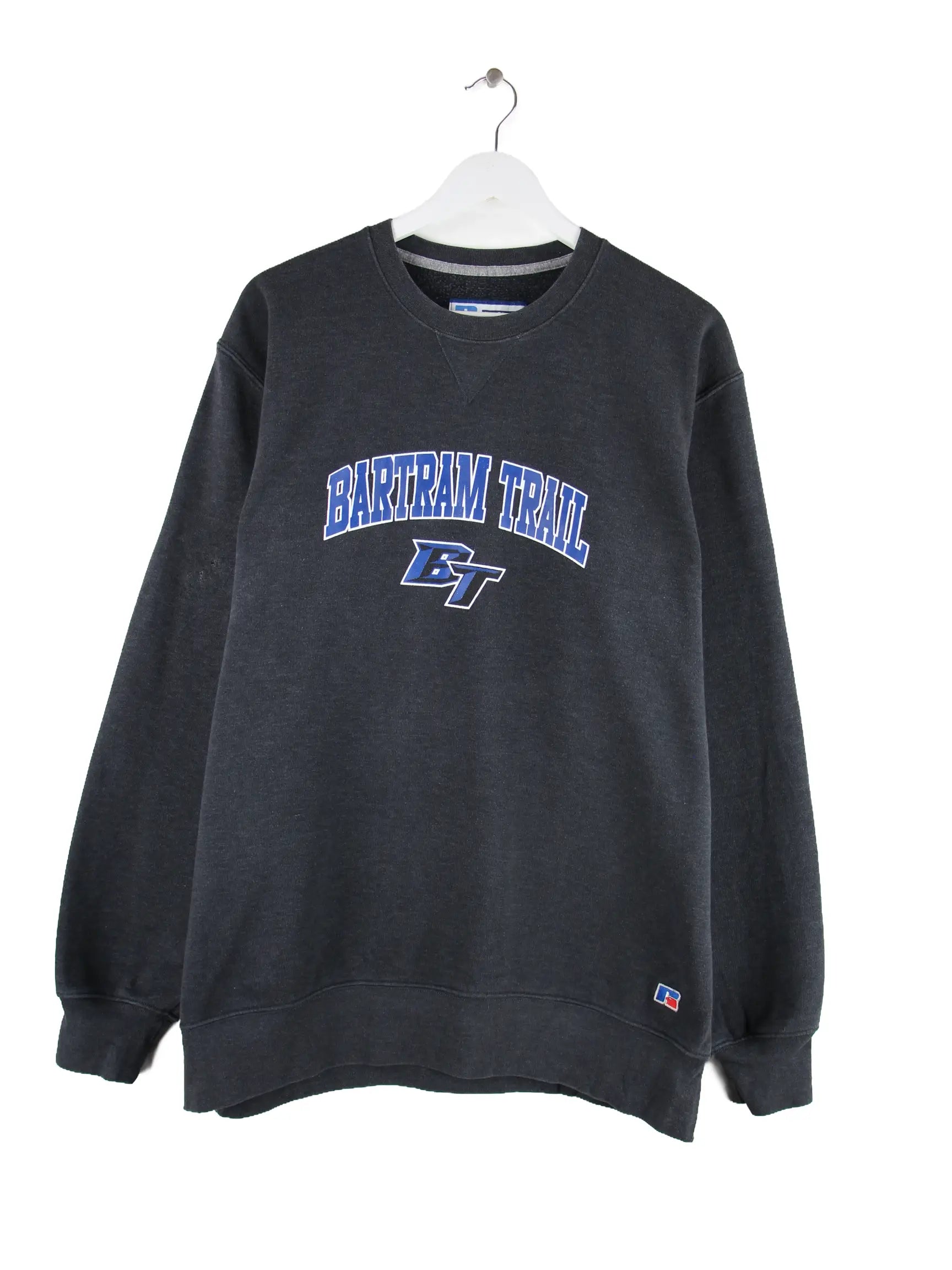 Grauer Sweater des Labels Russell Athletic in Größe XL. Er ist aus einer Baumwollmischung gemacht. Den Zustand würden wir als 'In Ordnung' bezeichnen (vergl. Bilder).Mit seltenem Trail Print.