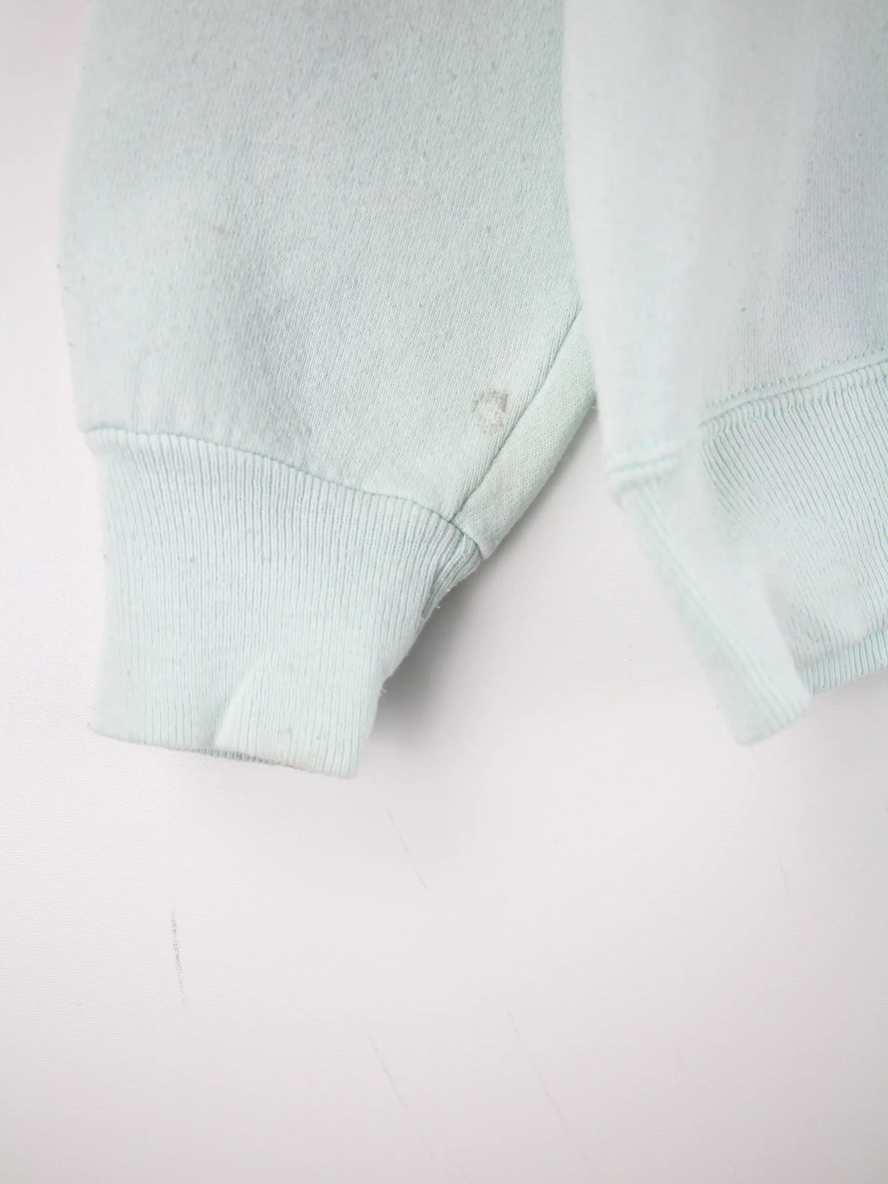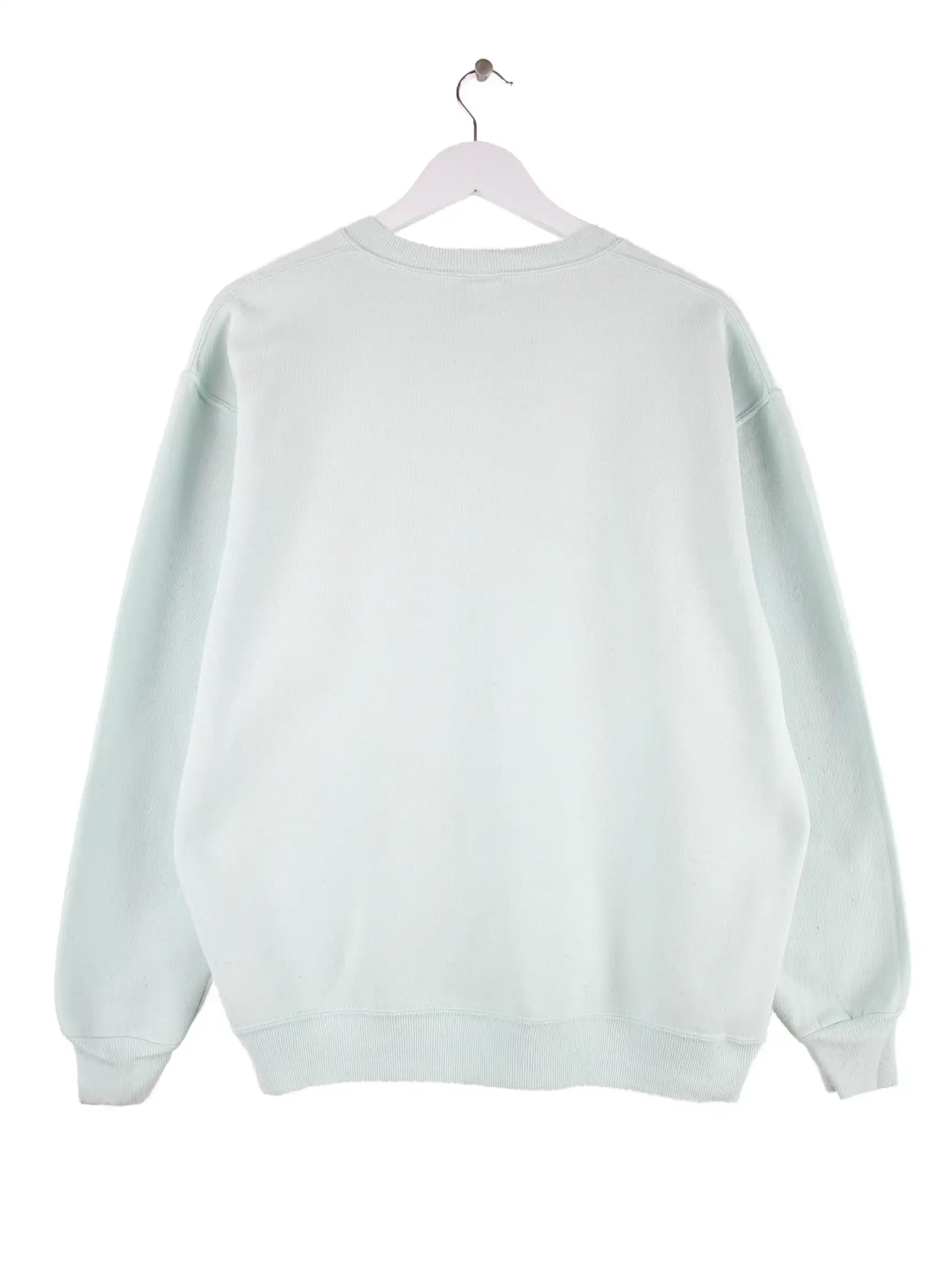 Türkisfarbener Sweater aus dem Hause Russell Athletic aus den 90'ern in Größe L. Er ist aus einer Baumwollmischung gefertigt. Den Zustand würden wir als 'In Ordnung' bezeichnen (vergl. Bilder).