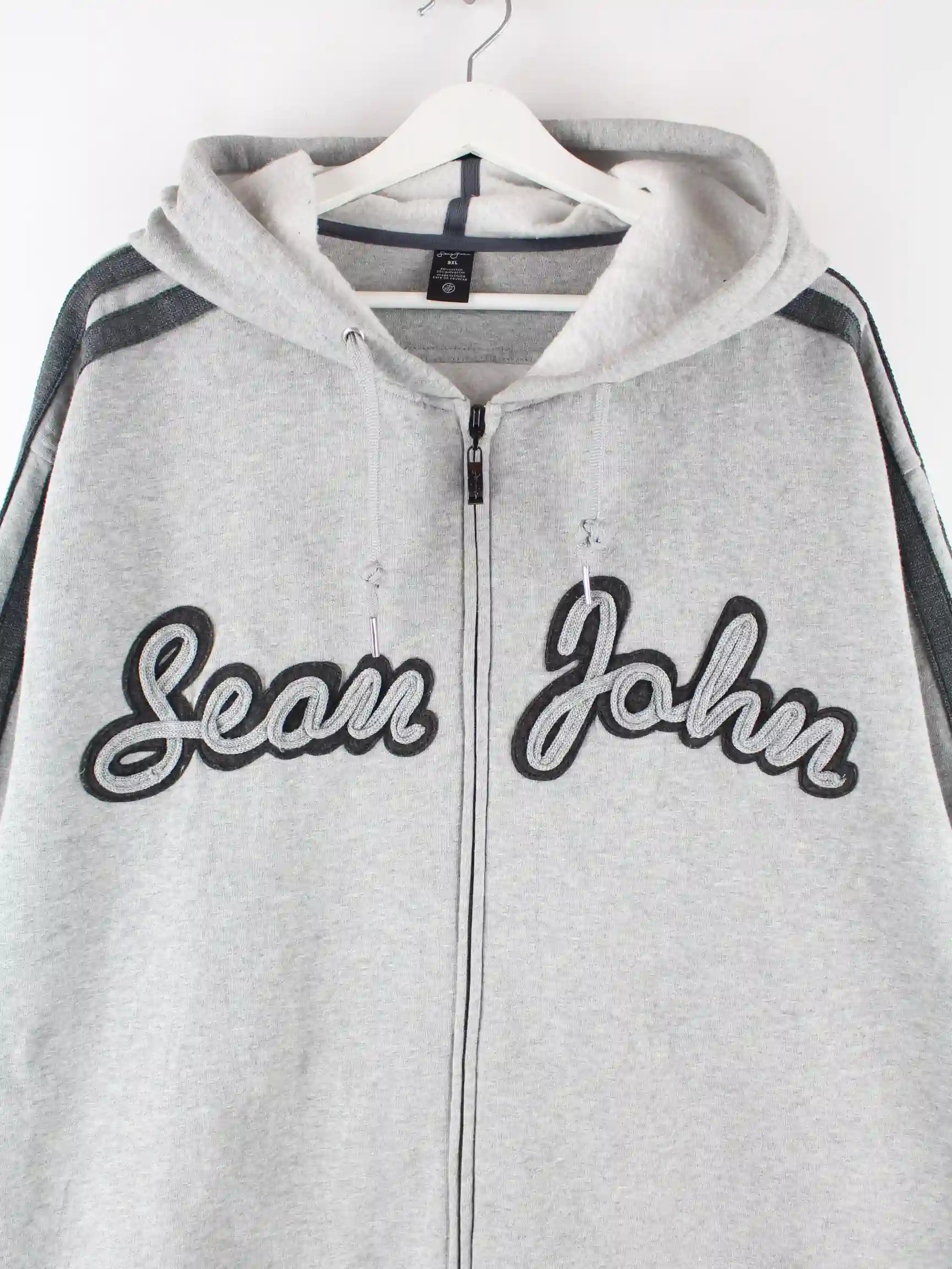 Hoodie vom Brand Sean John mit Stickereien und Reißverschluß in Größe 3XL aus Anfang der 2000'er. Er ist aus einer Baumwollmischung hergestellt und in Grau im Angebot.