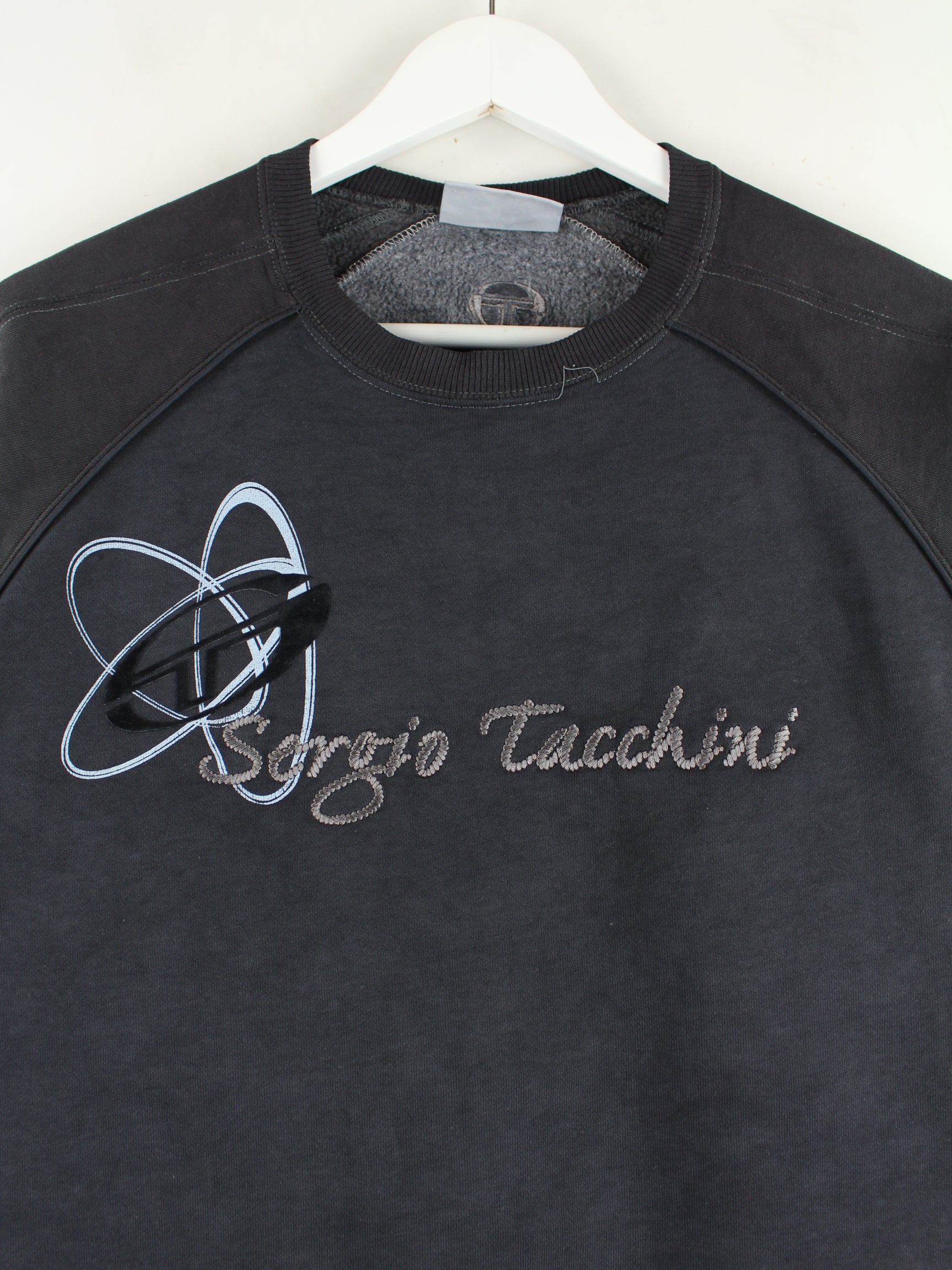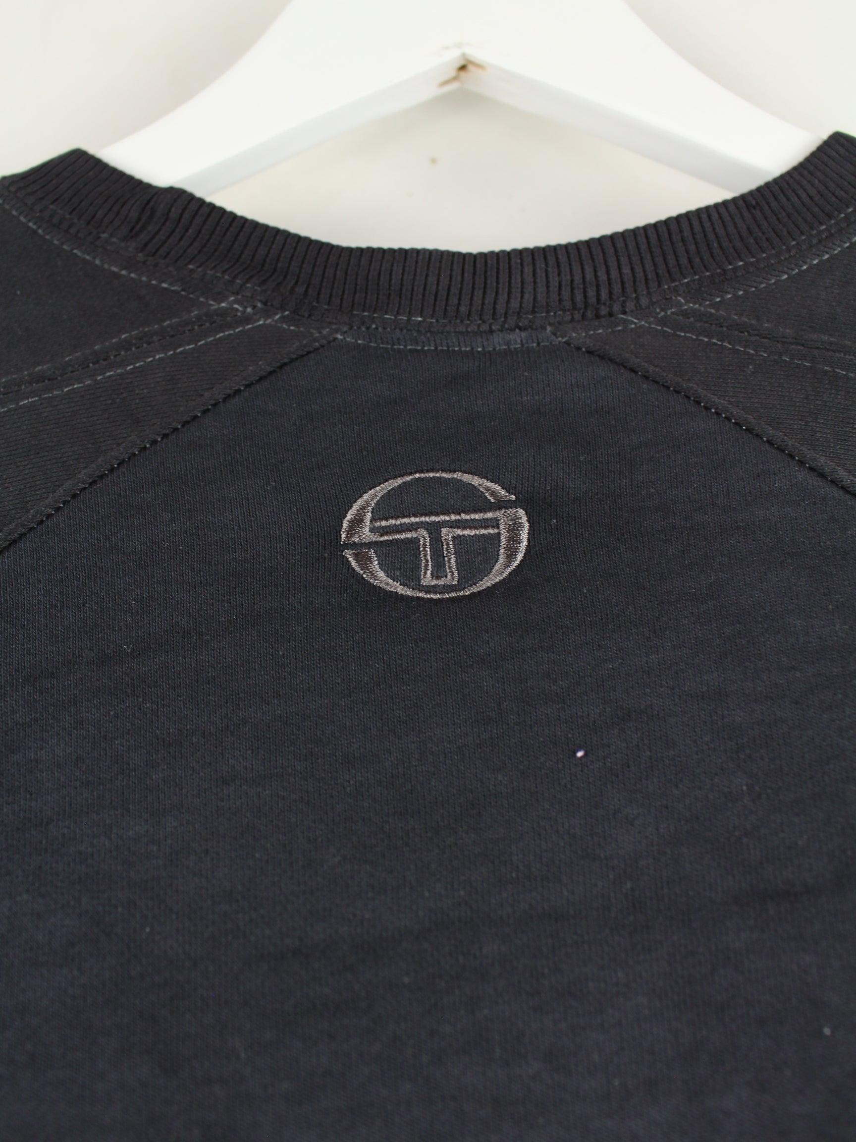 Black sweater with embroidery from the Sergio Tacchini label from the 90's in size M. It is made from a cotton blend and is available from us in good condition.