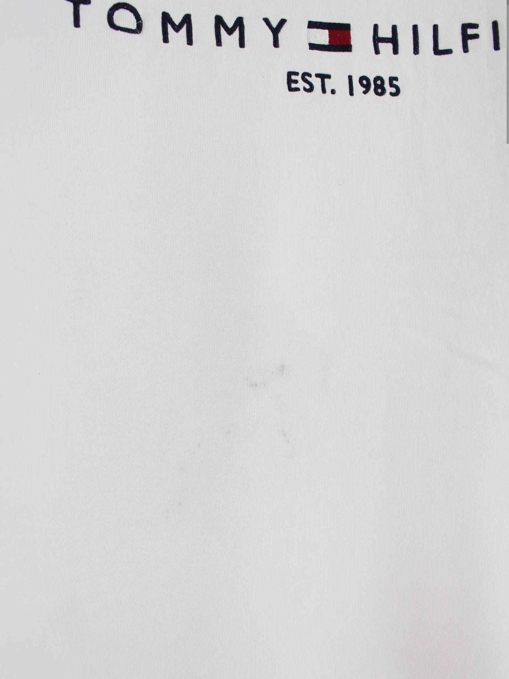 White sweater with embroidery from Tommy Hilfiger in size XL. It is made from a cotton blend. We would describe the condition as 'OK' (see pictures).