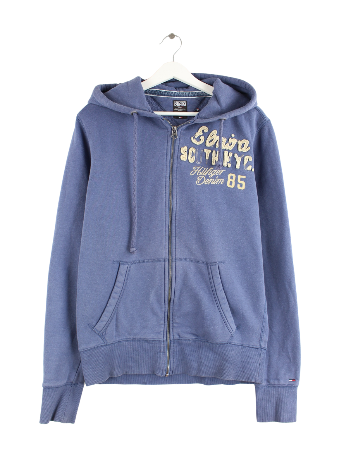 Hoodie from the label Tommy Hilfiger with embroidery and zipper in size M. It is made of a cotton blend and is available in blue.