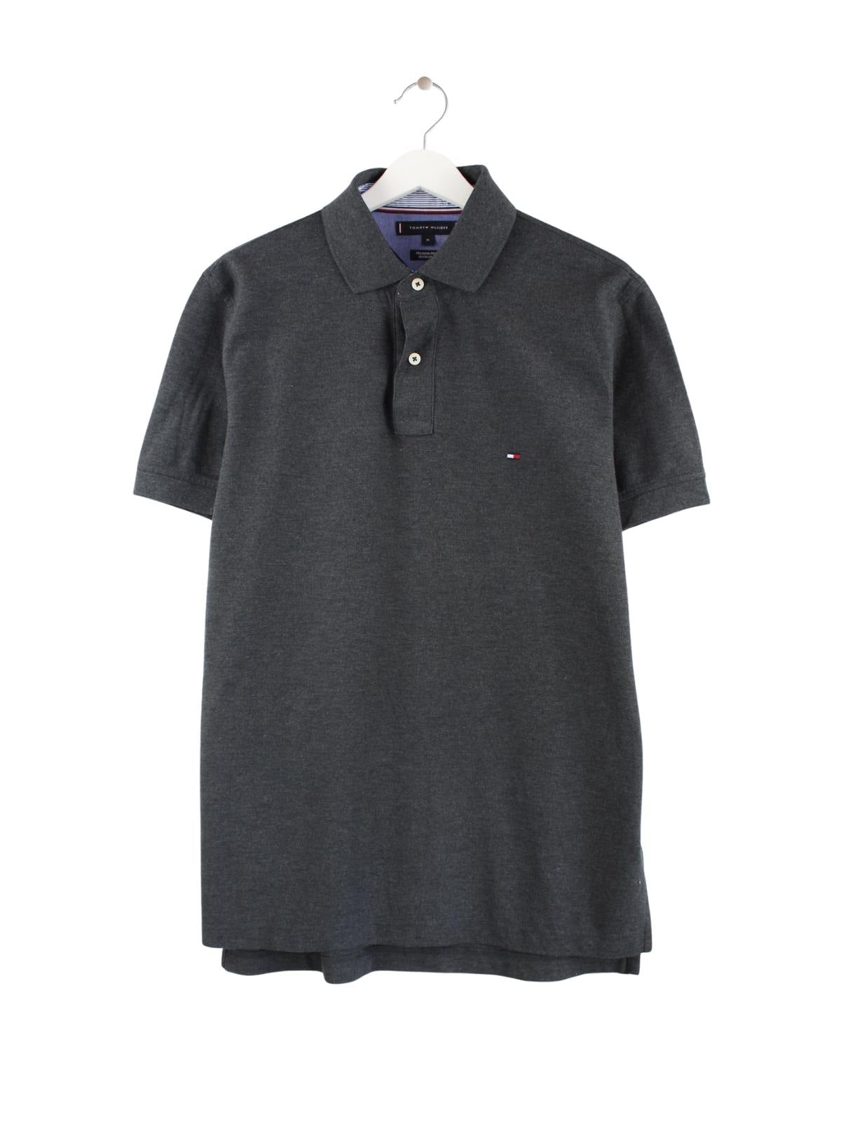 Graues Poloshirt vom Label Tommy Hilfiger in Größe M. Es ist aus Baumwolle und in sehr gutem Zustand vorrätig.