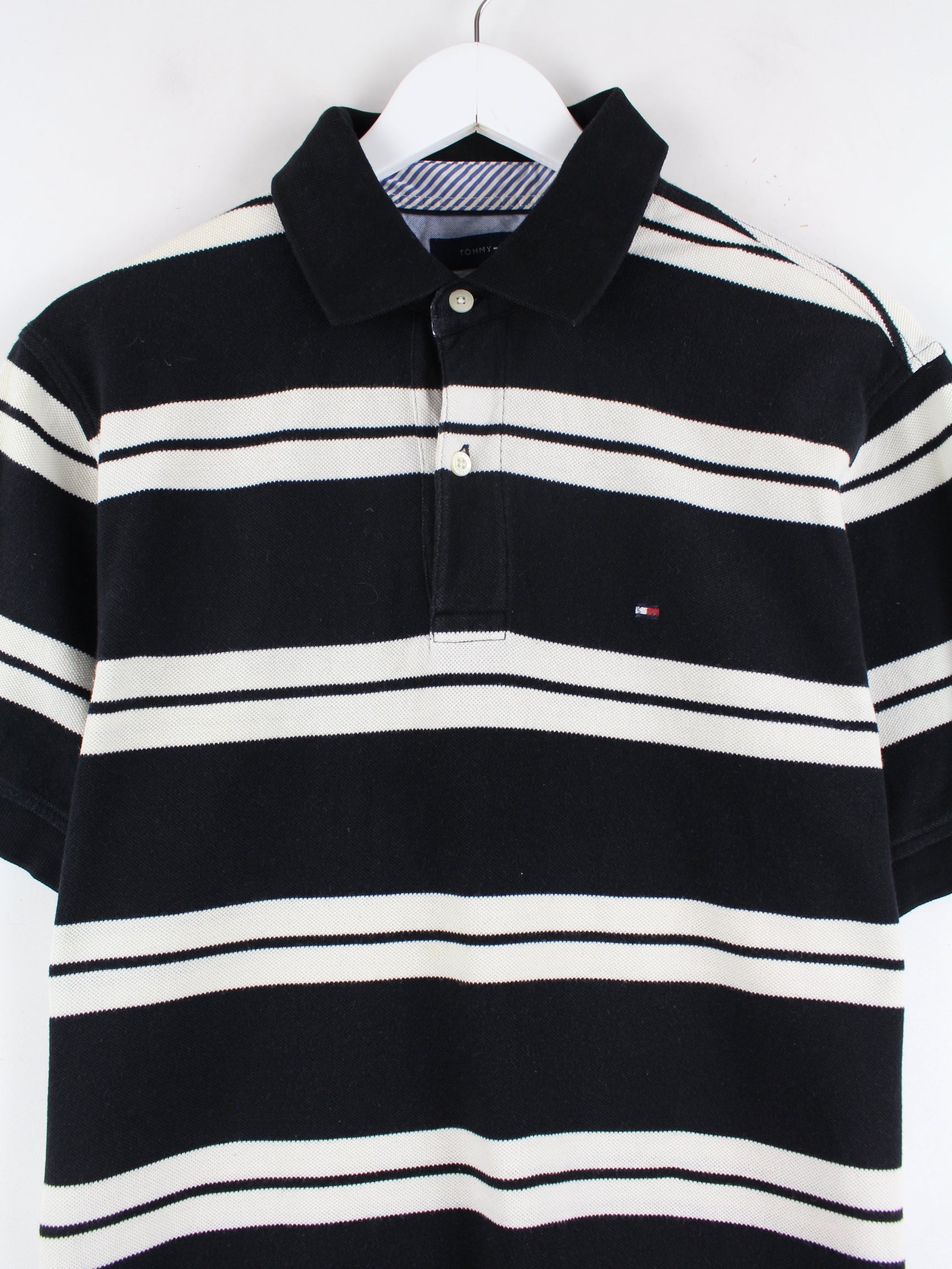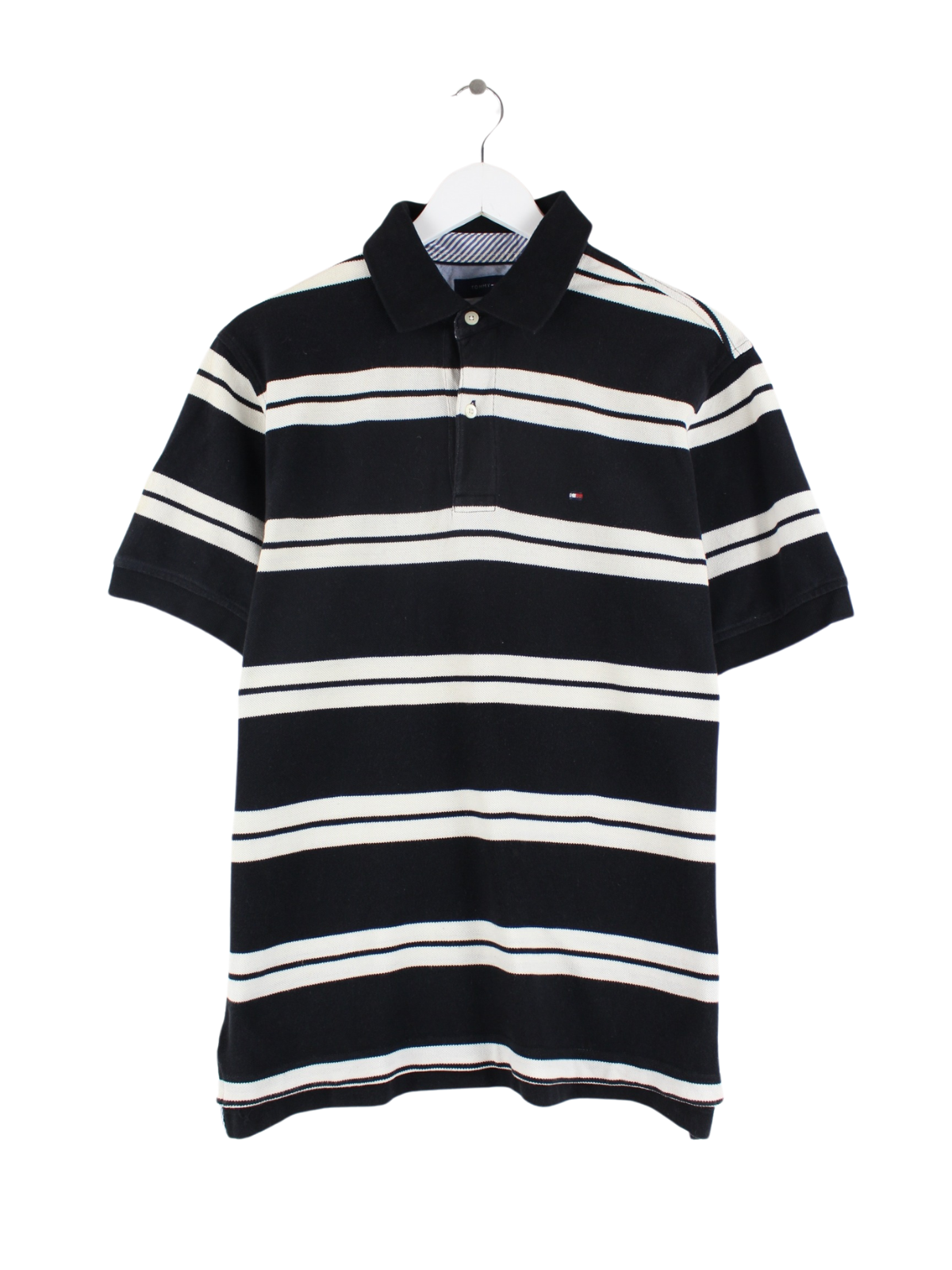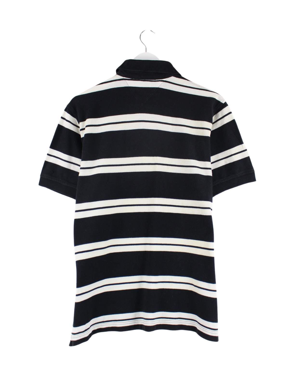 Schwarzes Poloshirt des Labels Tommy Hilfiger in Größe M. Es ist aus Baumwolle hergestellt und in sehr gutem Zustand bei uns vorrätig.