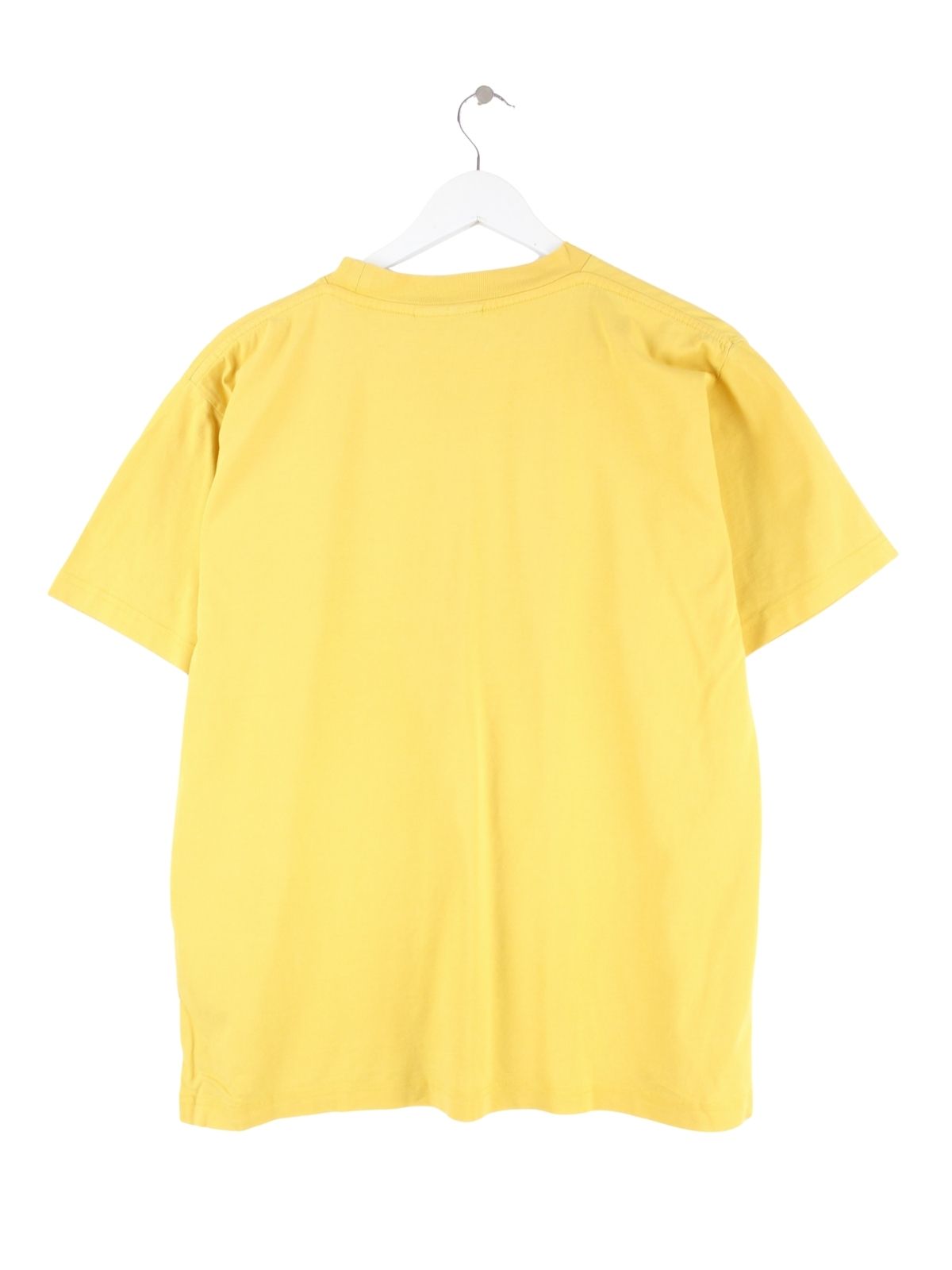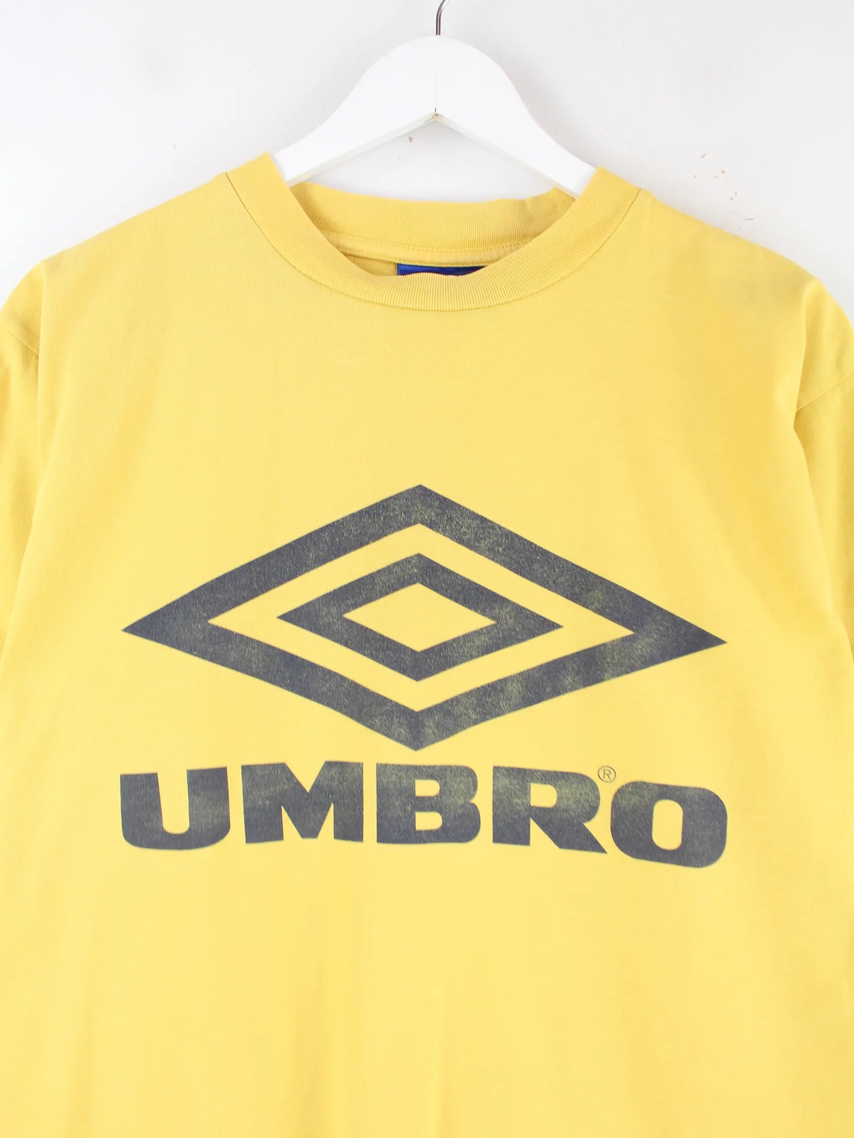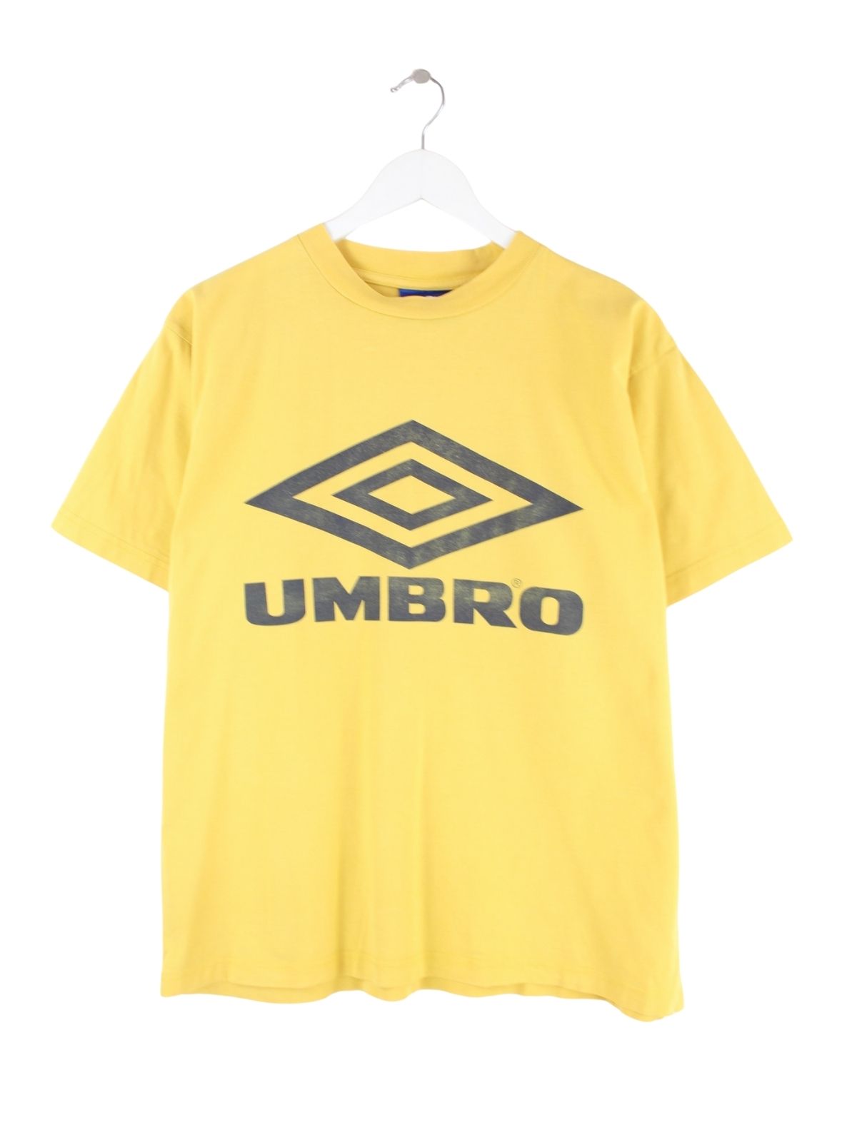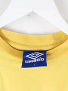 T-Shirt vom Label Umbro in Größe S aus den 90'ern. Es ist aus Baumwolle hergestellt und in Gelb im Angebot. Mit seltenem Vintage Print.