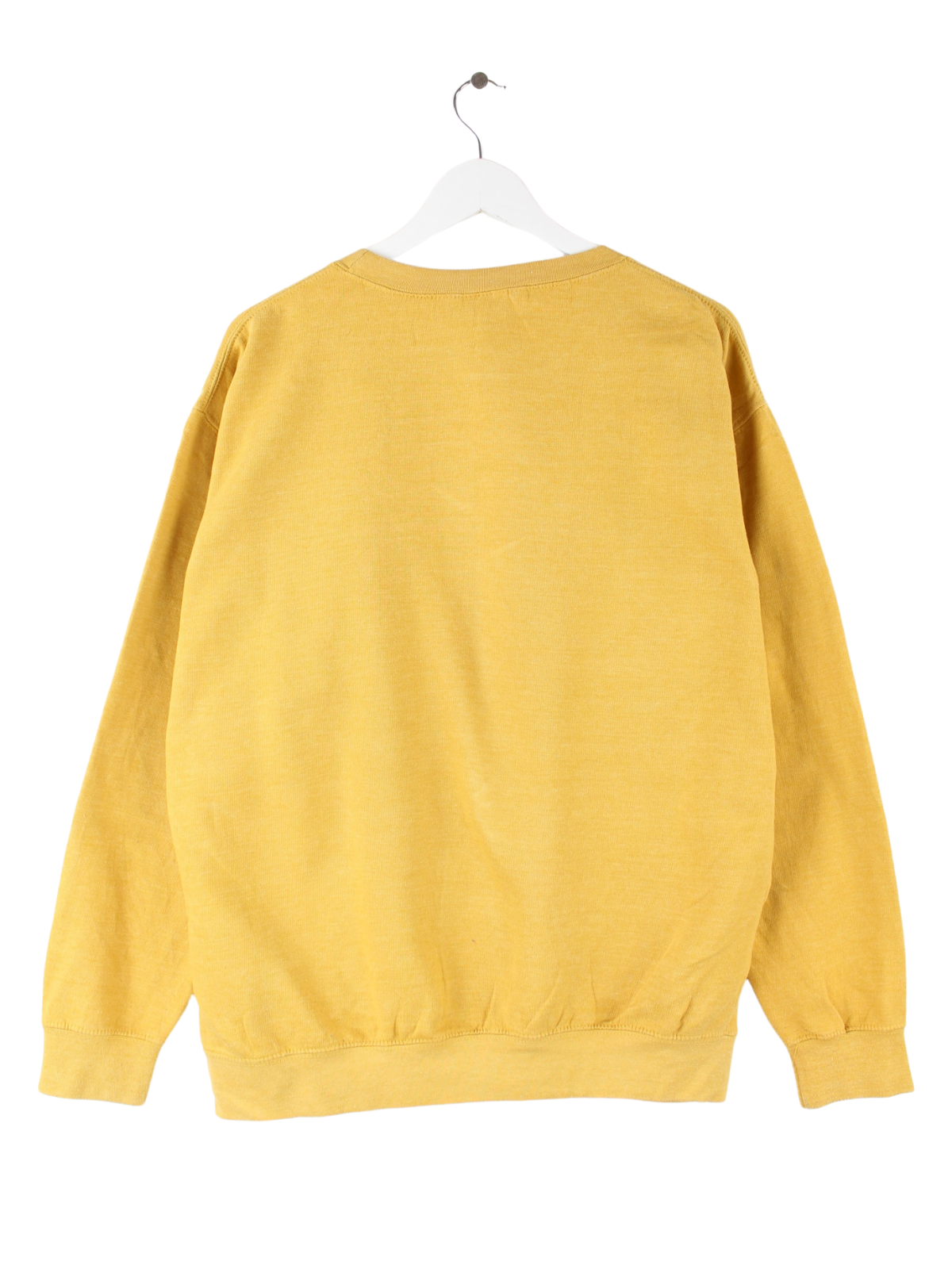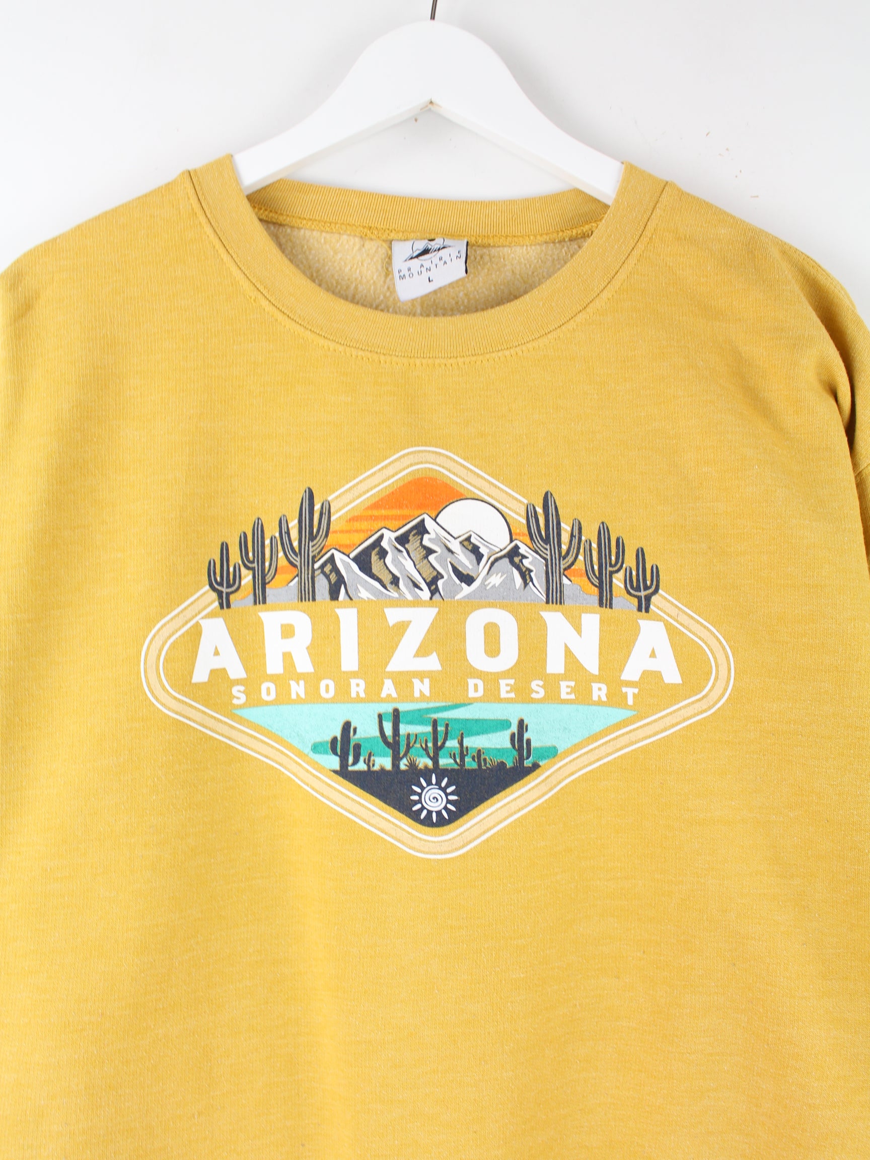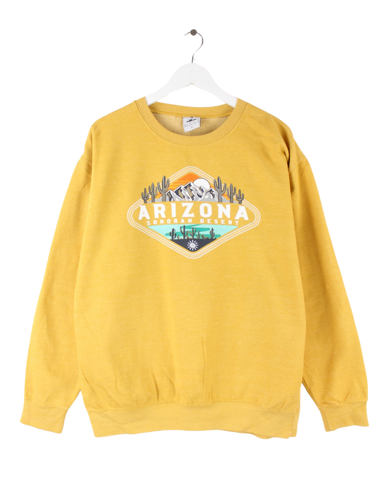 Gelber Vintage Sweater in Größe L. Er ist aus einer Baumwollmischung gefertigt und in gutem Zustand bei uns zu bekommen. Mit schönem Arizona Print.