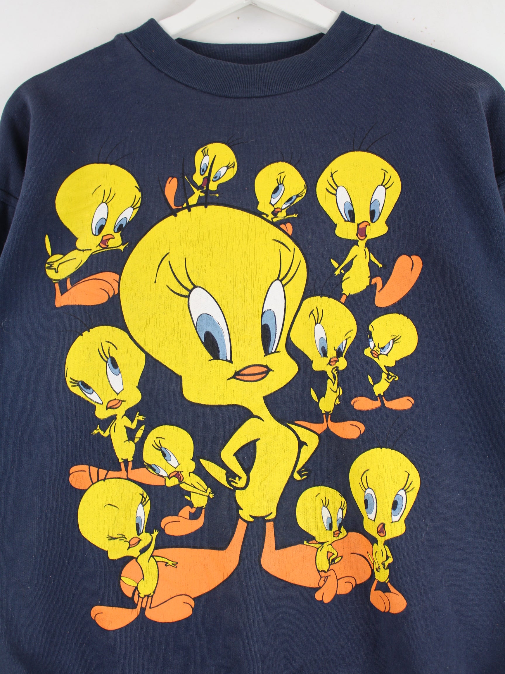 Vintage Sweater in Größe XL. Er ist aus einer Baumwollmischung hergestellt und in Blau vorrätig. Mit schönem DC Print.