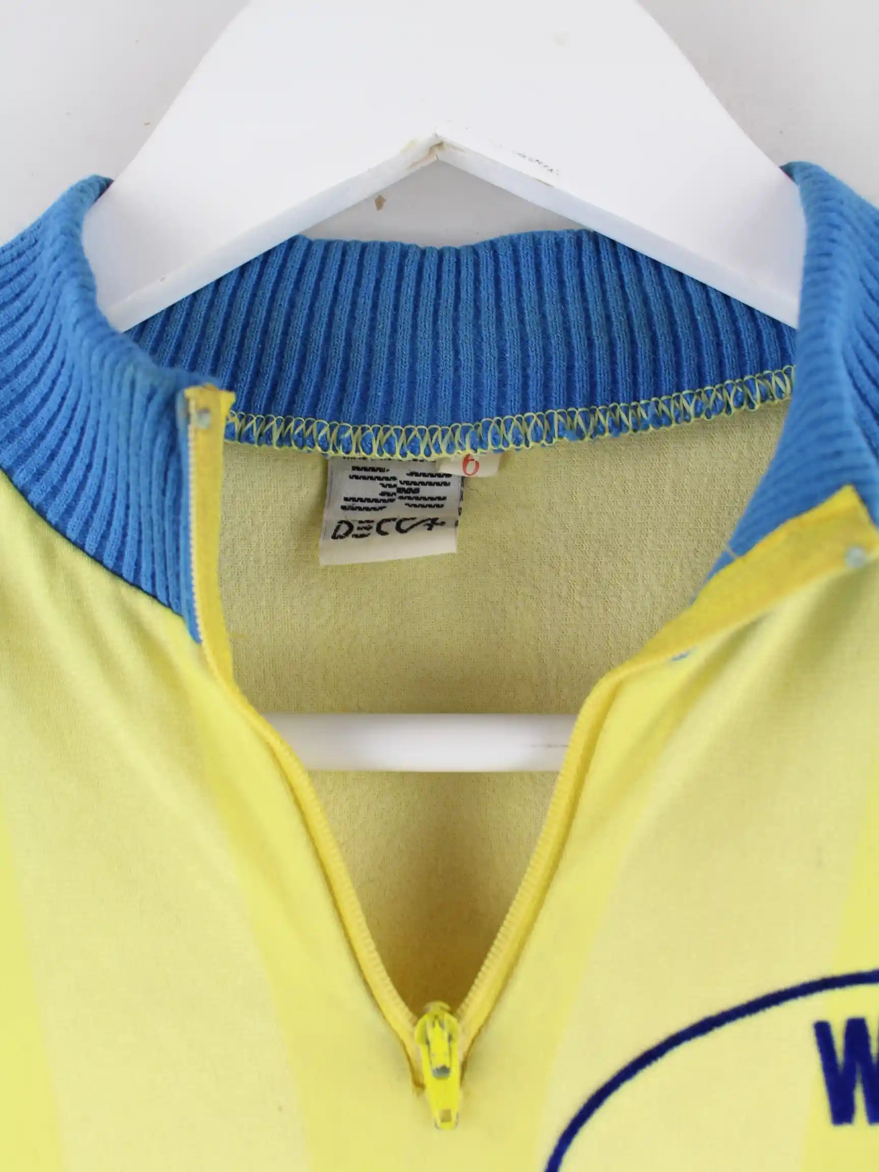 Gelbes Vintage Trikot aus den 80'ern in Größe L. Es ist aus Synthetik hergestellt. Den Zustand würden wir als 'In Ordnung' bezeichnen (vergl. Bilder).