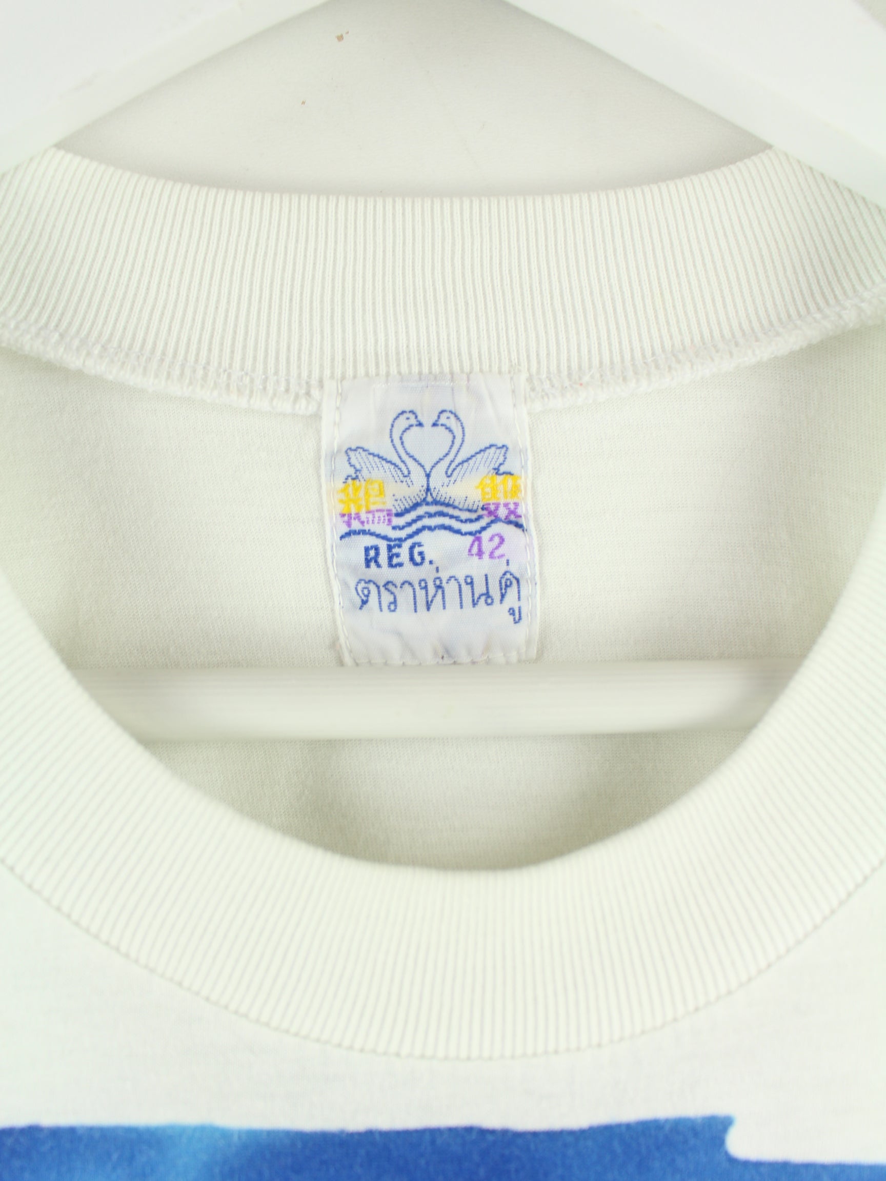 White vintage T-shirt from the 80's in size M. It is made from a cotton blend and is available from us in good condition. With a beautiful rainforest print.