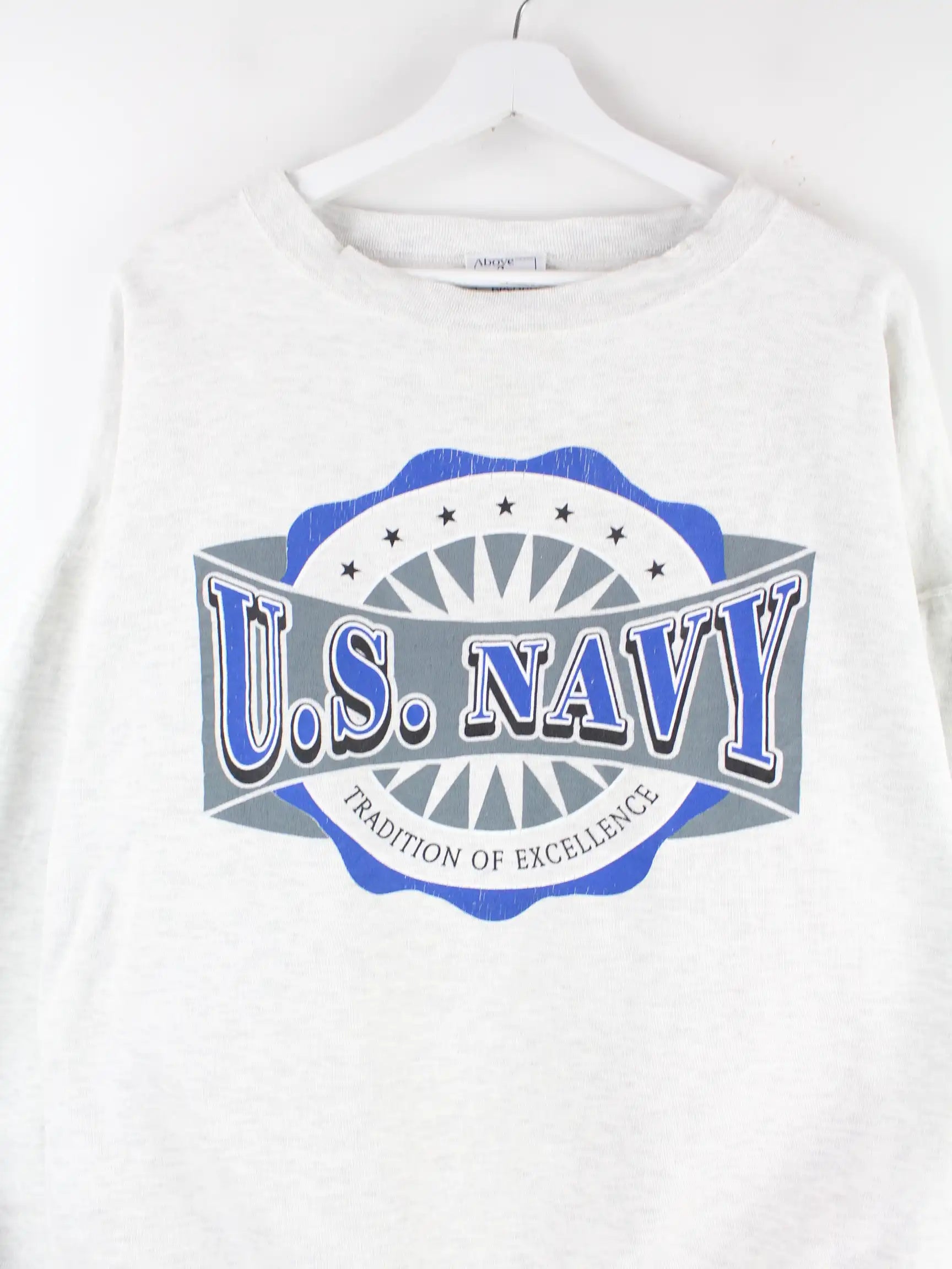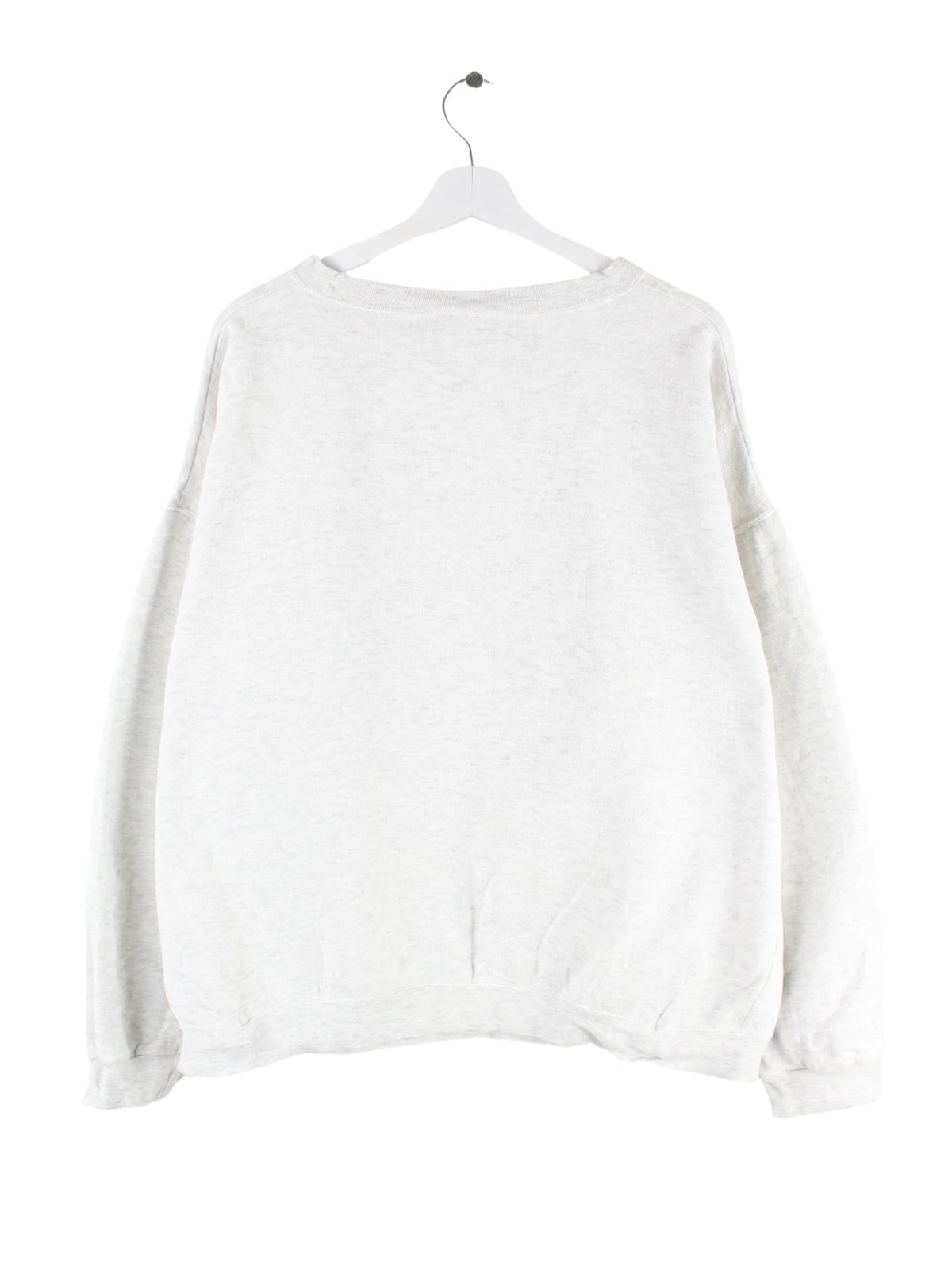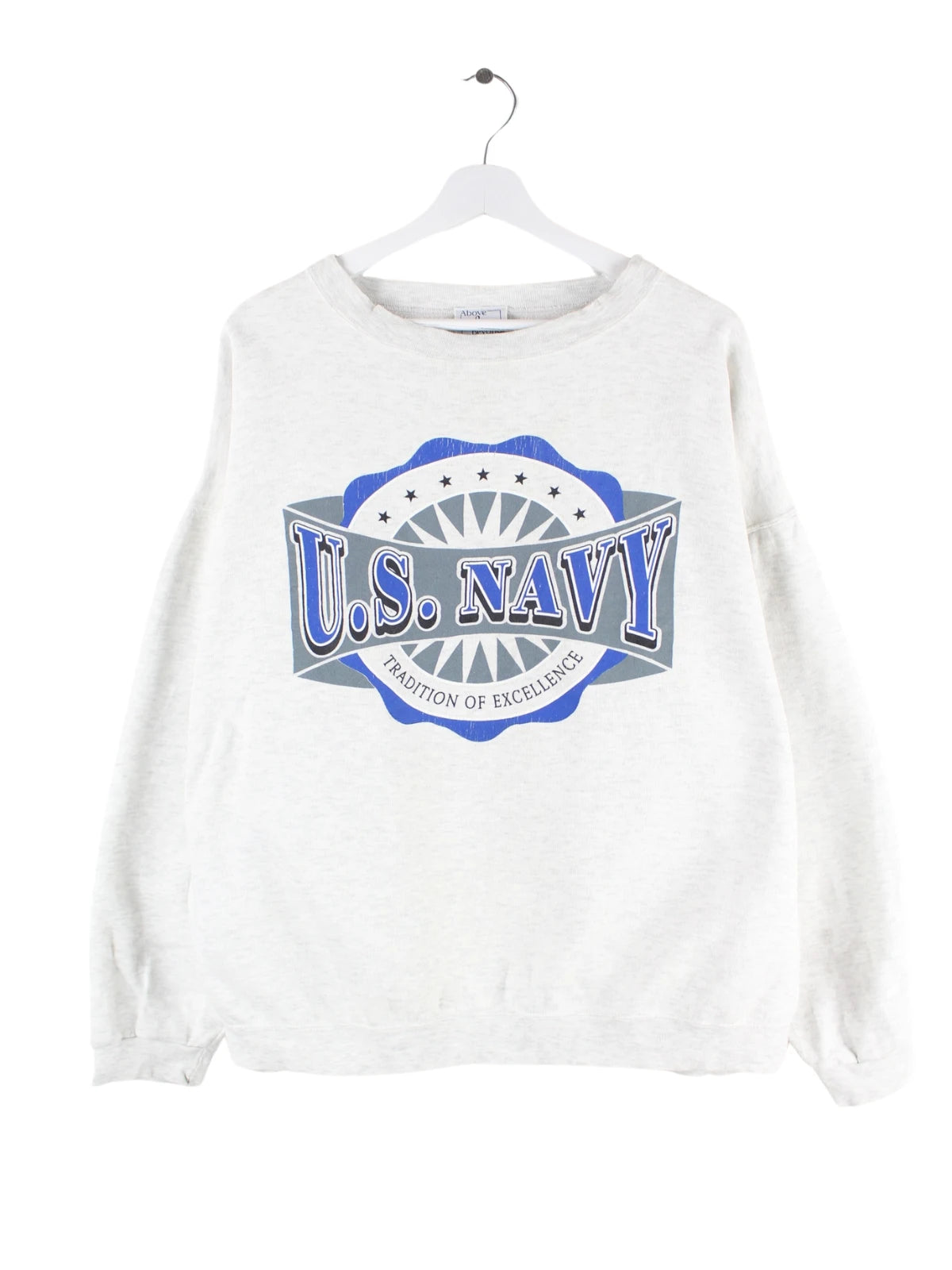 Grauer Vintage Sweater aus den 80'ern in Größe XL. Er ist aus einer Baumwollmischung gemacht und in sehr gutem Zustand bei uns vorrätig. Mit tollem Navy Print.