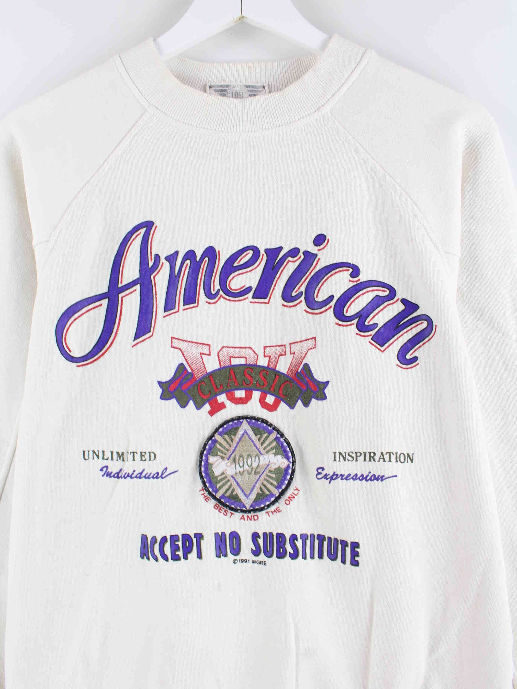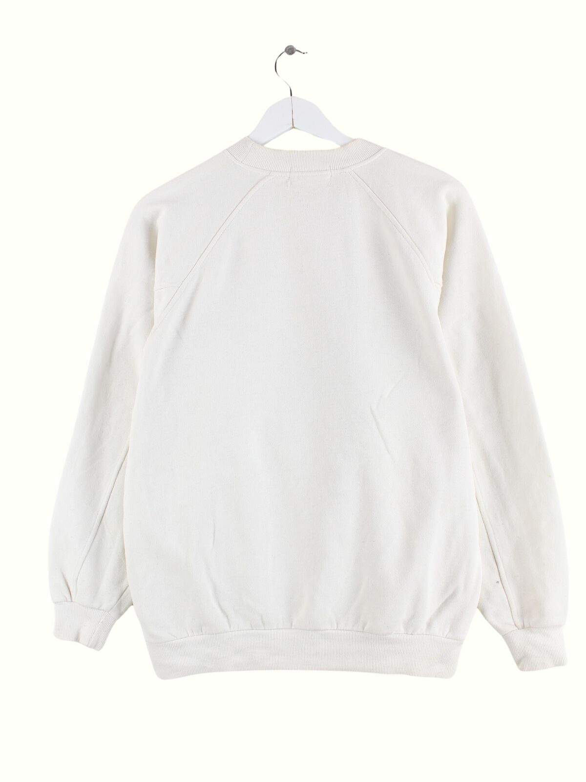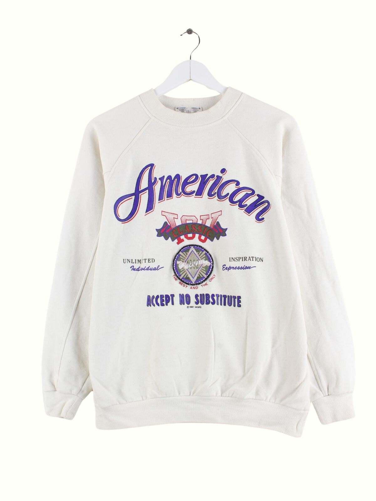 Vintage sweater in size M from the 80's. It is made from a cotton blend and is available from us in white. With a great America print.