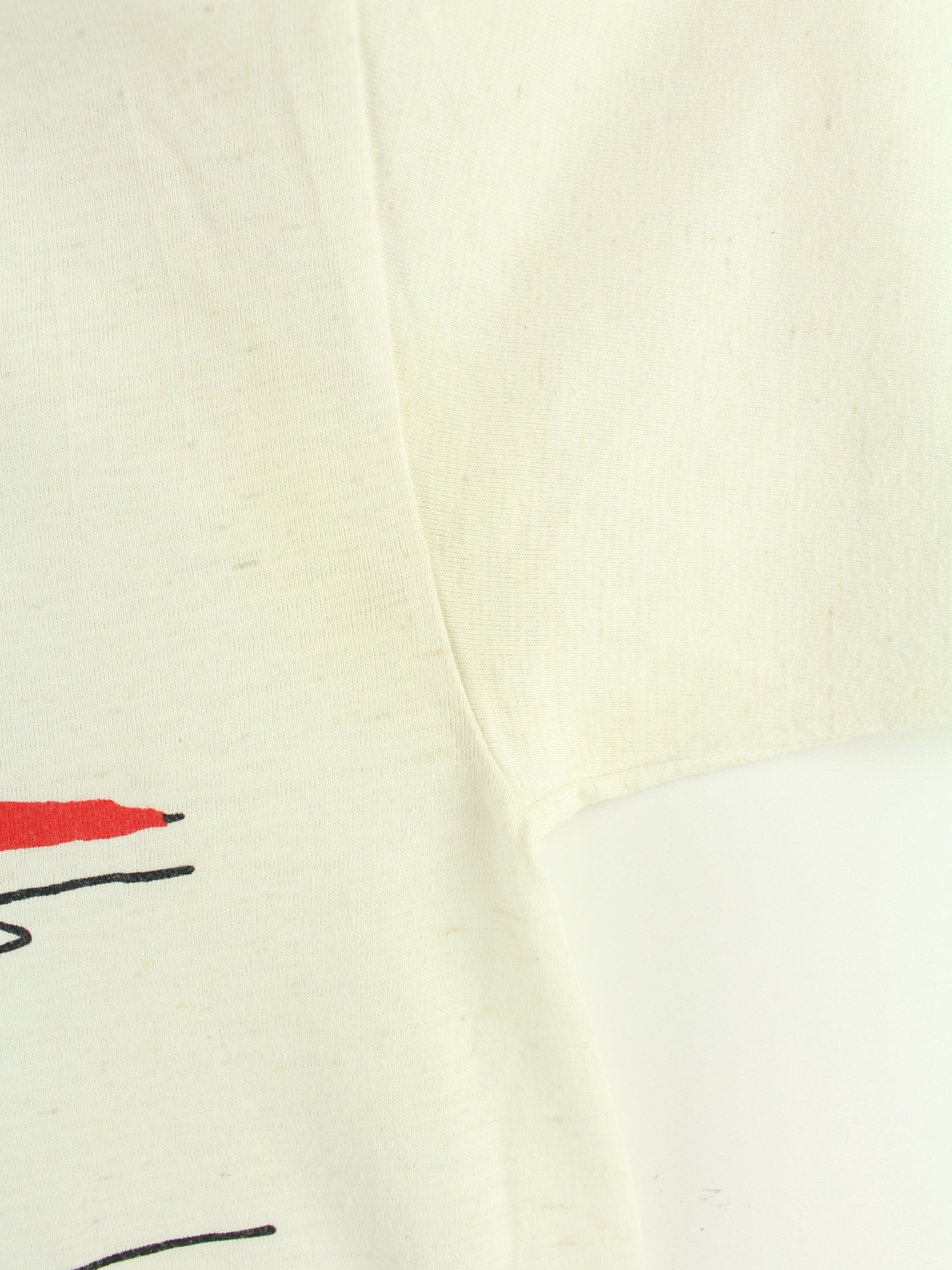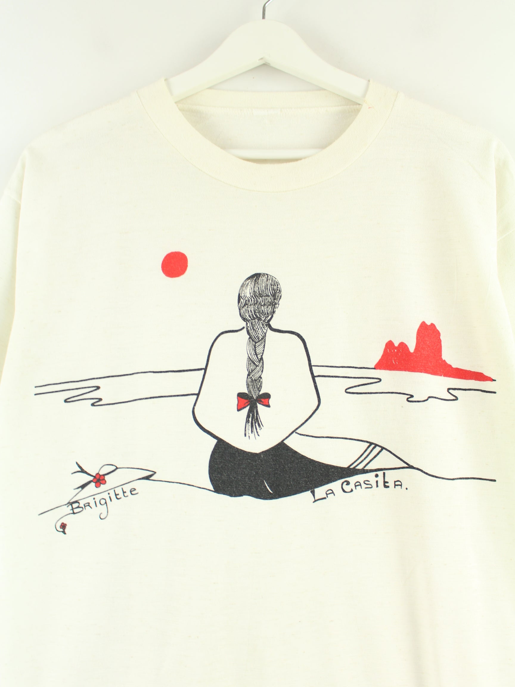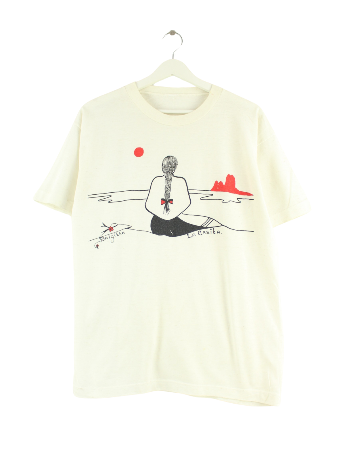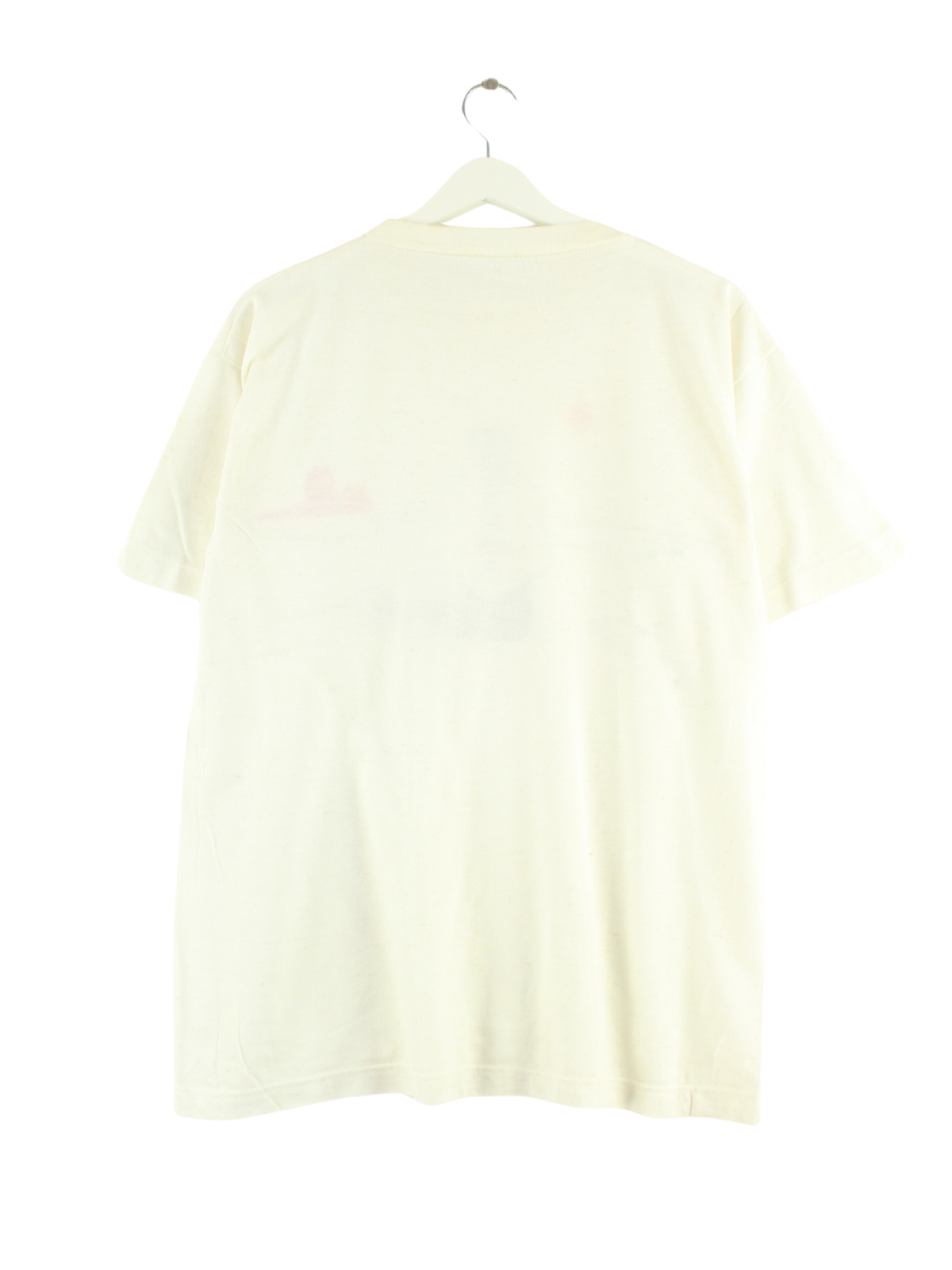 Beige vintage T-shirt from the 80's in size M. It is made of a cotton blend and is in good condition. With a great vintage print.