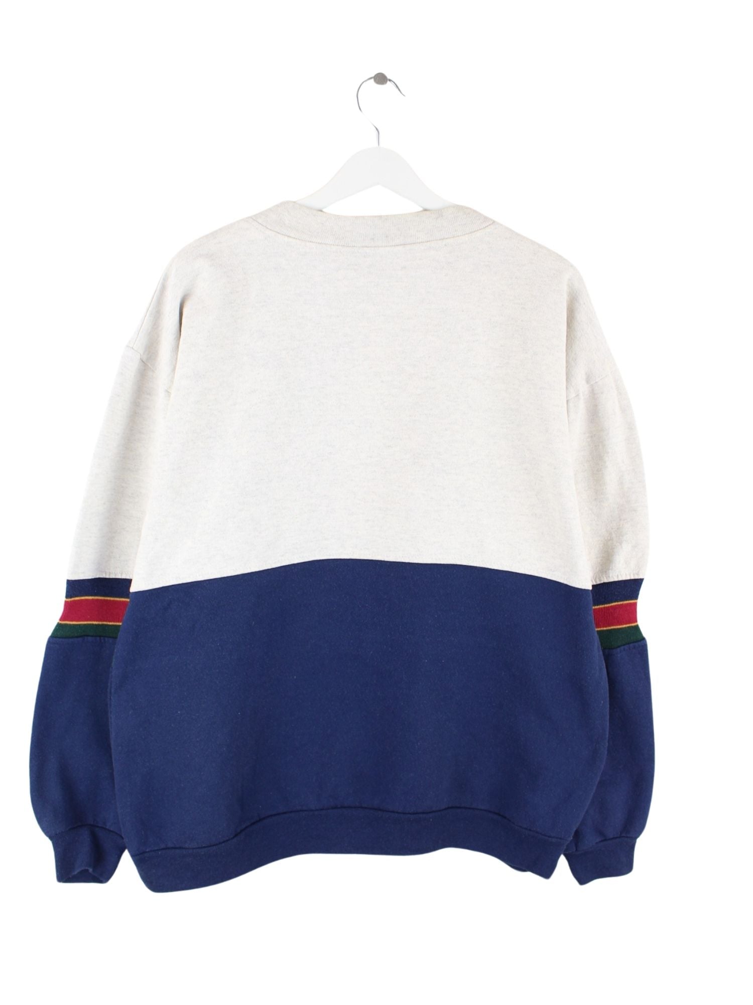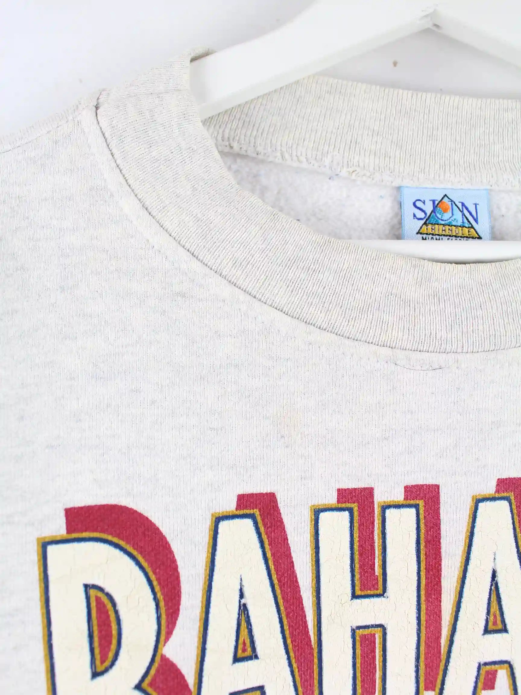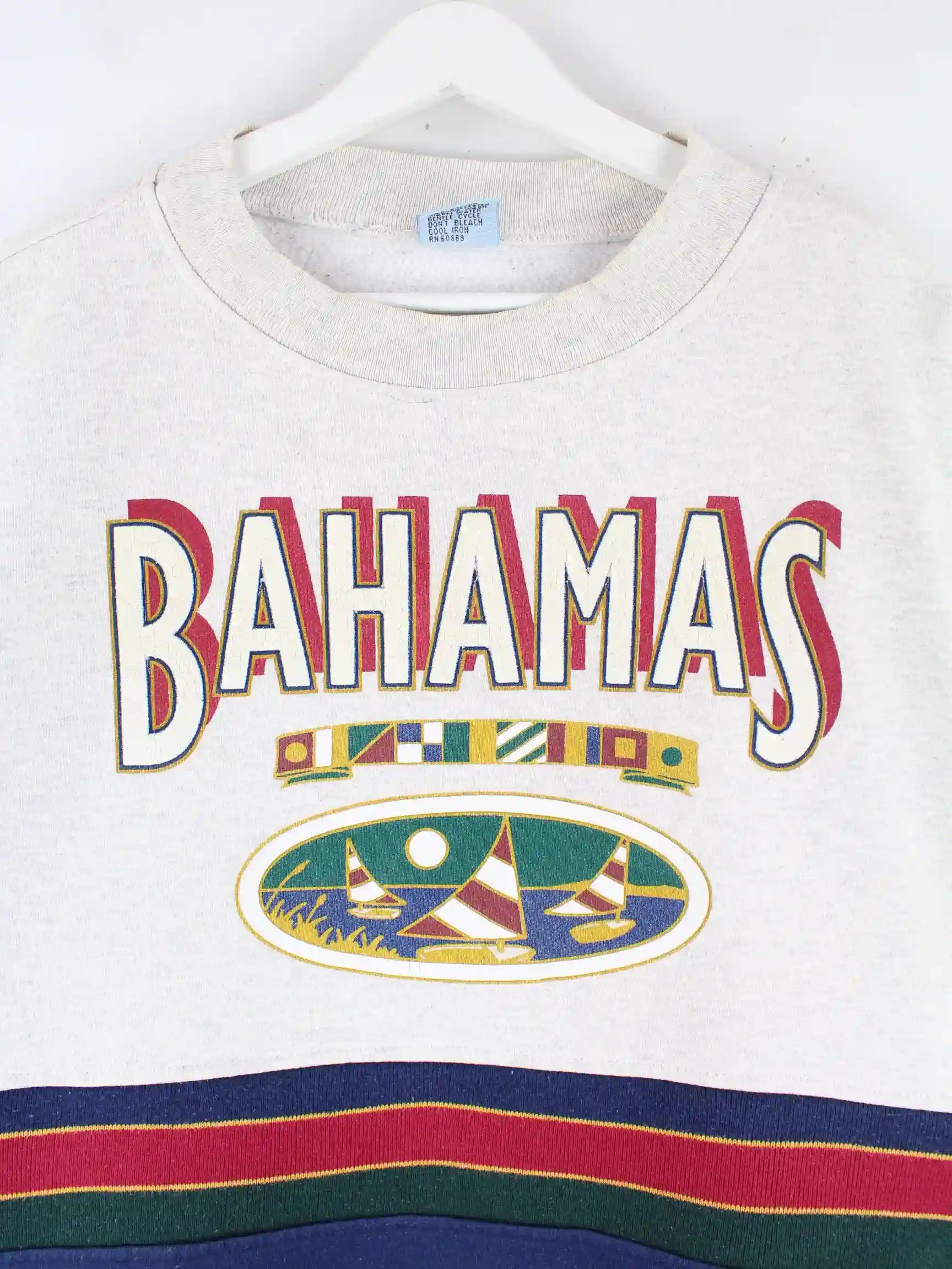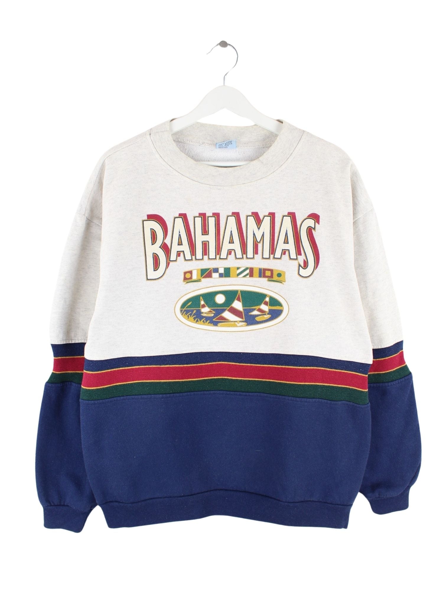 Vintage Sweater in Größe L aus den 90'ern. Er ist aus einer Baumwollmischung und in Grau lieferbar. Mit seltenem Bahama Print.