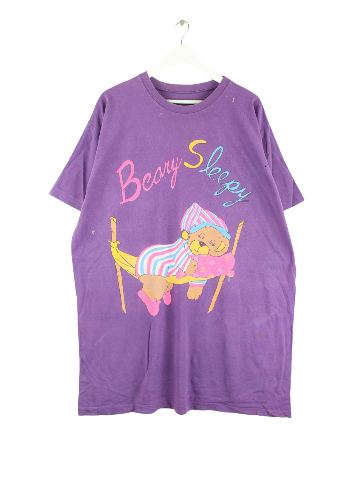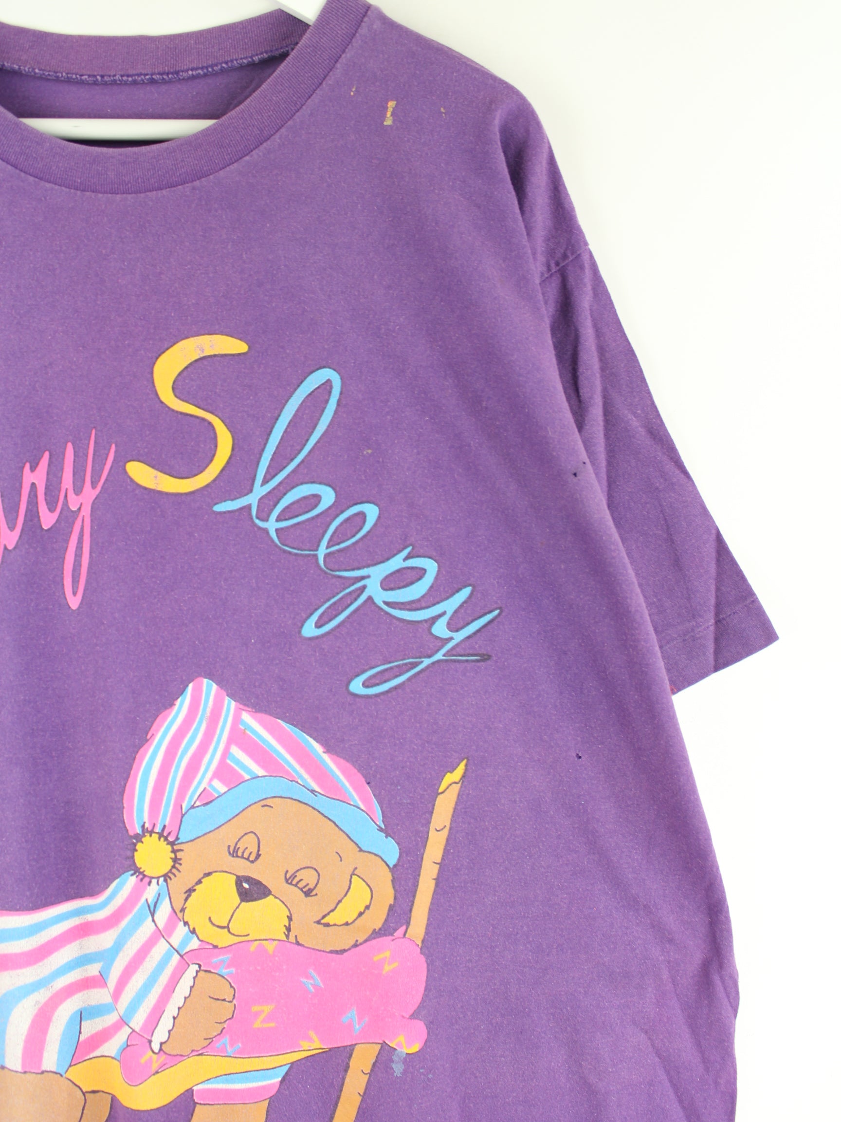 Vintage T-shirt in size 3XL from the 90's. It is made of cotton and comes in purple. With a great sleepy print.
