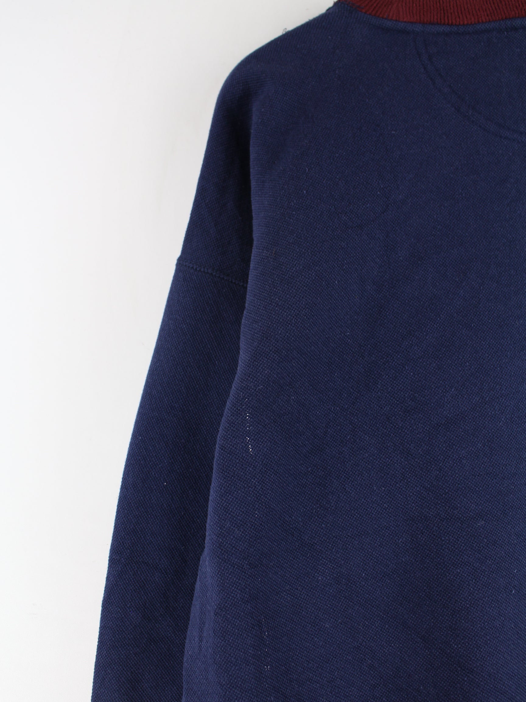 Vintage Sweater mit gesticktem Logo in Größe L aus den 90'ern. Er ist aus einer Baumwollmischung produziert und in Blau auf Lager.