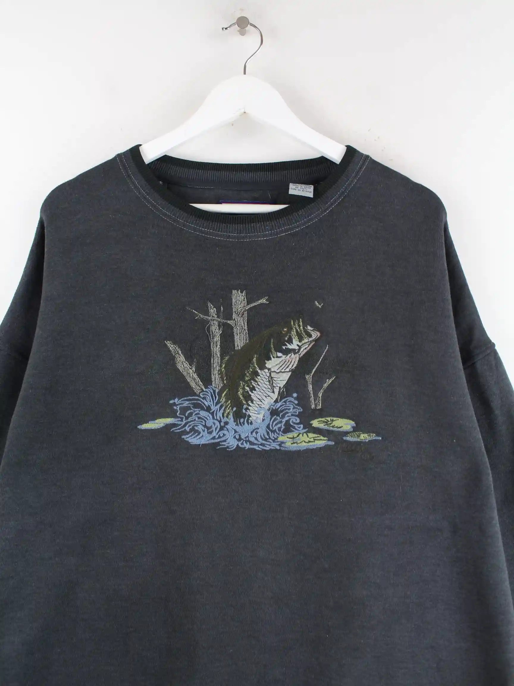 Vintage 90s Embroidered Fish Heavy Sweater Grau XXL