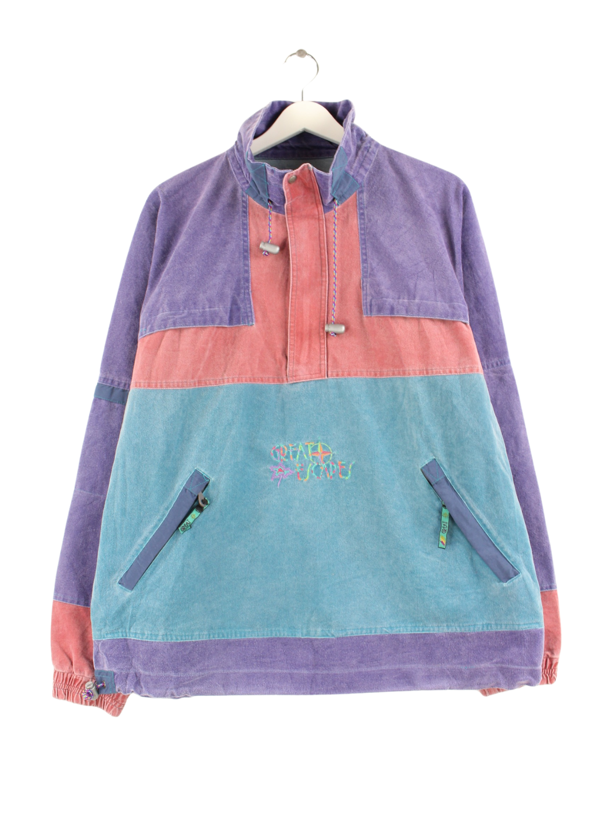 Vintage track jacket with embroidery and half zip in size L from the 90s. It is made of synthetic material and is available in bright colors.