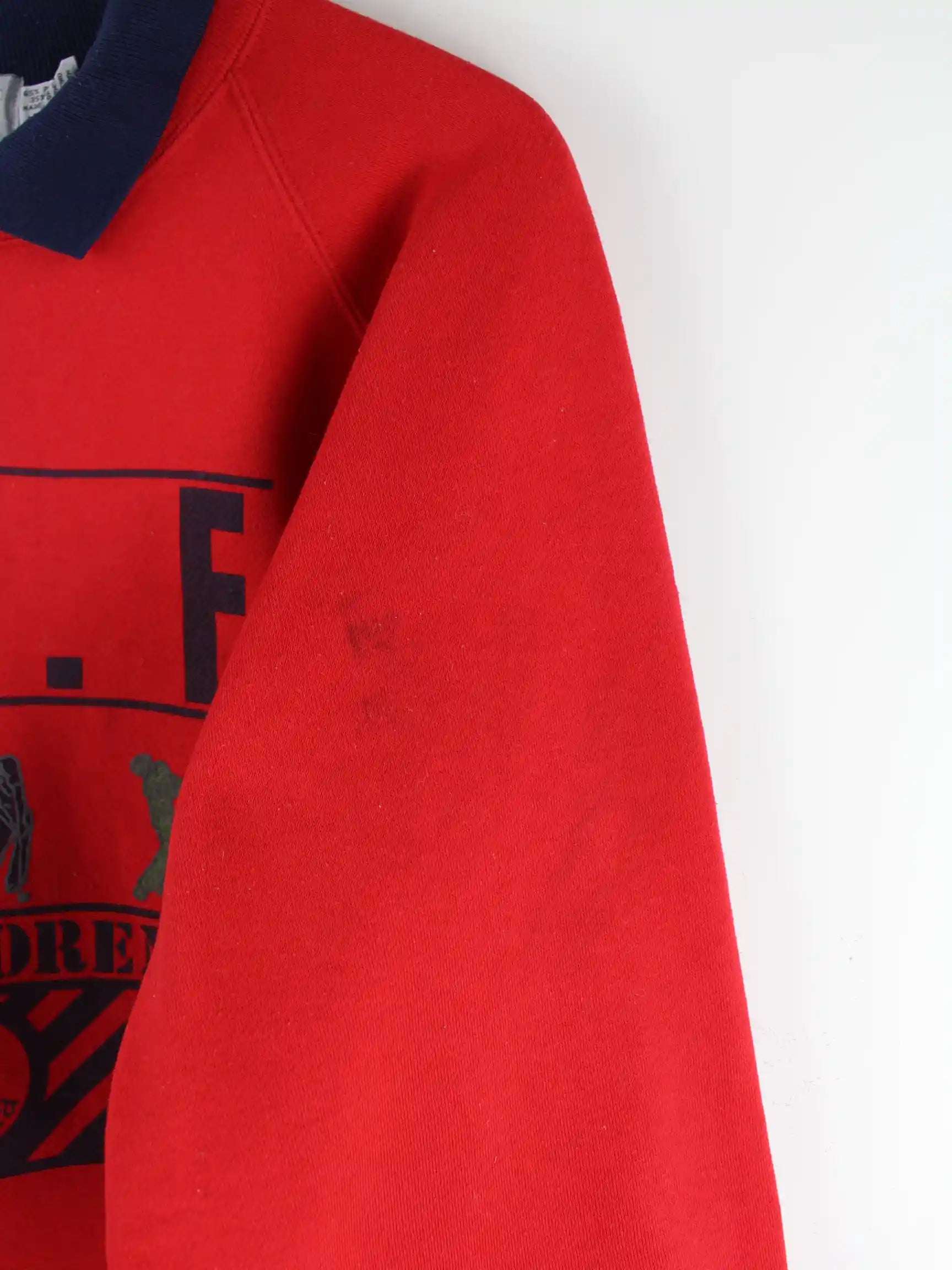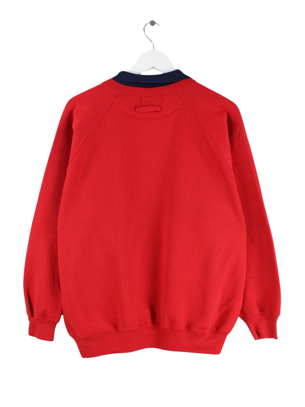 Vintage Sweater in Größe L aus den 90'ern. Er ist aus einer Baumwollmischung gefertigt und in Rot bei uns vorrätig. Mit chiquem Golf Print.