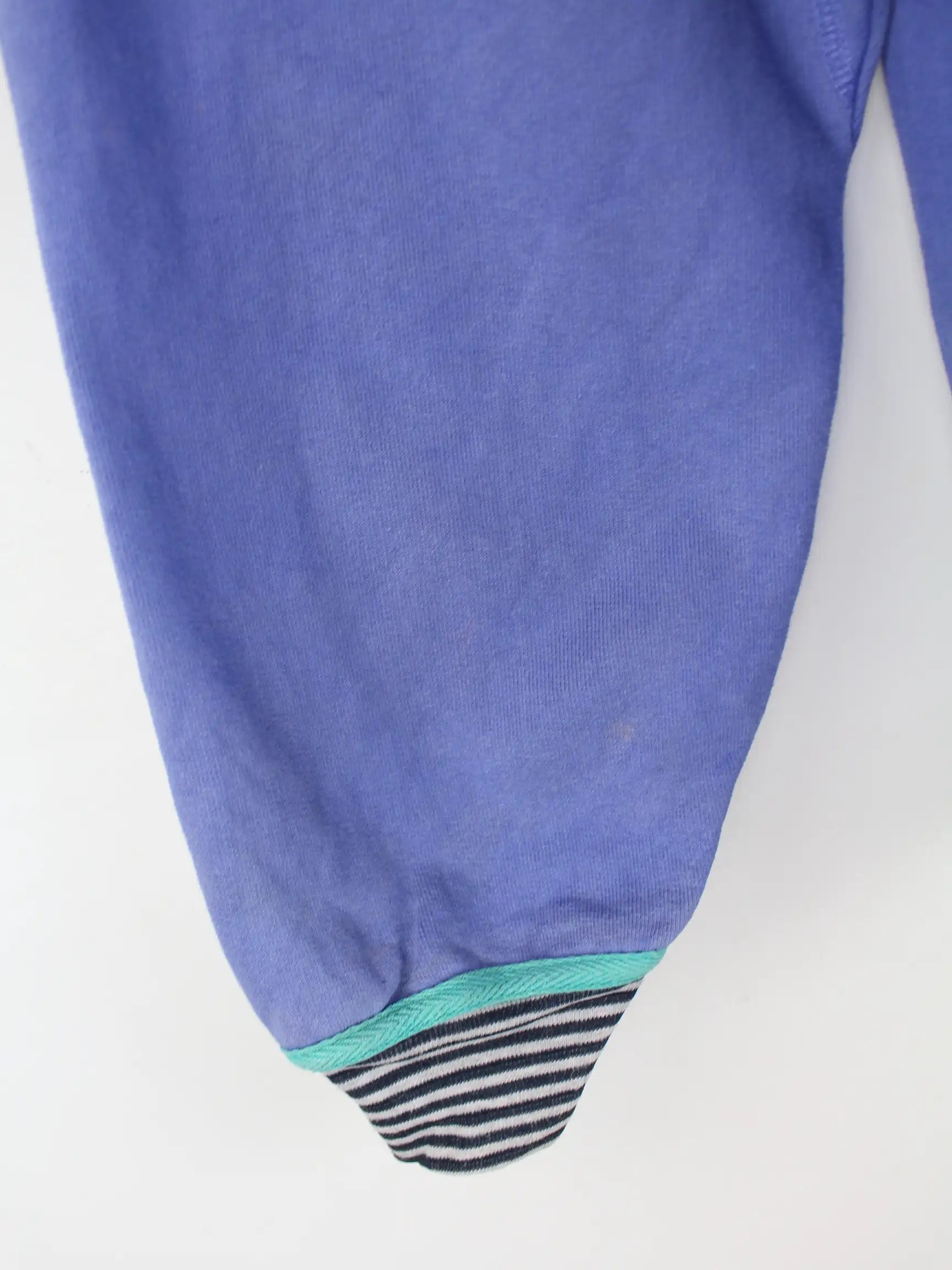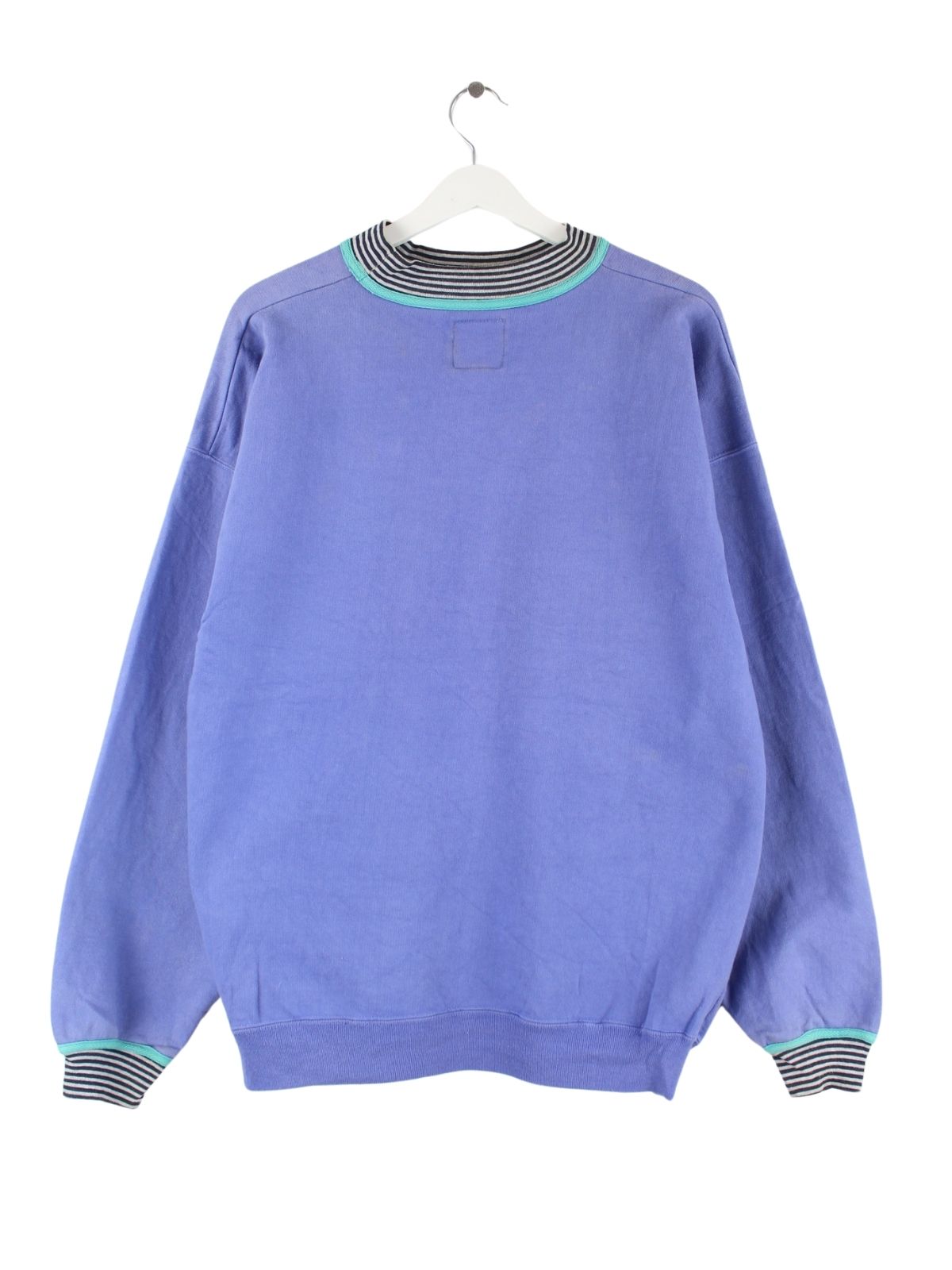 Blauer Vintage Sweater mit gestickten Motiven aus den 90'ern in Größe XL. Er ist aus einer Baumwollmischung angefertigt. Den Zustand würden wir als 'In Ordnung' bezeichnen (vergl. Bilder).