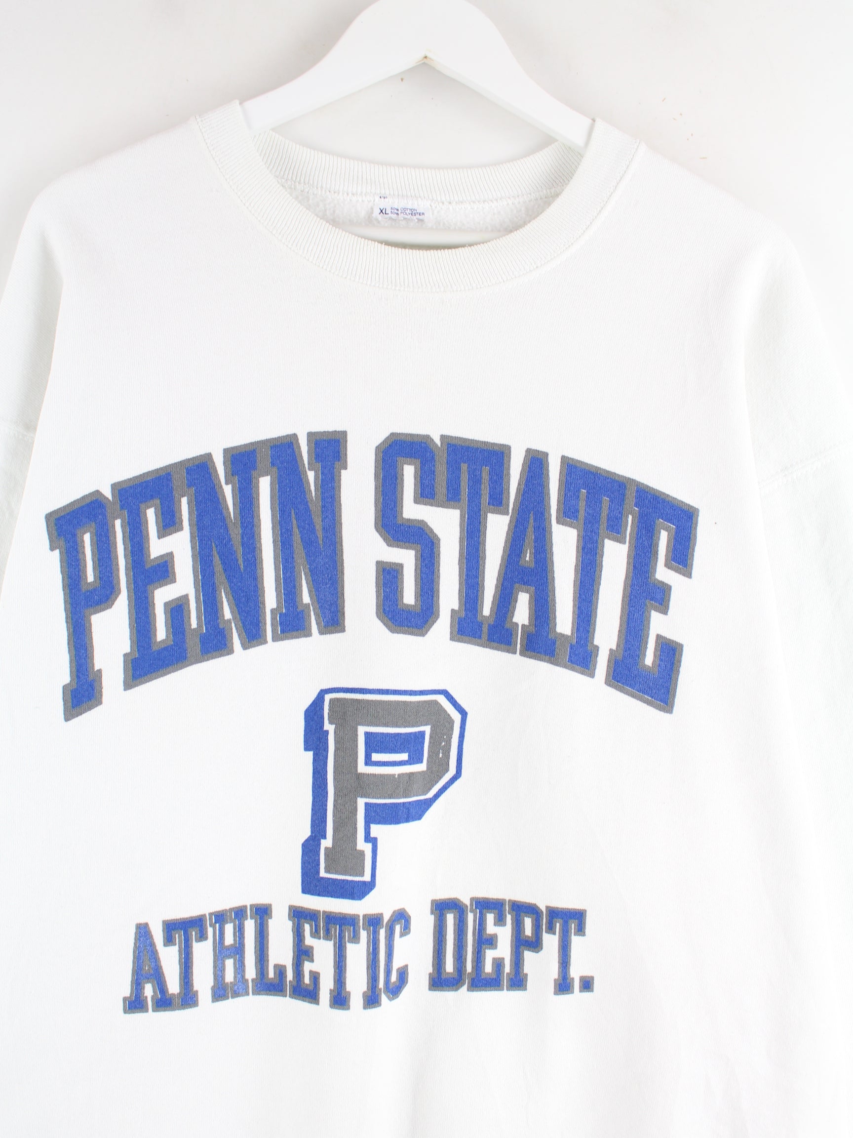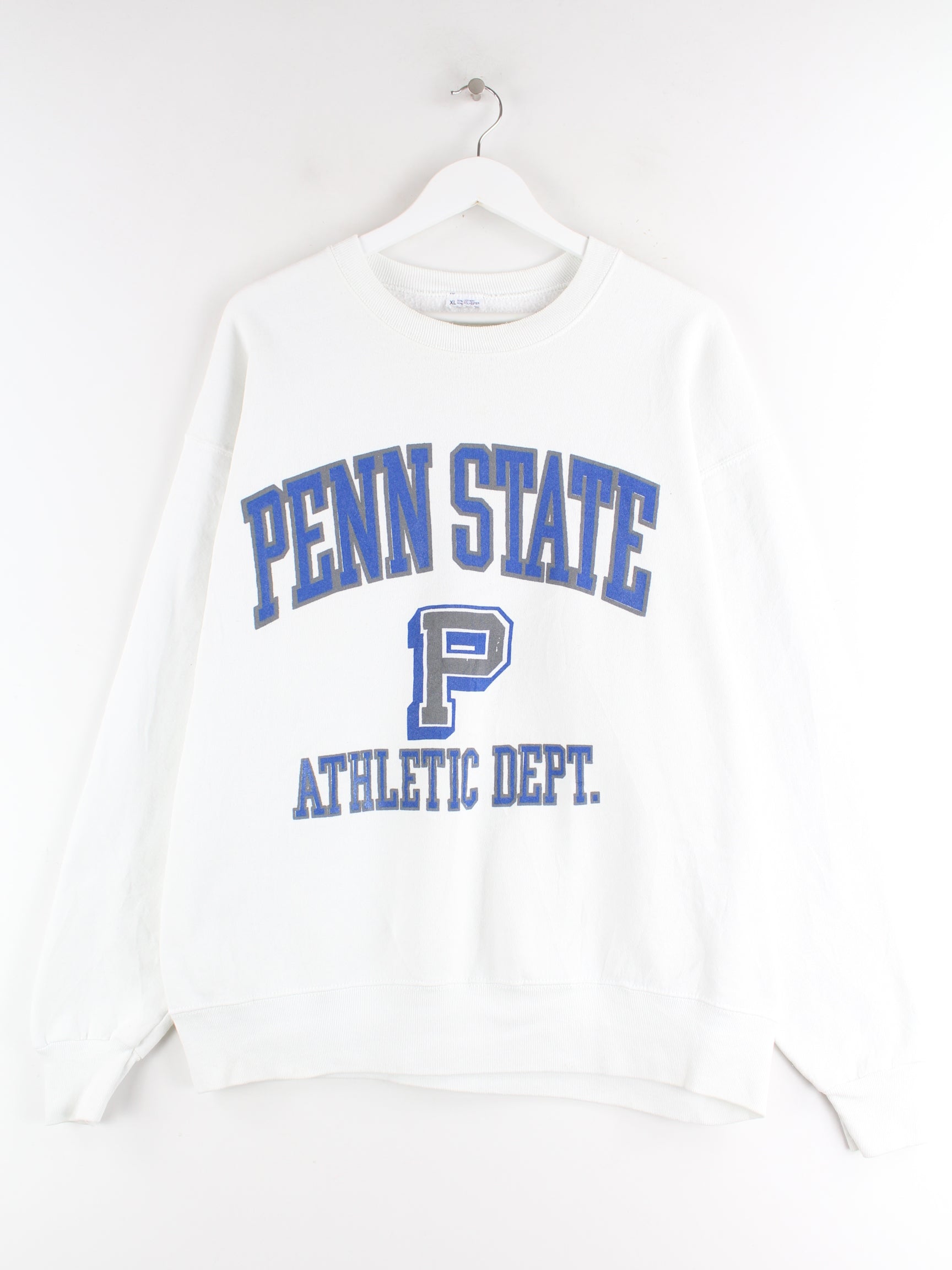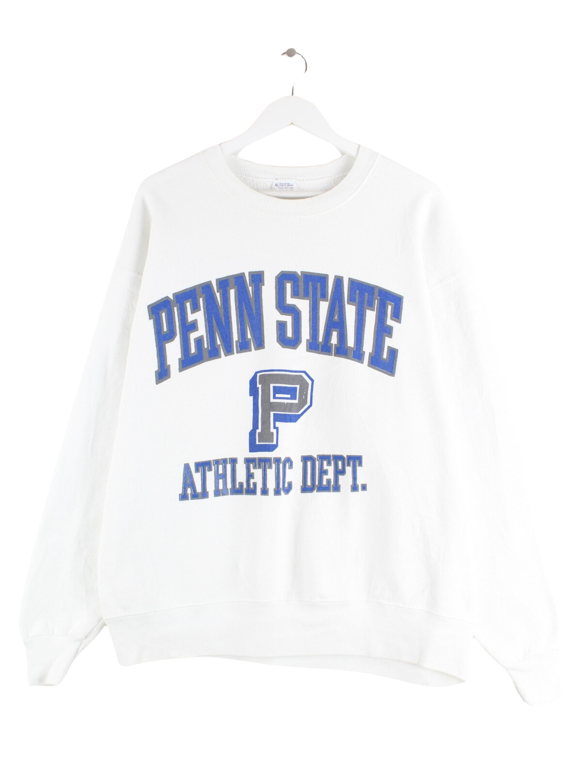 Weißer Vintage Sweater aus den 90'ern in Größe XL. Er ist aus einer Baumwollmischung angefertigt und in sehr gutem Zustand auf Lager. Mit schickem State Print.